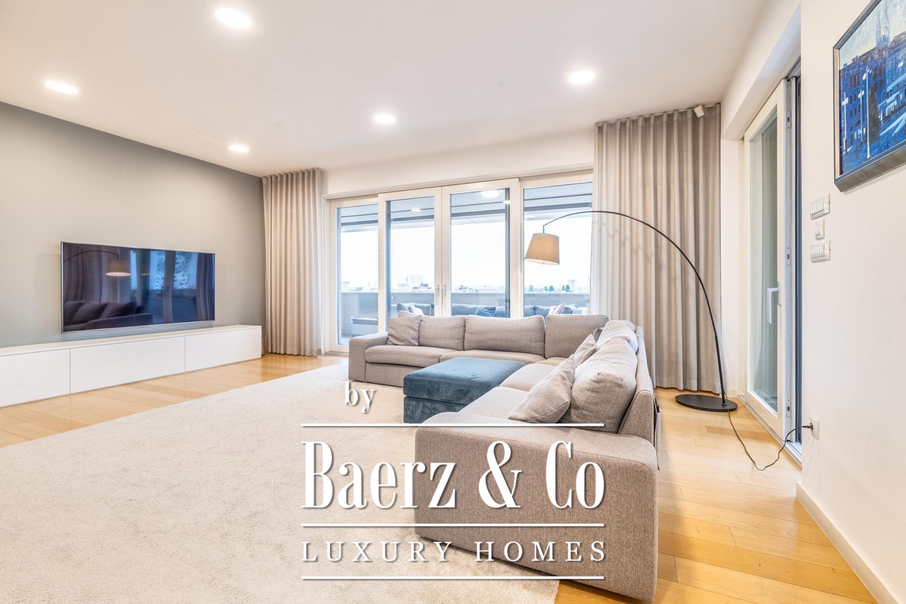 Apartment Črnomerec Zagreb stands in the VMD residential and business district, situated on Kuniščak Street. This four-bedroom apartment, completed in 2017, offers a total calculated surface of 193 m². Light permeates the spacious living area, where a kitchen and dining zone spanning 48 m² open to a covered terrace of 49.2 m², facing south and west for an open city view. The bedrooms are set to the east, separated for quietude, with the master suite featuring a walk-in wardrobe and en suite shower room. Three additional bedrooms, a bathroom with bathtub, laundry, and a guest toilet complete the private wing.
