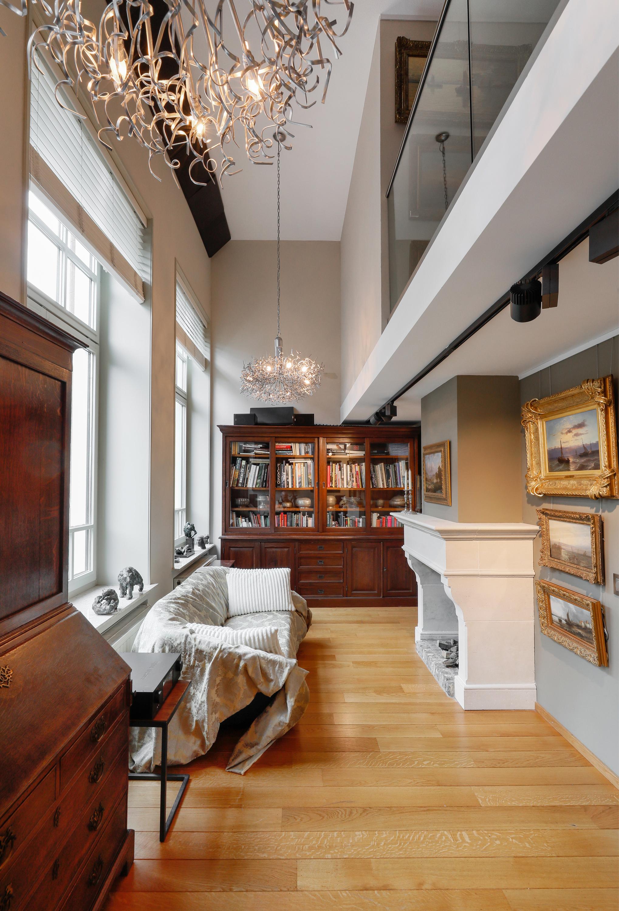 On the street side, you'll find the library. Here, too, a beautiful high ceiling. On a slightly cloudy day, it's bright here, but when the sun comes out, you'll be amazed. The abundant light can be tempered with wooden Jasno blinds. There's a beautiful classic fireplace with a bio-ethanol fire, connected to a central exhaust system via a damper. With a few adjustments, this library space could also be transformed into a fantastic bedroom. It's on the same level as the living area. But the house offers plenty of opportunities for long-term living for all ages and mobility levels.