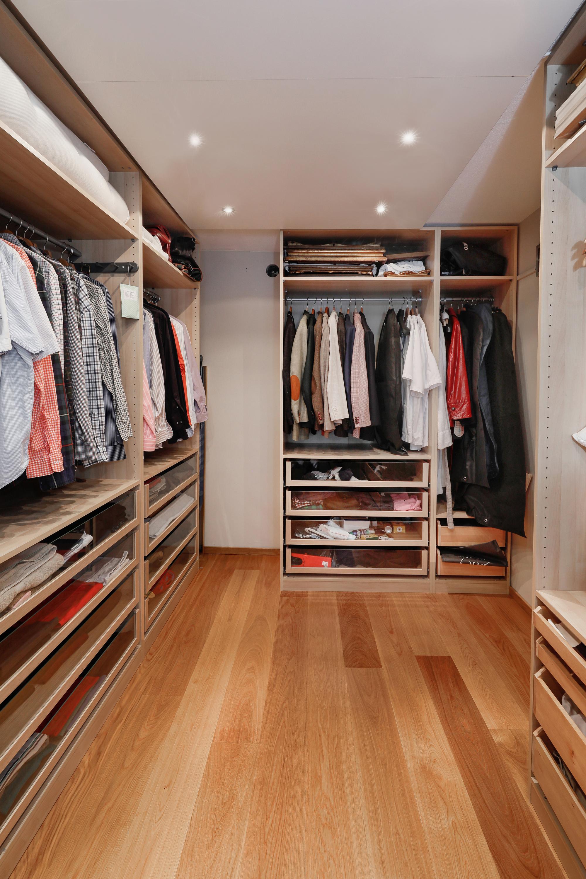The bedroom is designed so that you'll have everything you need right at your fingertips. Naturally, there's plenty of space for the bed and bedside tables. Through the sliding door into the living room and further through the tall windows in the living room, you have a beautiful view of the courtyard. The bathroom and walk-in dressing room are en suite to this bedroom. There's also plenty of room for a sofa and TV. The walk-in dressing room was created from an originally planned mezzanine. A truly wonderful and very rewarding space. The dressing room is fully equipped for organized and practical storage of all your clothes.