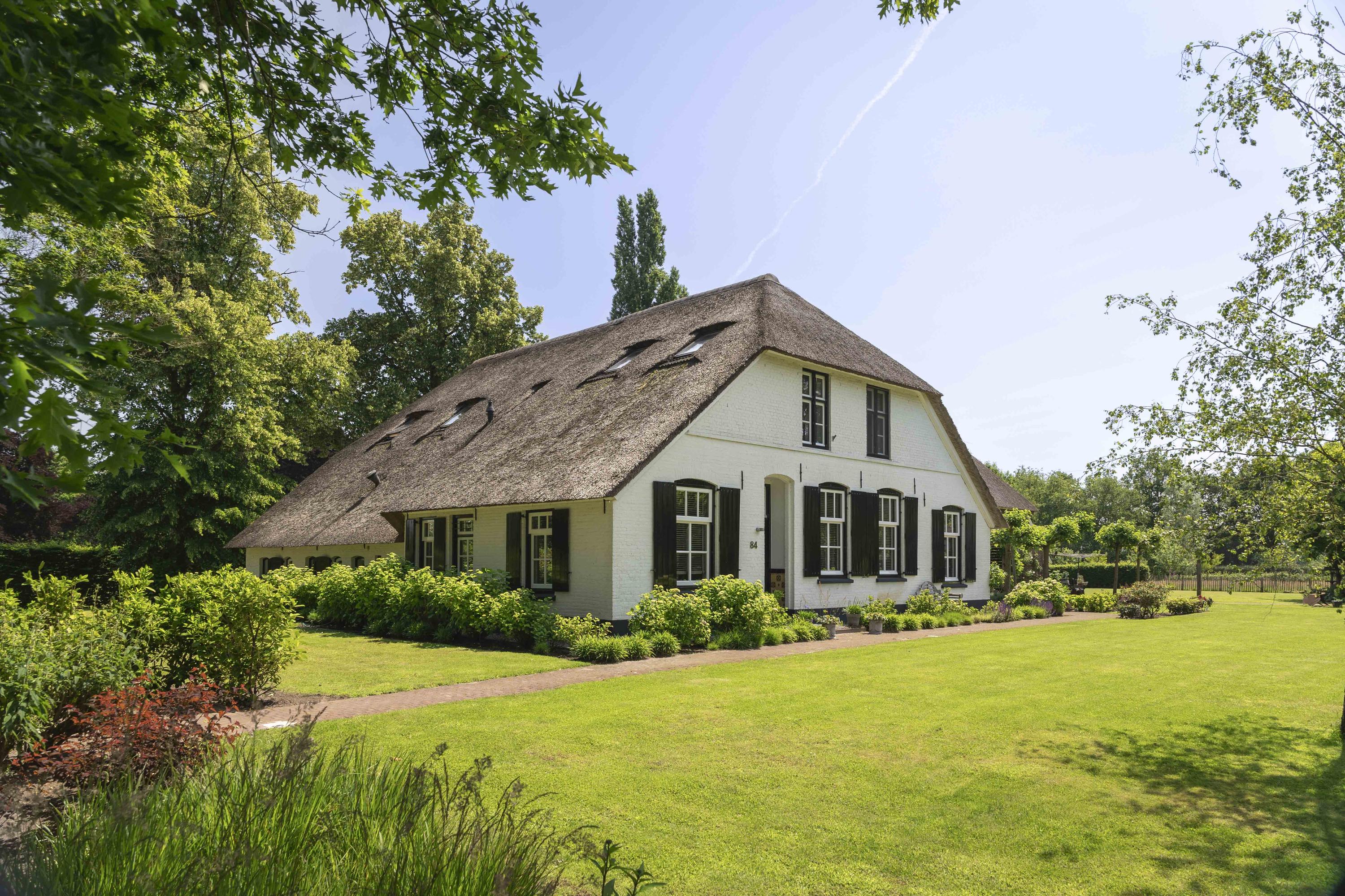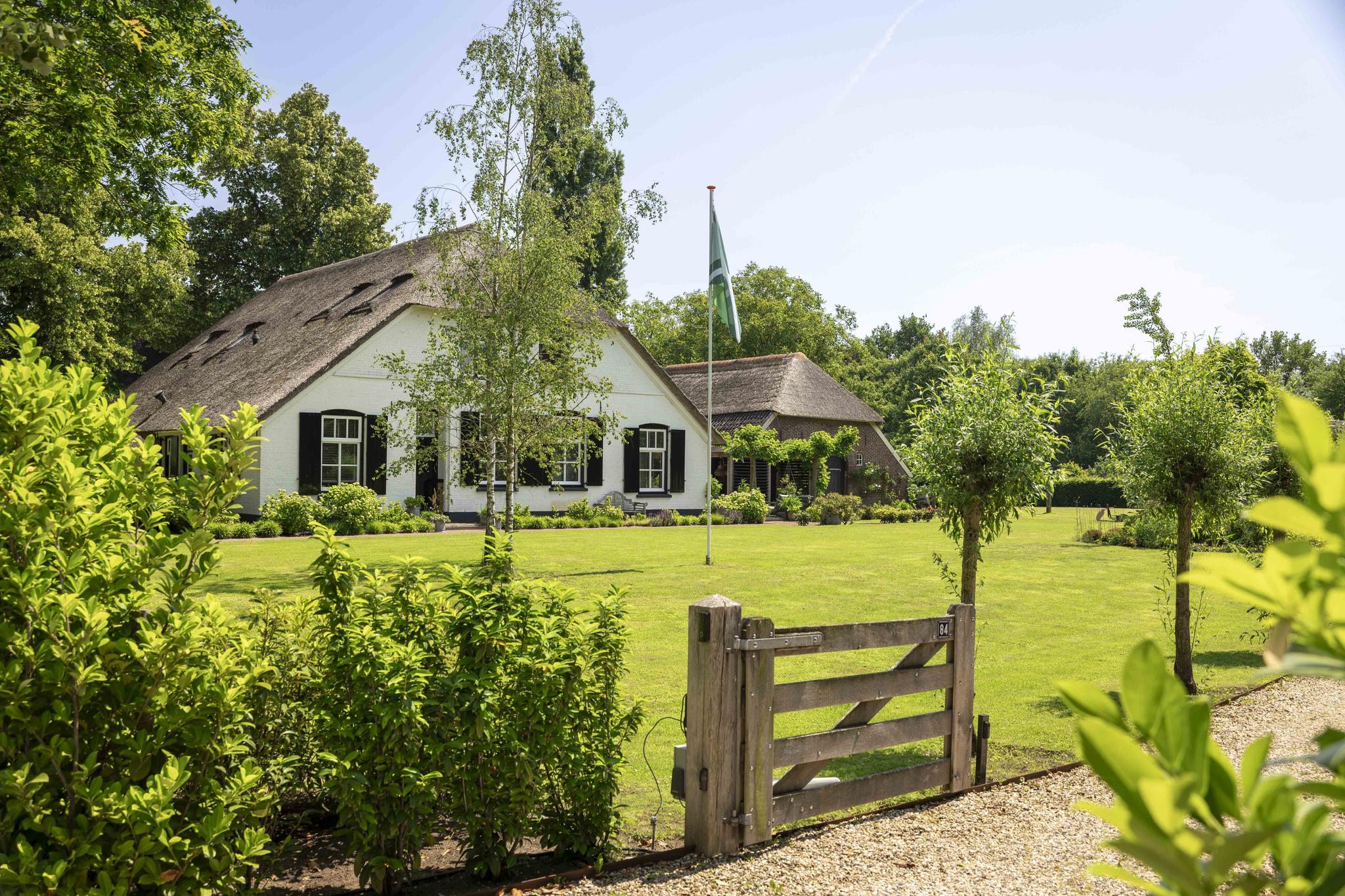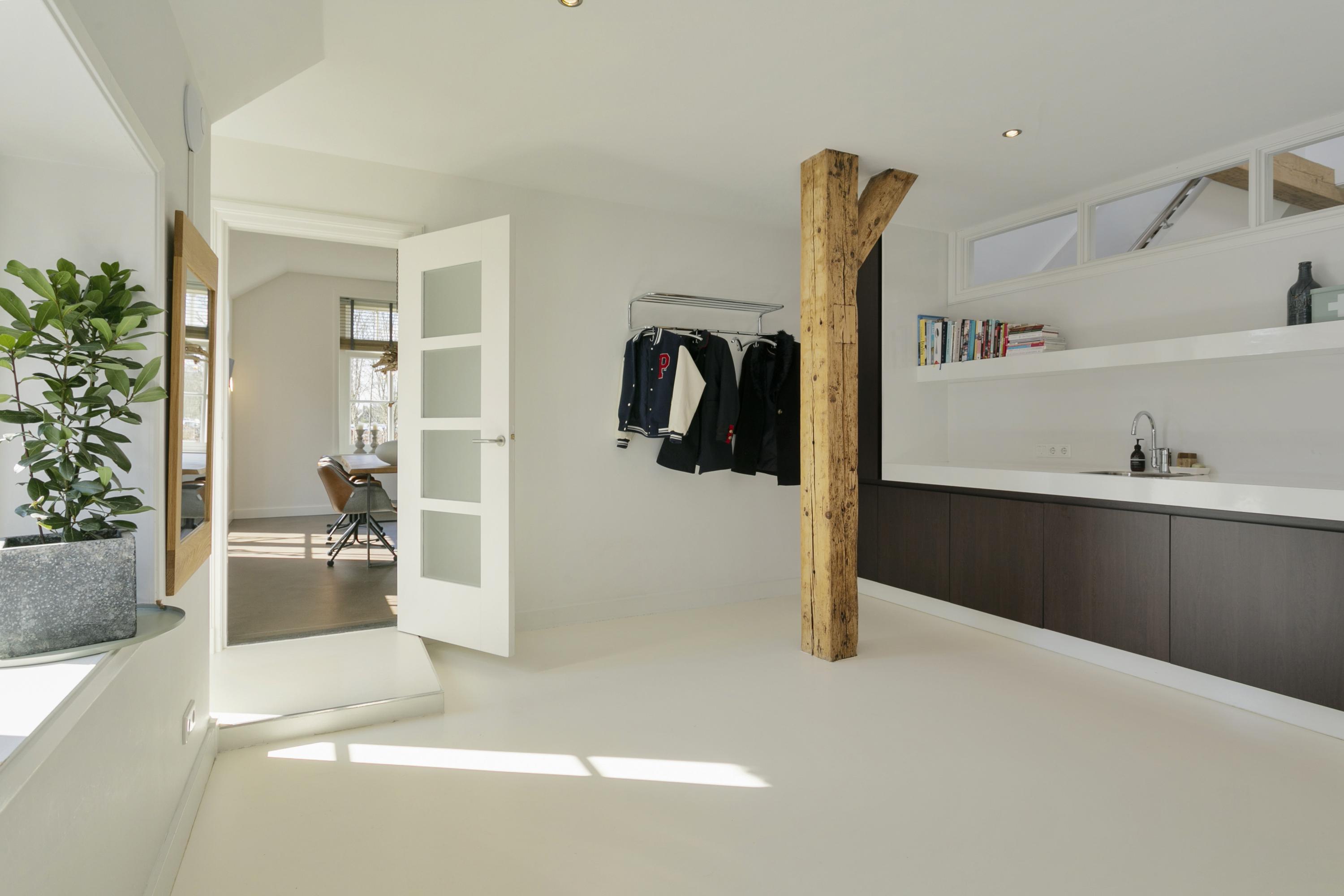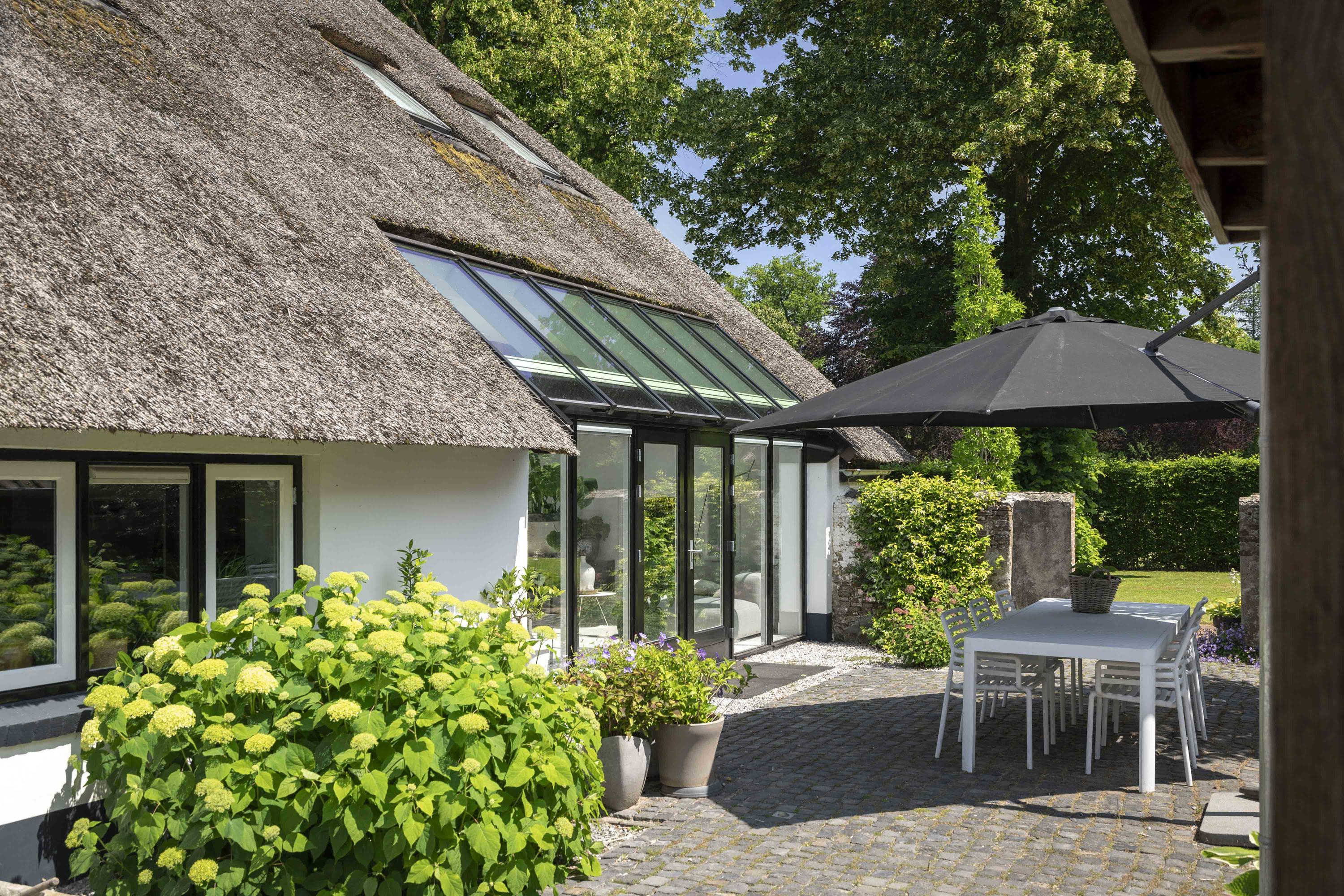 The white facades and the large thatched roof are the first things one sees when driving in from the Laren side. A classic beauty it is, number 84, located just about at the head of the dike. The gate opens automatically and under the tires the gravel path crunches as you drive up the generous driveway here. A place that captures the imagination, that inspires. This is reflected in the phenomenal interior, because inside the home surprises with contemporary and innovative design.