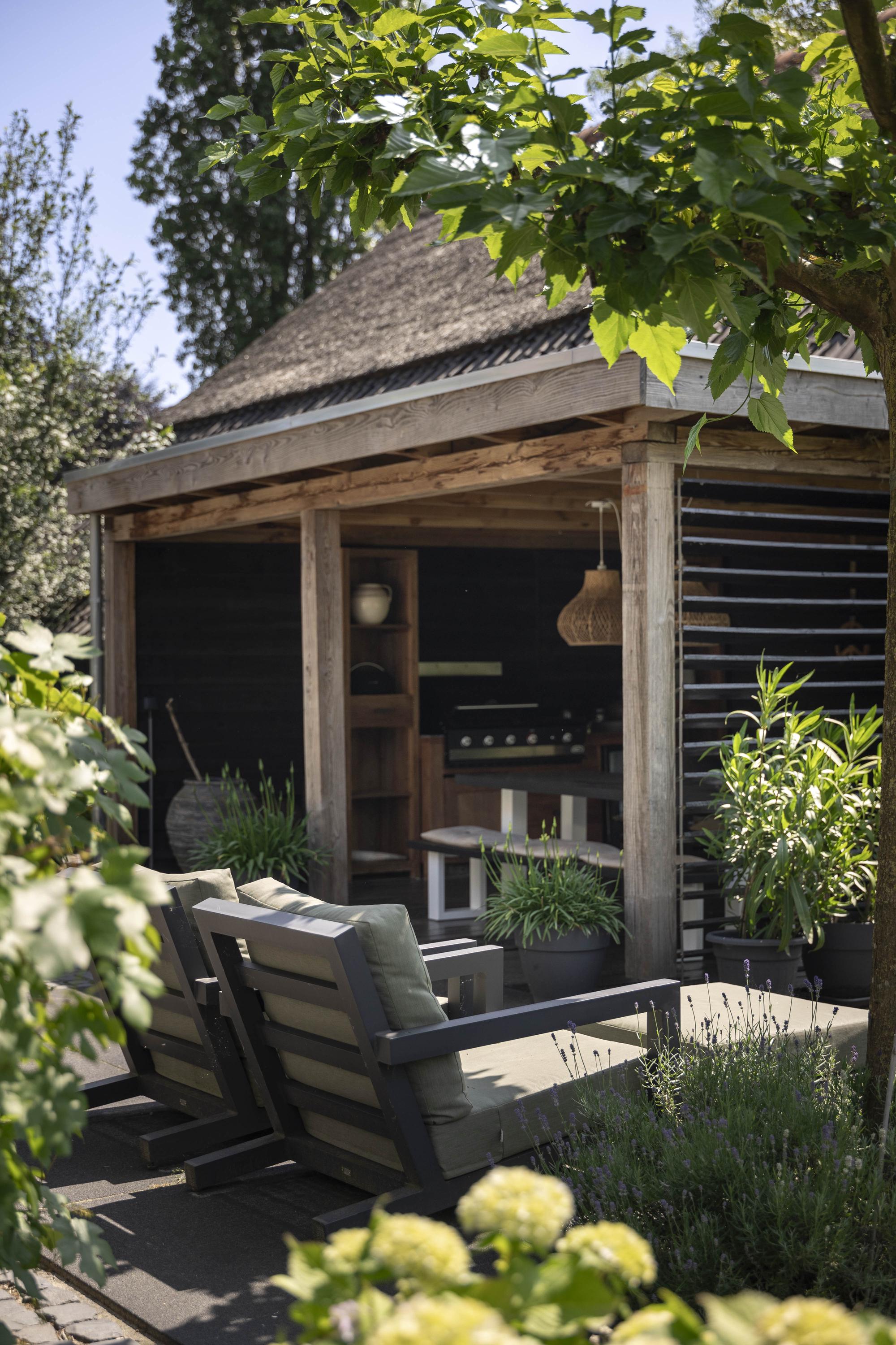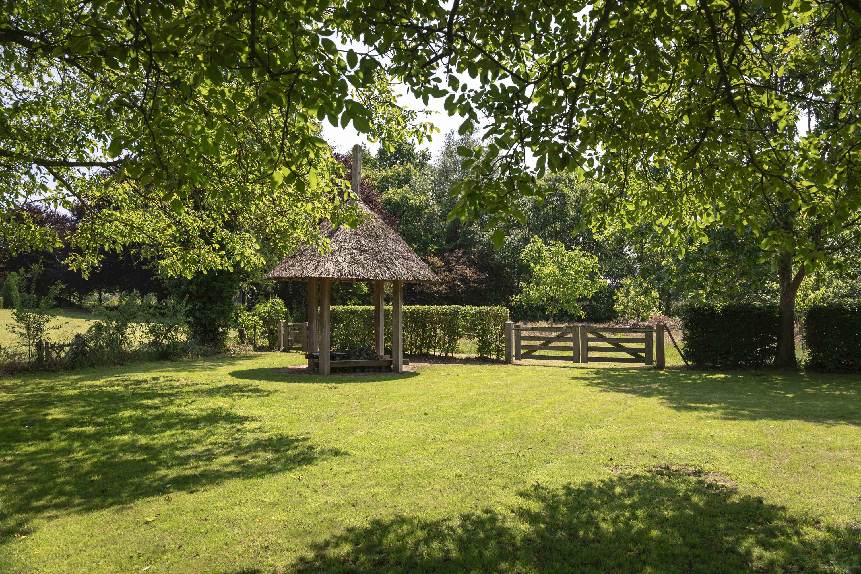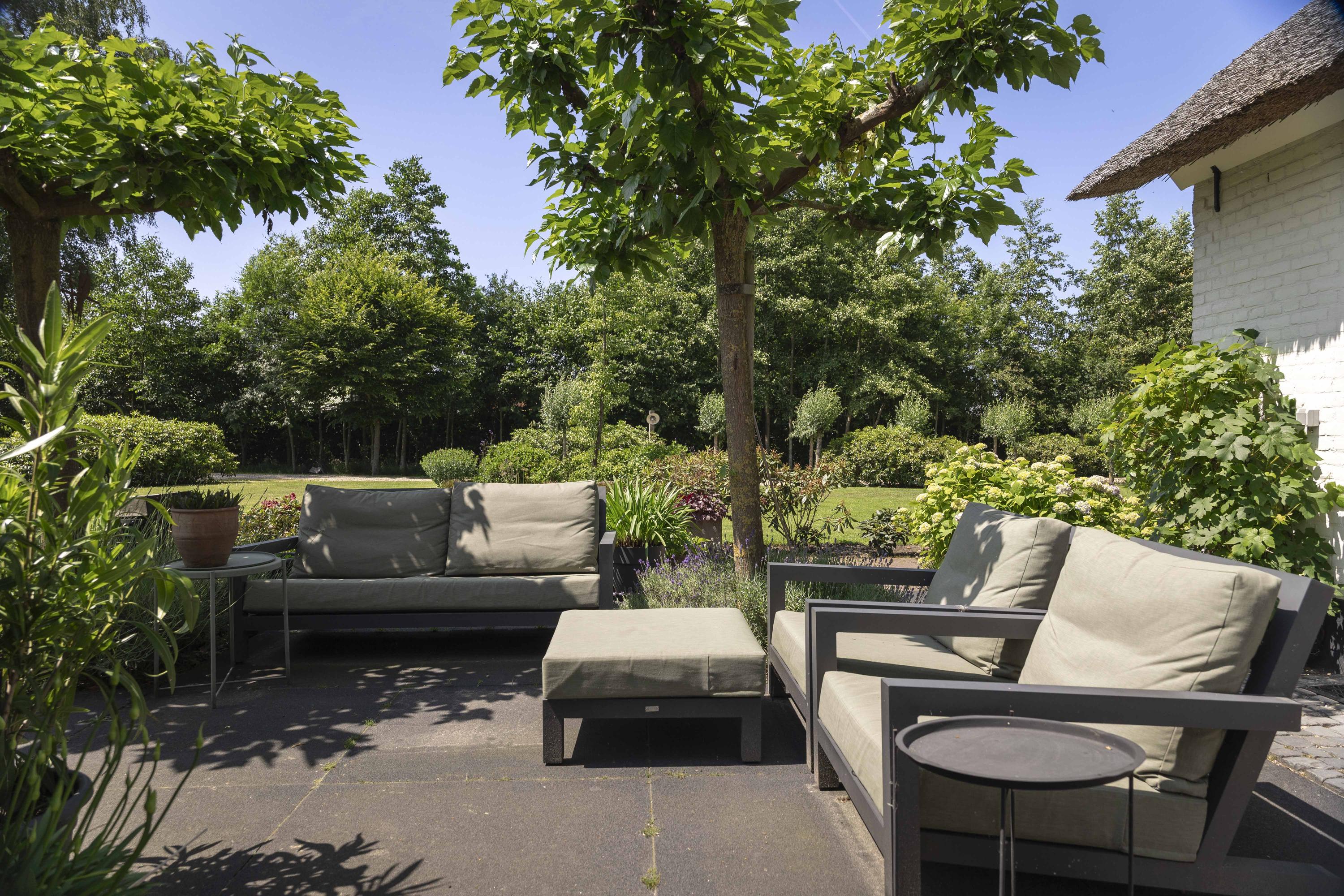 The sunshine is ideal; the backyard faces perfectly south. Behind the house, accessible from the living room, kitchen and utility room, the lovely sun terrace. Under the canopy is a lounge area furnished with a loam stove.