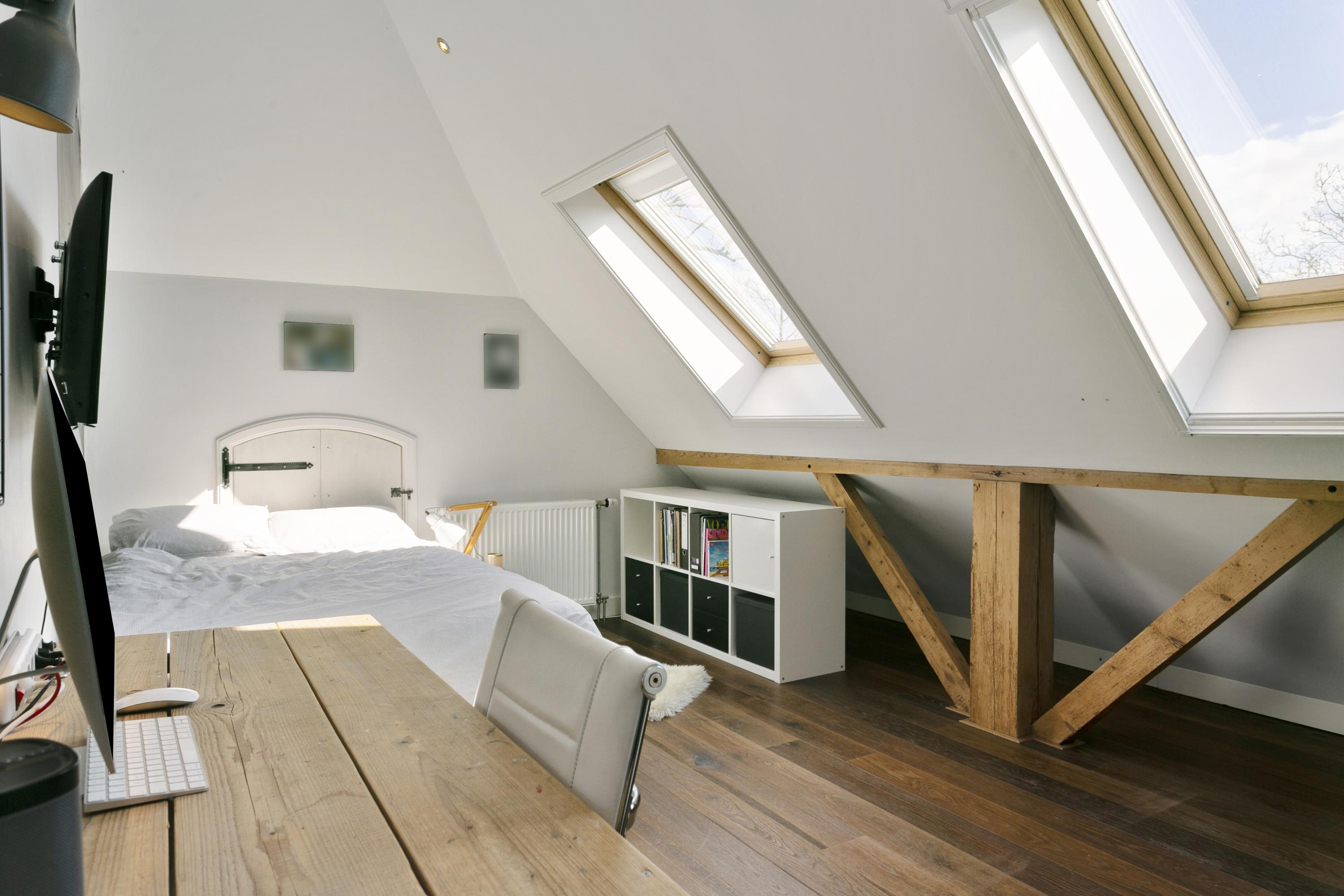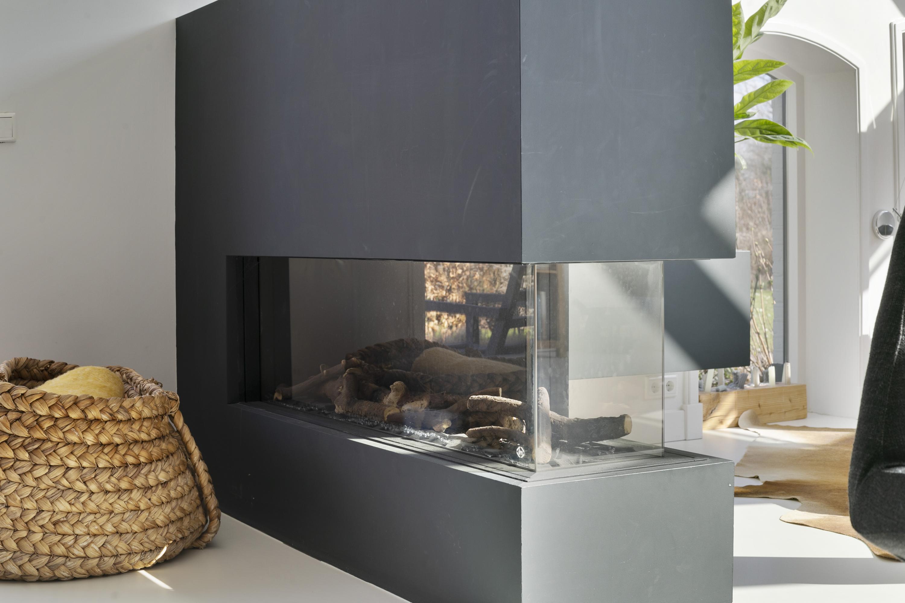 The former part is now a spacious living space (70 m²). On the south side, both the visible part of the roof and the walls are filled with glass, so the space is bathed in natural light. On the floor is a light cast floor, which works perfectly with the underfloor heating. The eye-catcher in the room is the fireplace behind glass, which with one button ensures that a pleasant fire burns.