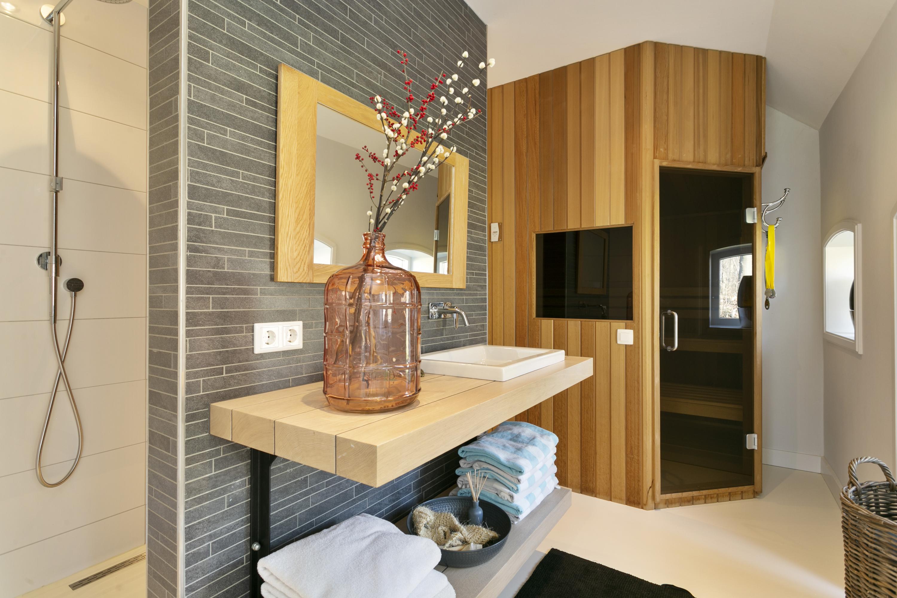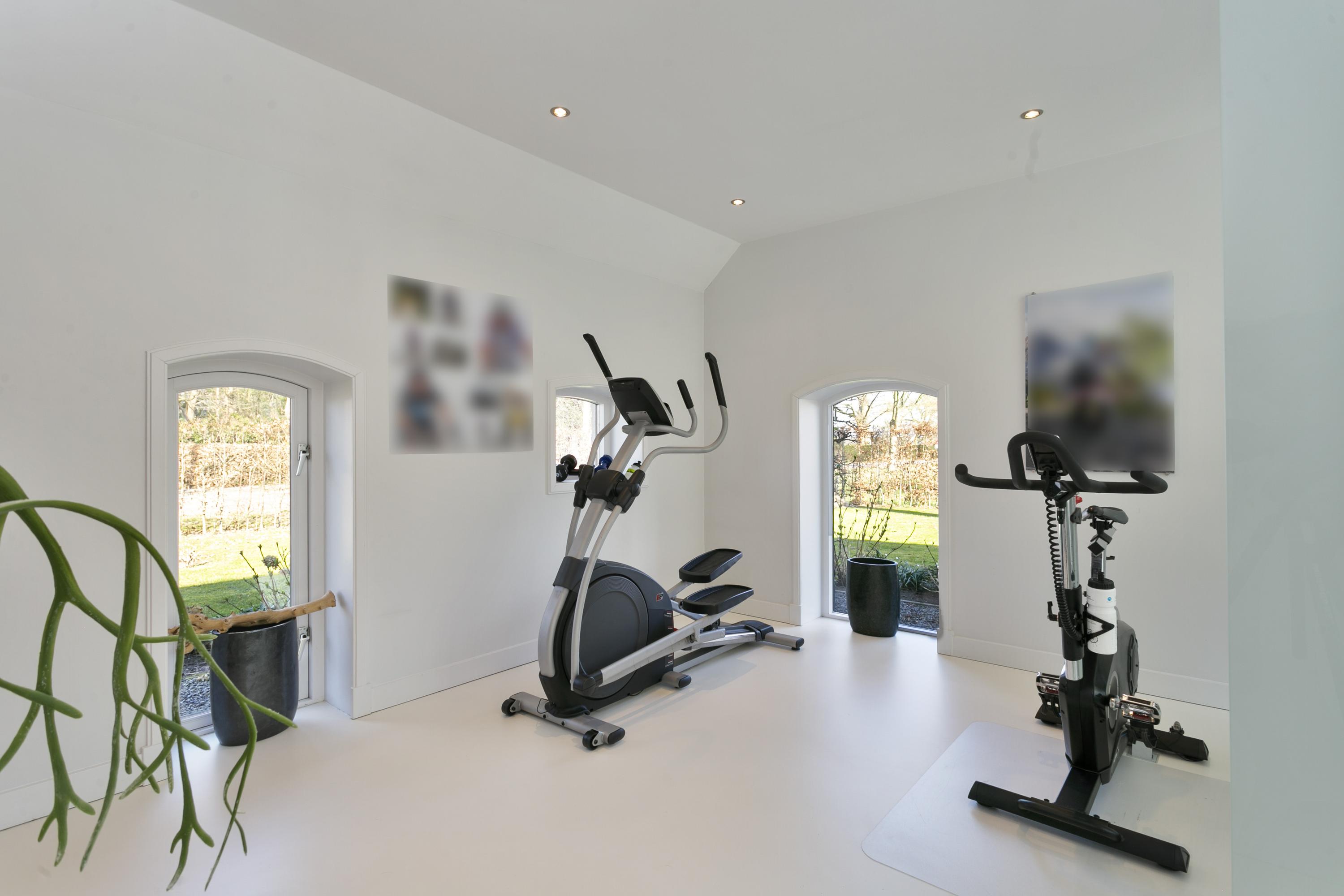 At the front of the house on the left, the gym and wellness; a beautiful bathroom with double showers, sink and Finnish sauna (6-person)