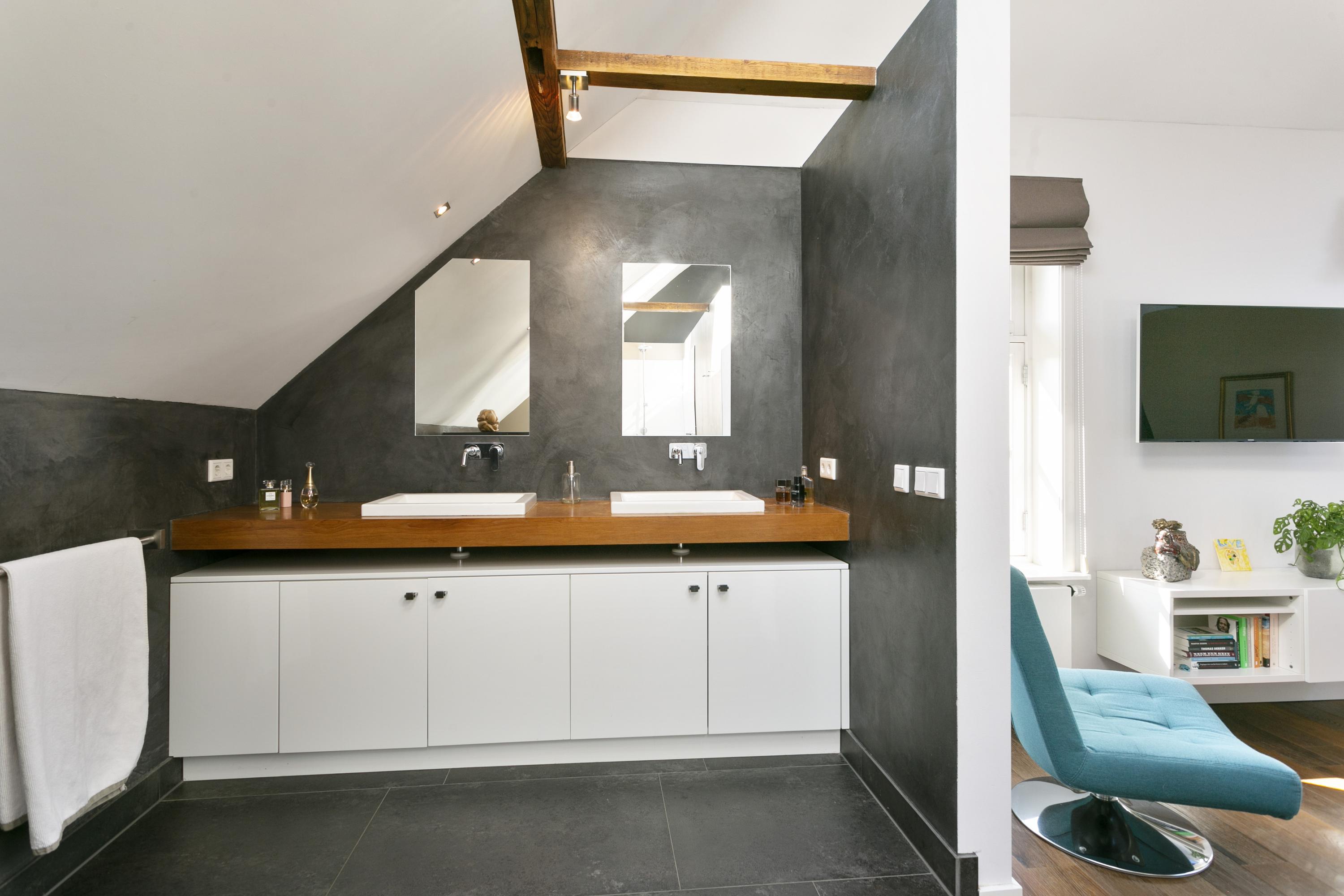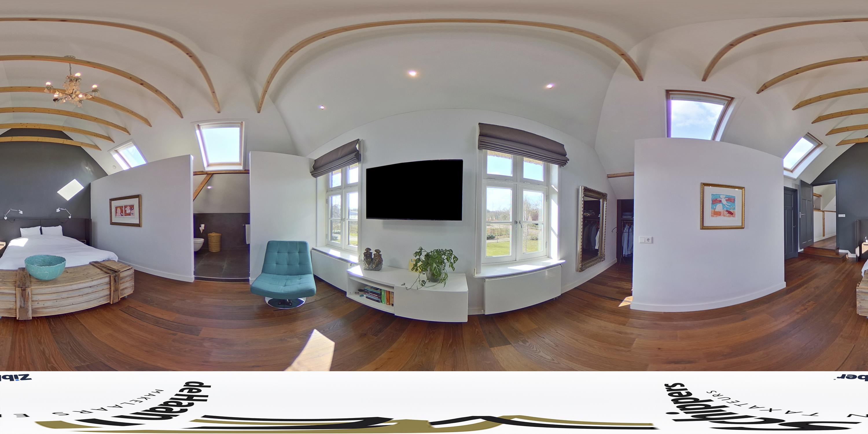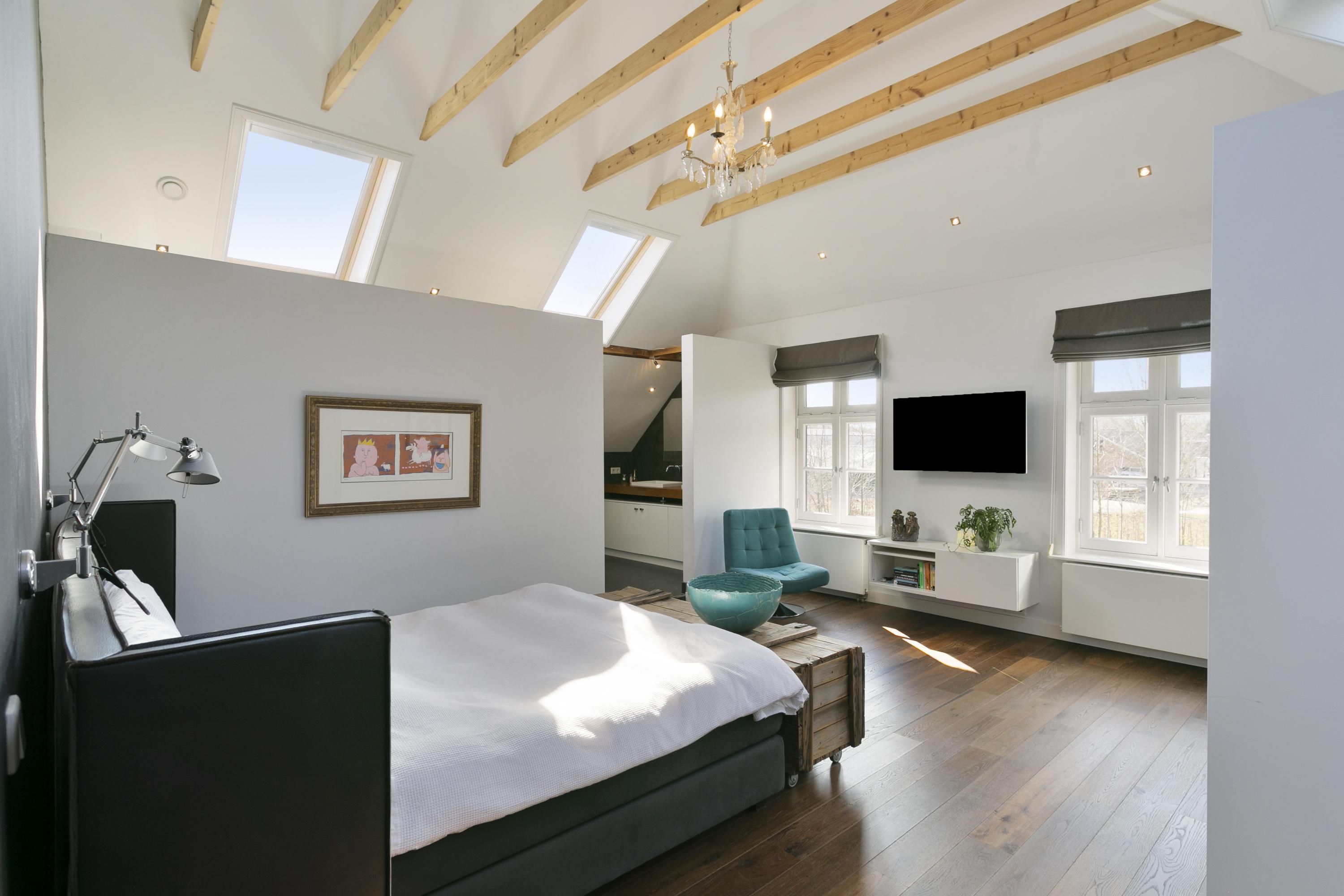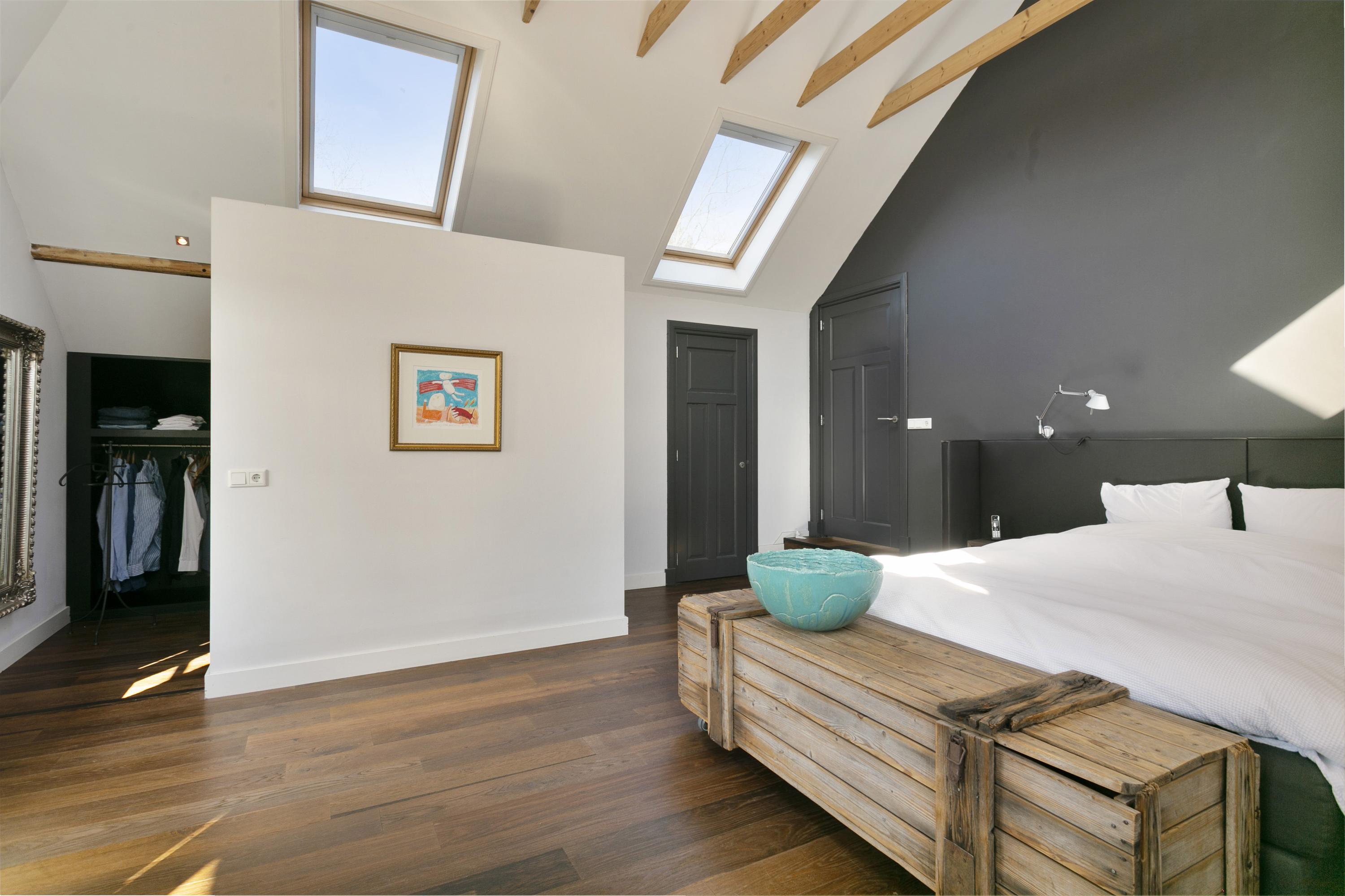 To the right is the master bedroom (50 m²), with a spacious walk-in closet and a beautiful bathroom with bathtub, WC, 2 sinks and walk-in shower. On both sides lots of extra storage space.