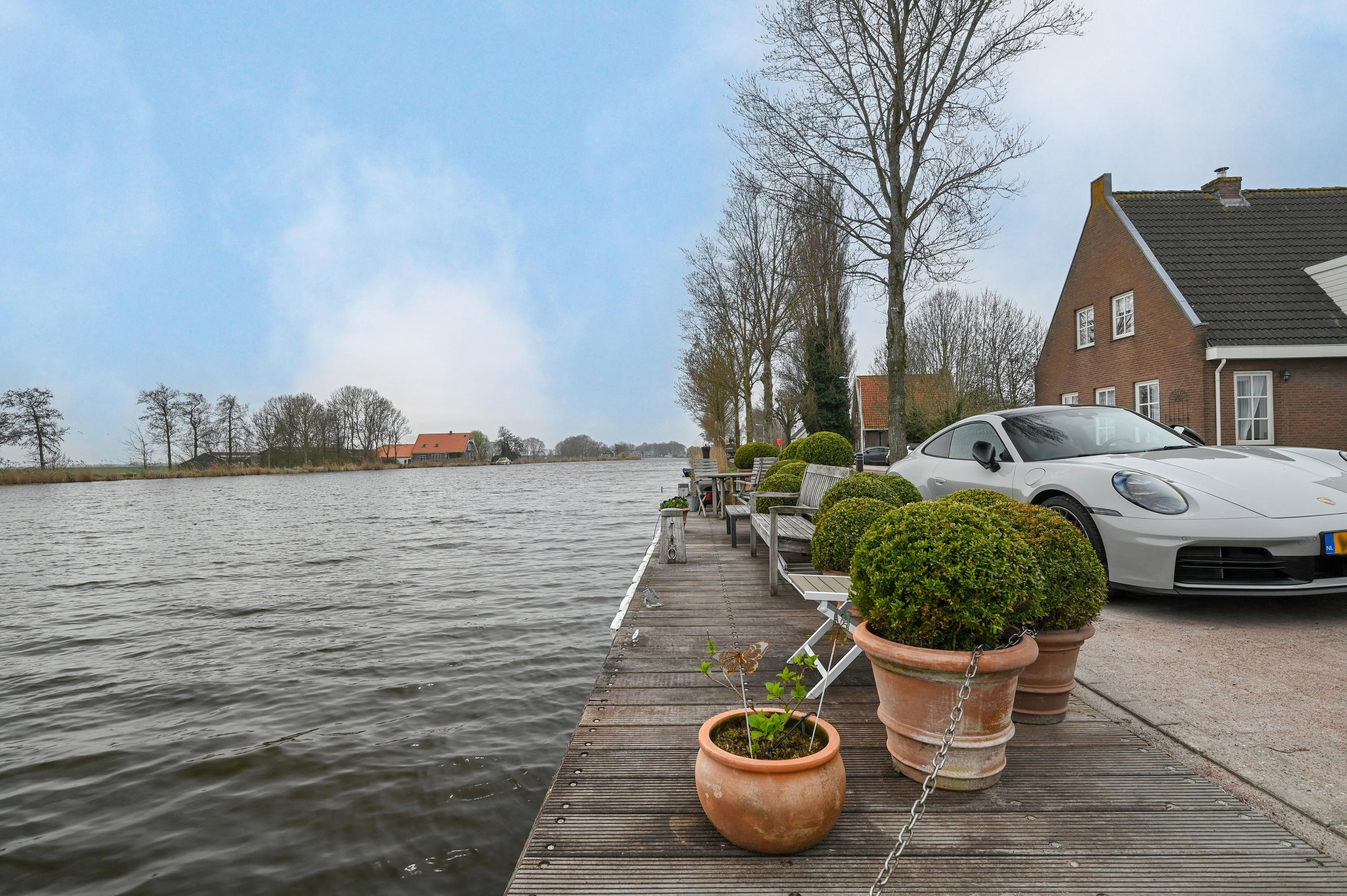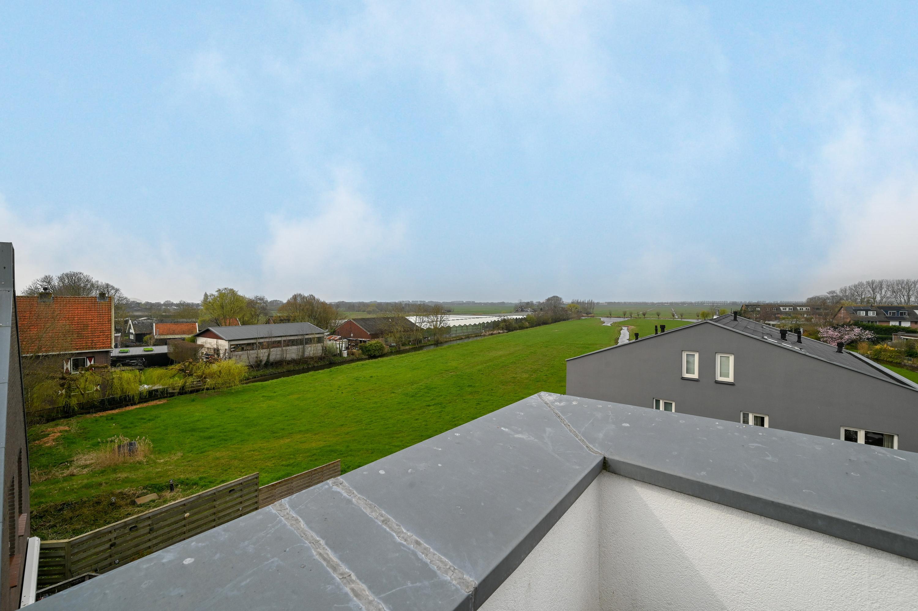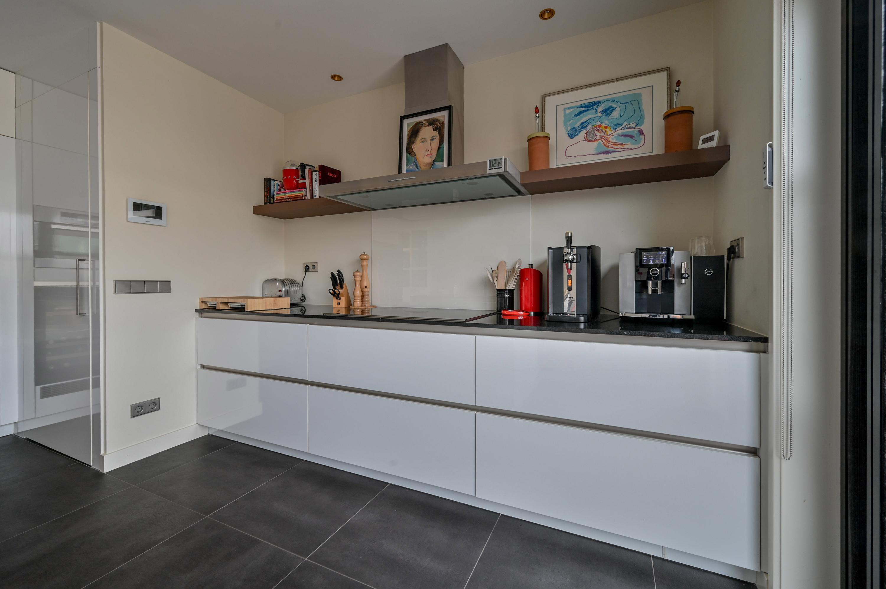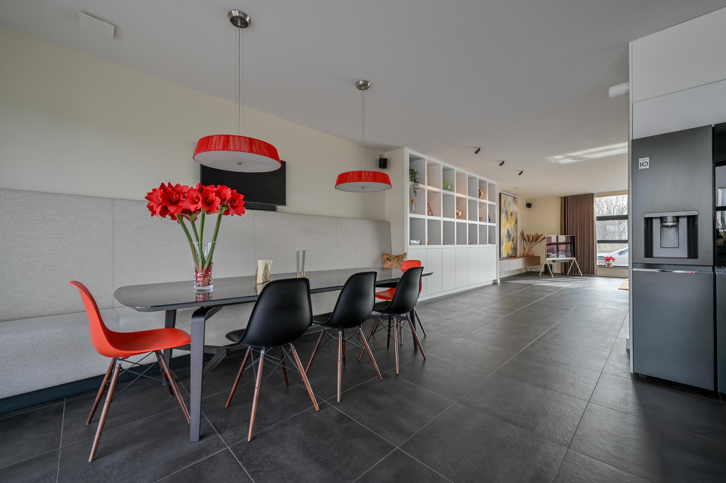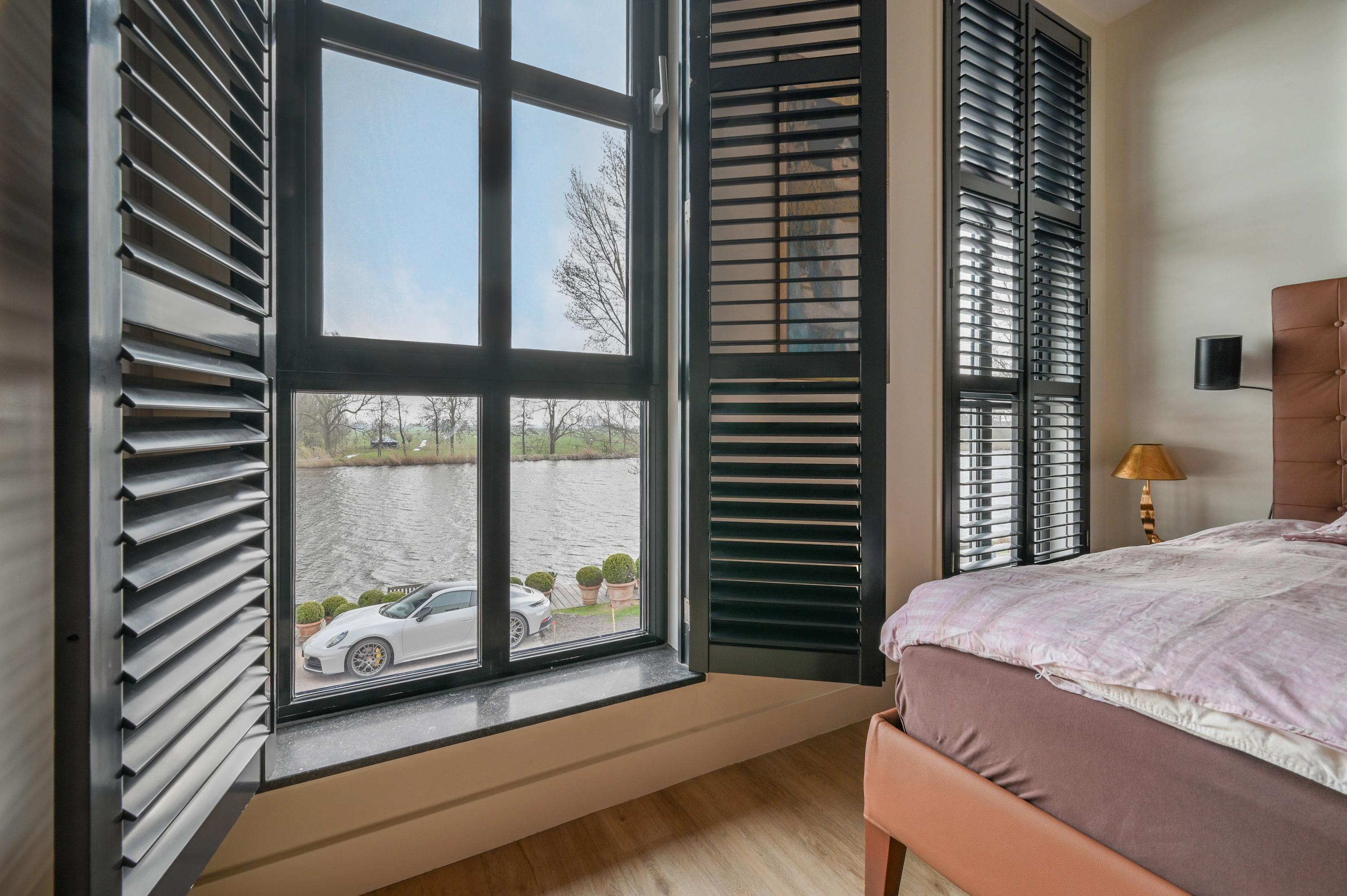 The second floor reveals a rooftop terrace with unobstructed views over the Amstel and polder, enriched by a pergola, integrated lighting, and water connection, creating an inviting setting for quiet reflection or hosting guests. Beneath the house, the garage is configured as a versatile studio, complete with kitchen, toilet, underfloor heating, and air conditioning, accessible via both the terrace and an electric entry.