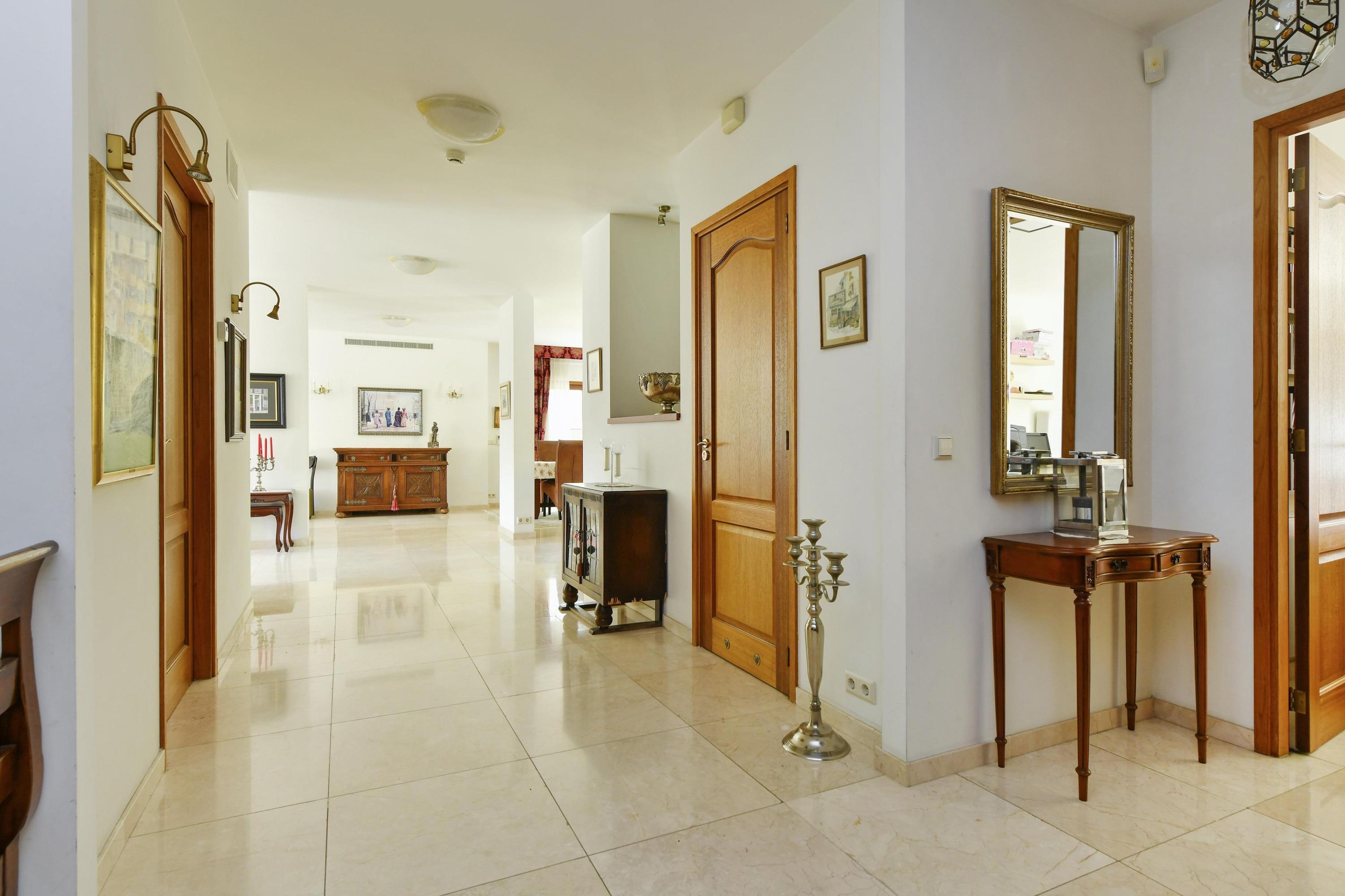 The open kitchen is equipped with built-in appliances. Its spacious and open design creates an inviting living area where cooking, dining and spending time together blend seamlessly.