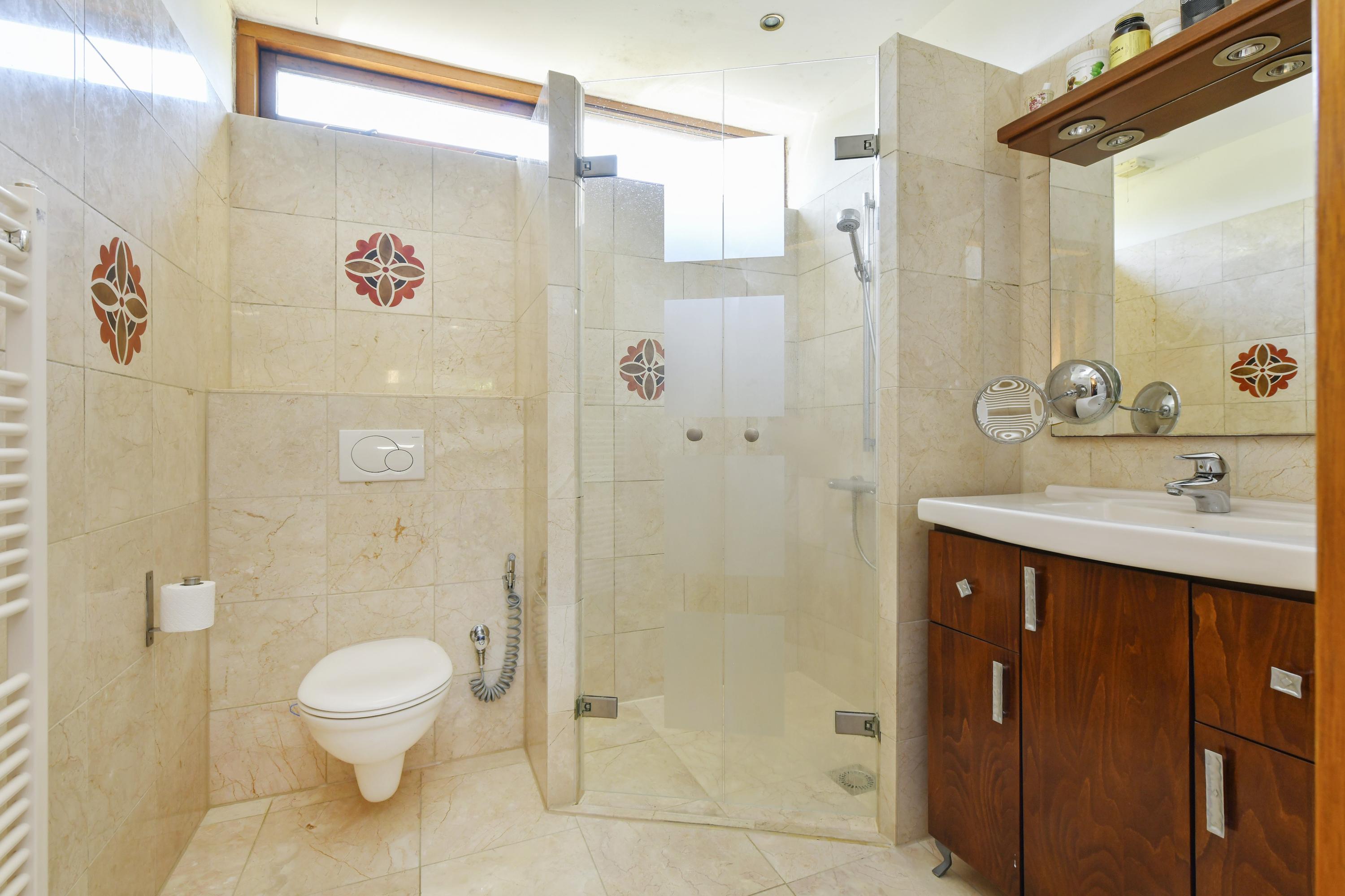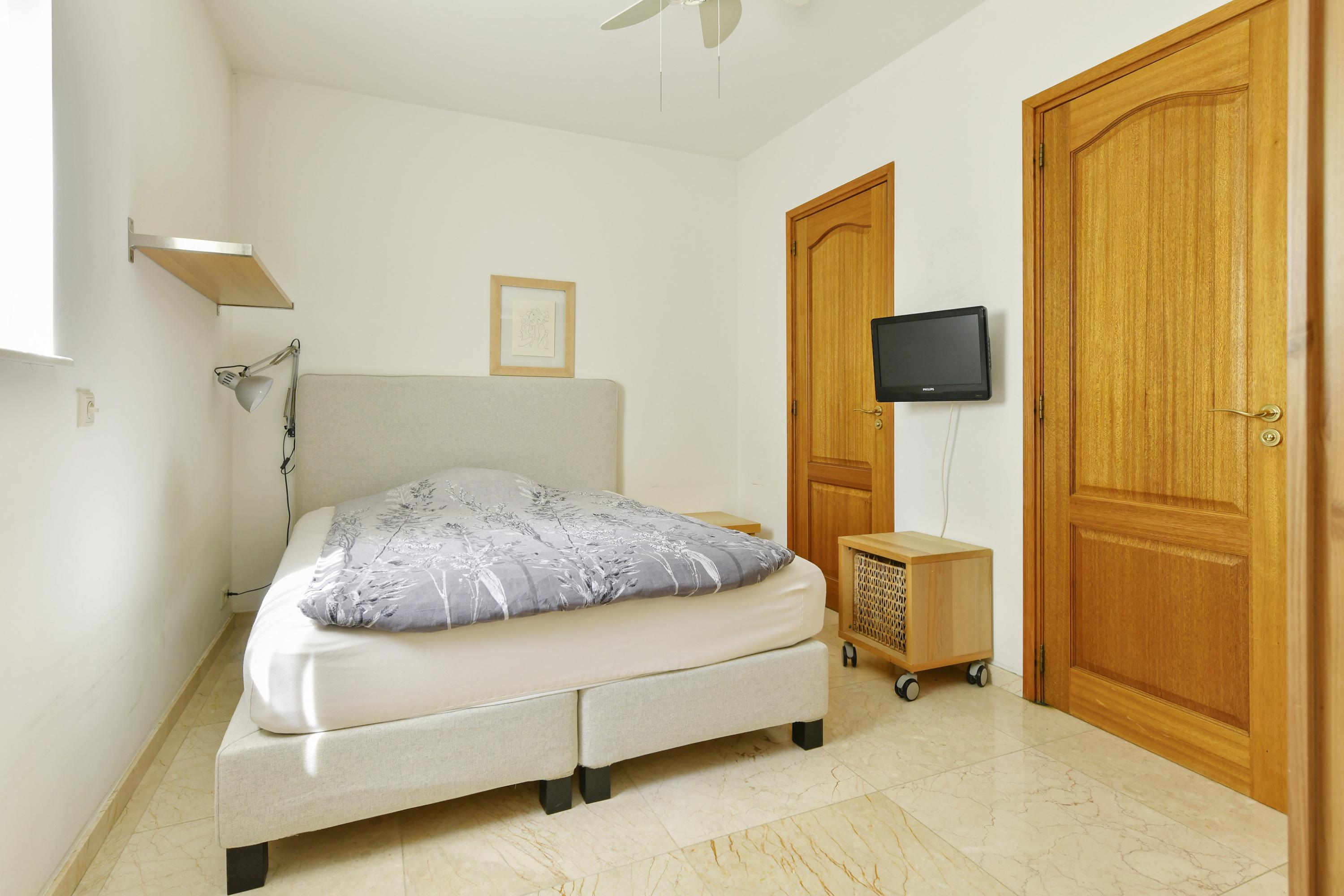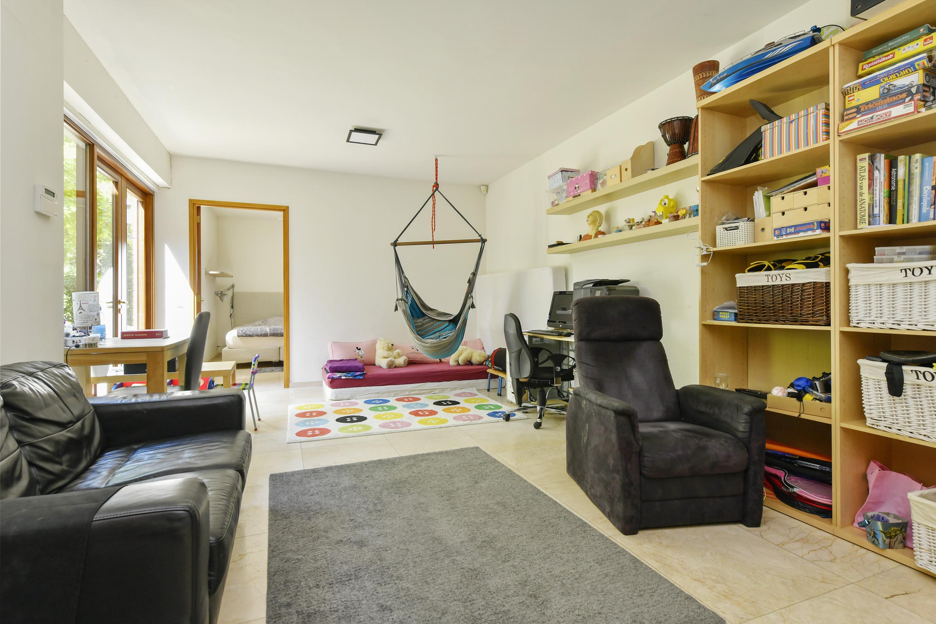 Adjacent to the living room is a practical utility room with extra storage and connections for a washing machine and dryer. On the other side of the house is an intermediate room with access to a bedroom with its own bathroom, fitted with a washbasin unit, shower and separate toilet. This space is ideal for guests, an au pair, or can be used as a work or study room. There is also a separate storage room accessible from the garden.
