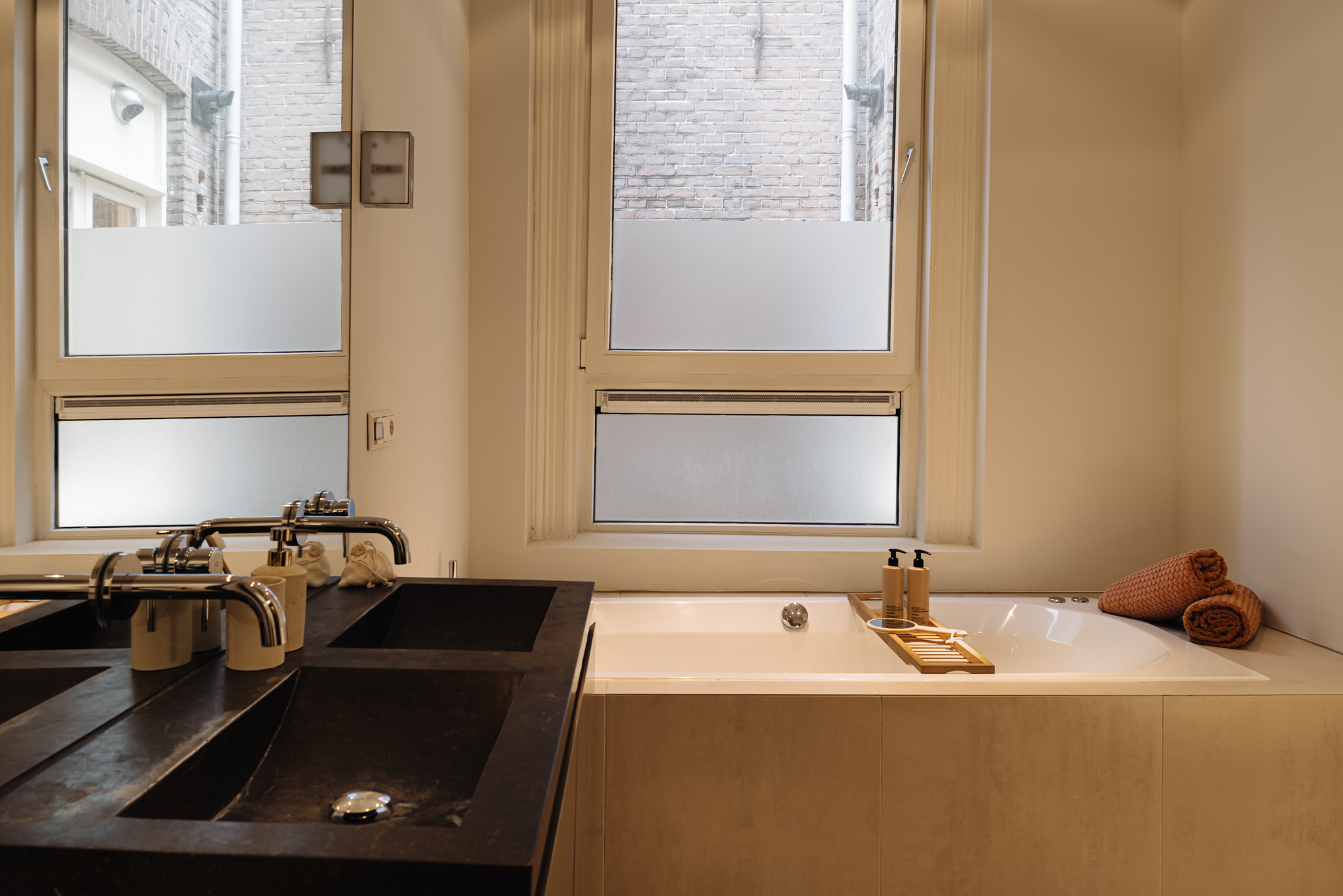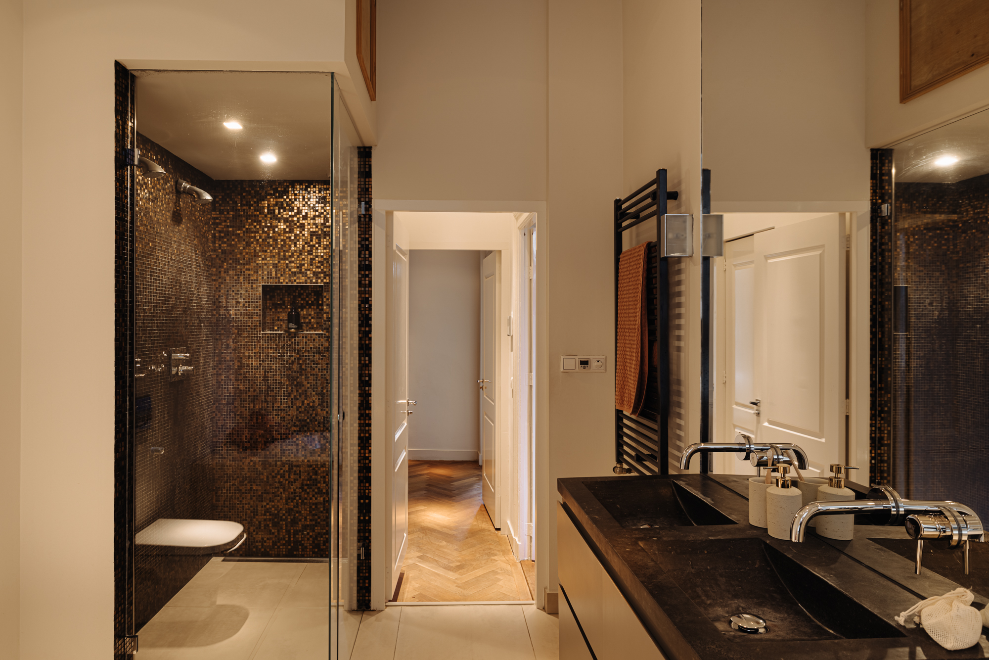 The bathroom on this level is dark and refined, fully equipped with a double vanity, bathtub, double shower and toilet. The combination of natural stone and mosaic tiles creates a warm and relaxing atmosphere.