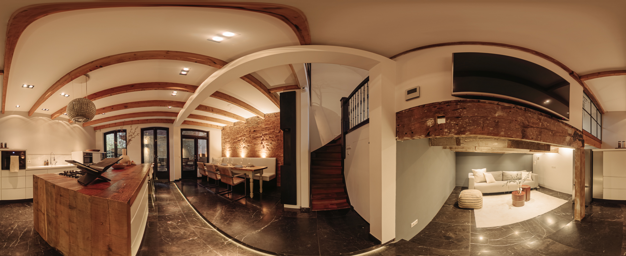 The entrance is located on the ground floor. Upon entering, you step into a beautifully designed hallway where the character and refined style of the home immediately become visible. The high ceilings, warm tones, thoughtful lighting, ceiling ornaments and classic details create a welcoming atmosphere that almost makes you forget you are in the centre of the city.