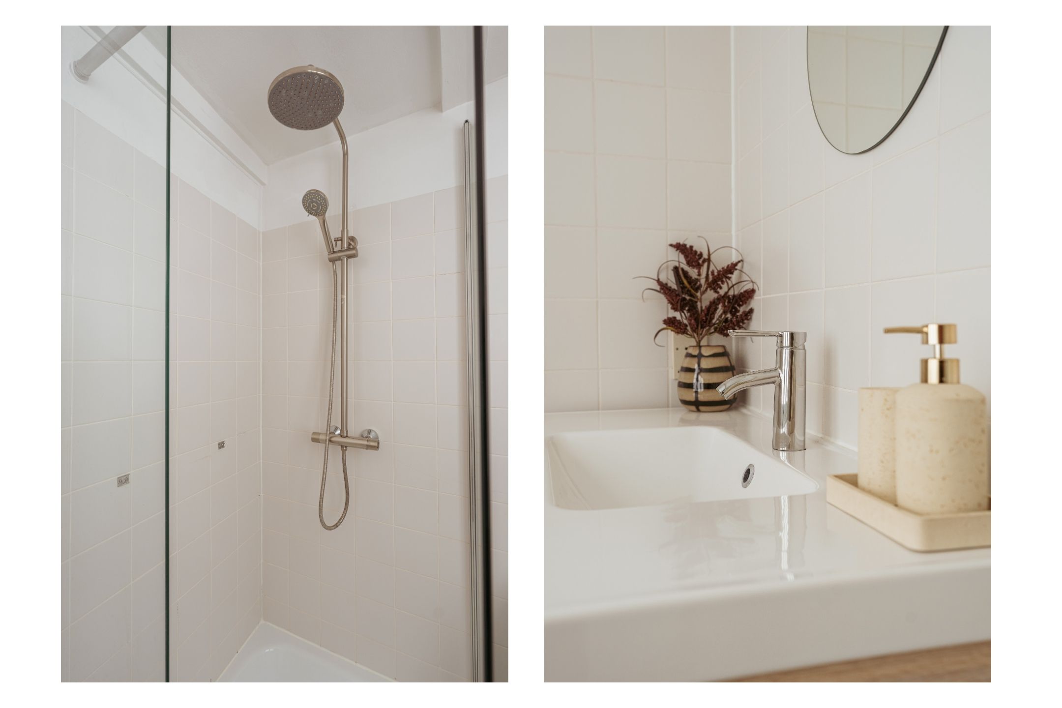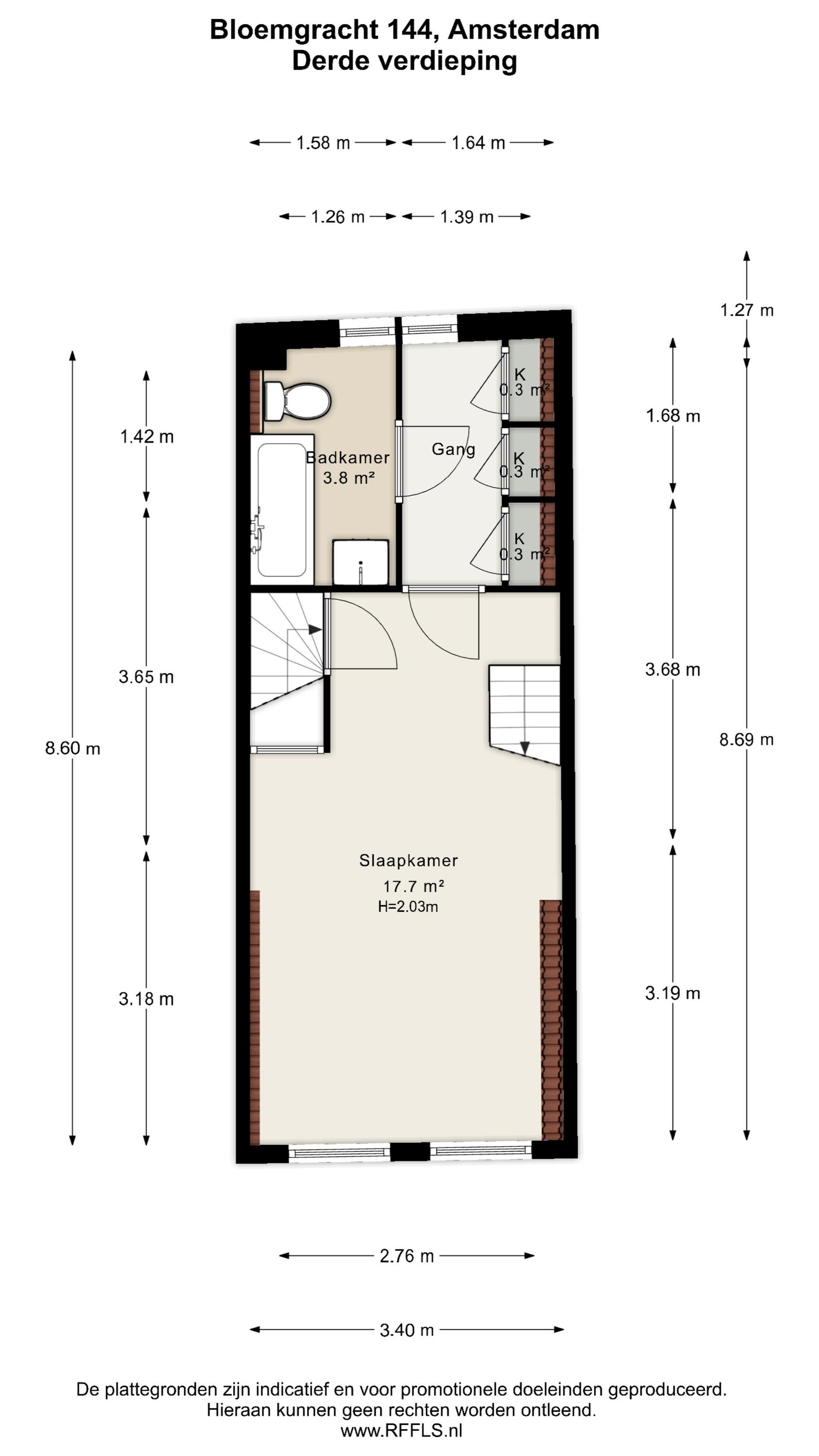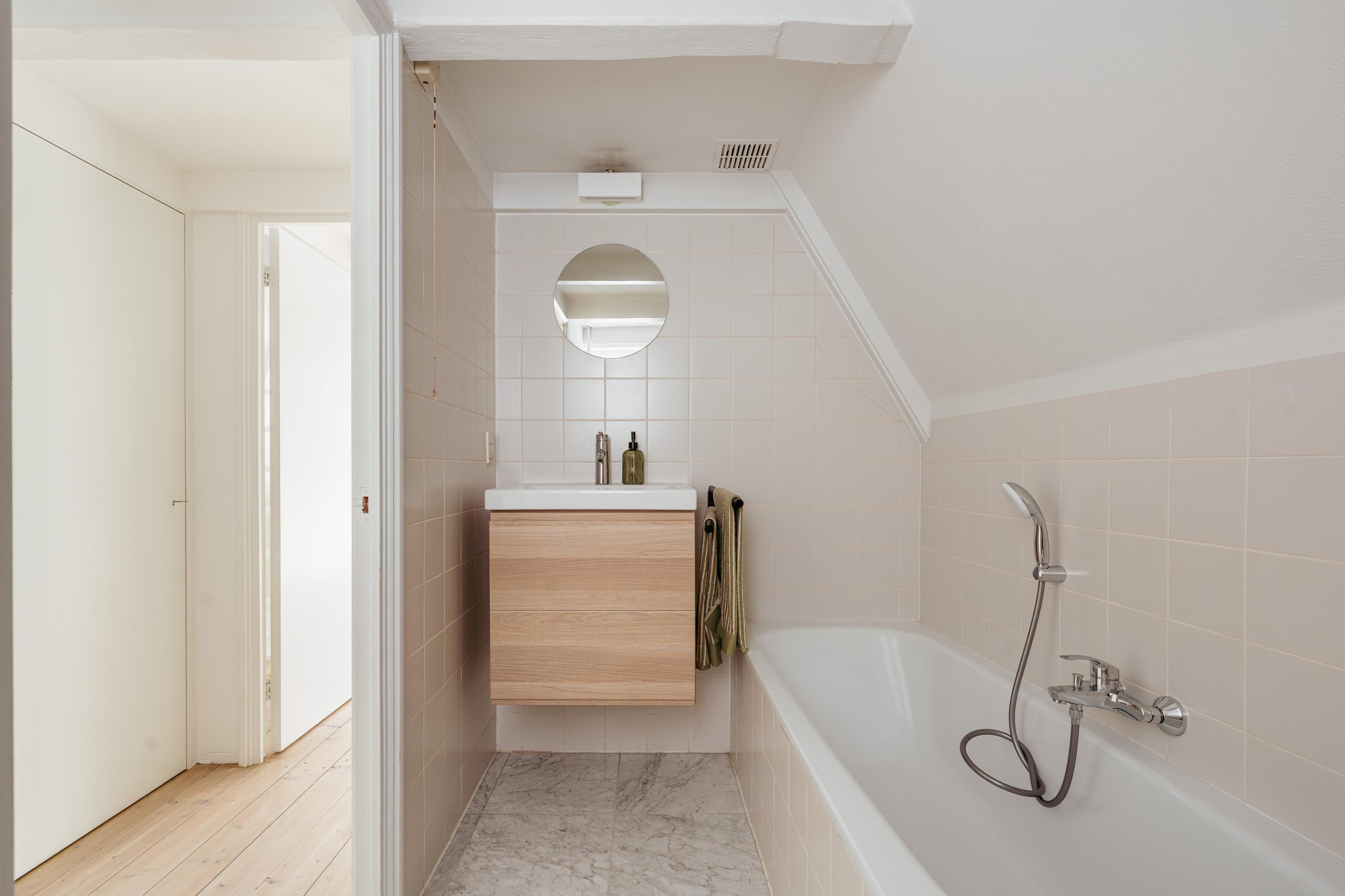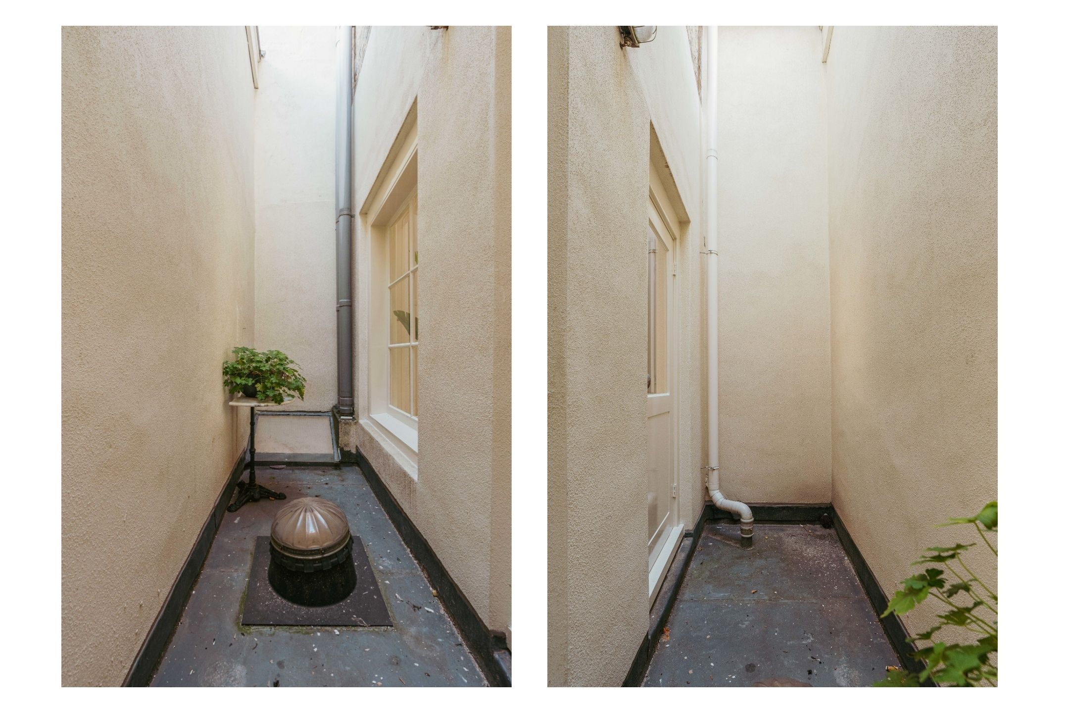 A gracefully conceived split-level living room occupies the first floor, its windows framing views over the Bloemgracht and inviting a slower contemplation of the cityscape. The second floor provides a bedroom that looks out onto the canal and a bathroom with shower, while the third floor features a spacious second bedroom with en suite bathroom, built-in wardrobes and generous proportions. Storage and technical space are quietly resolved under the roof, with access to a secluded terrace affording moments of privacy above the city.