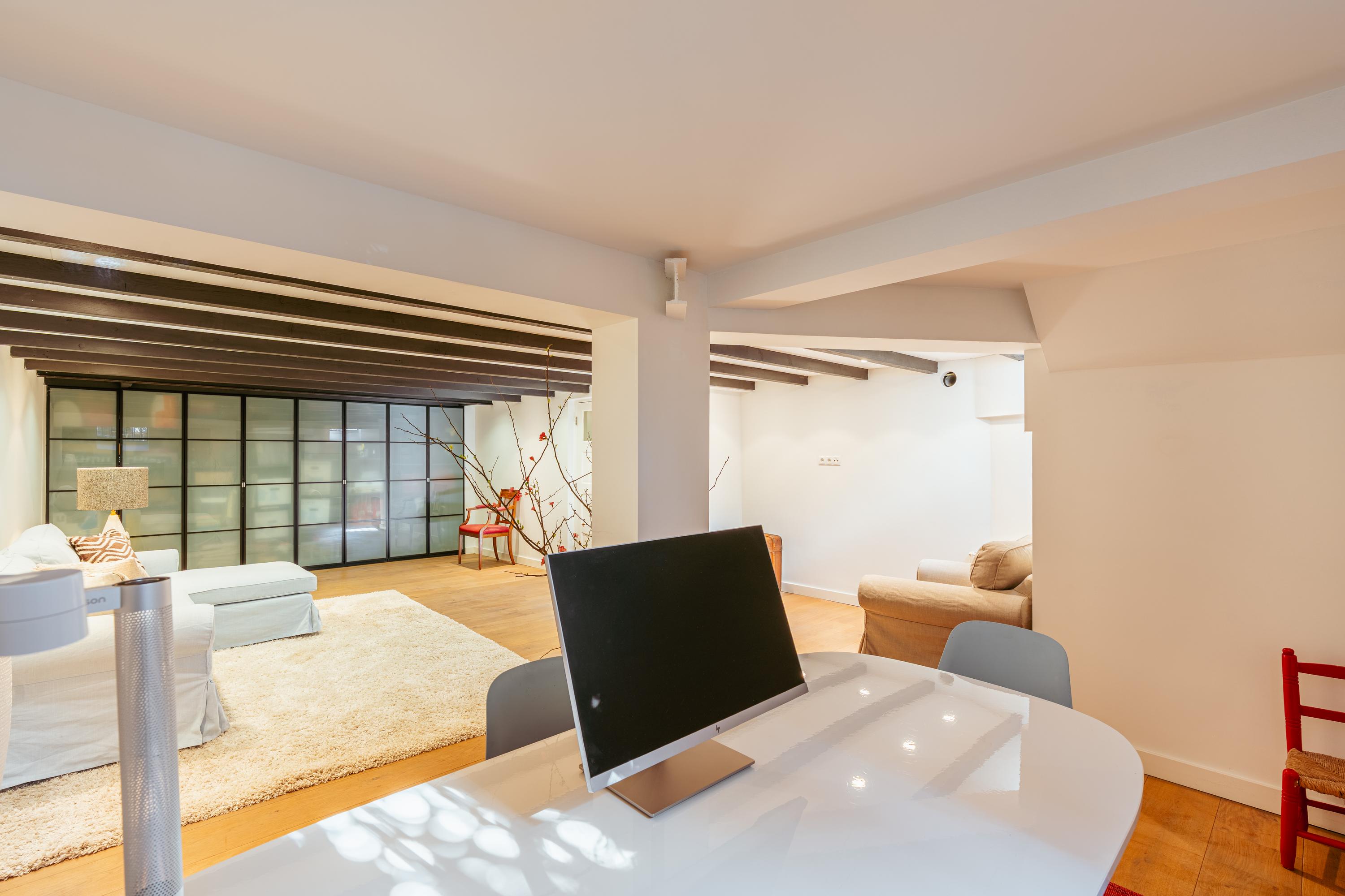 Carefully maintained, the townhouse invites abundant daylight through characterful windows and enjoys an intuitive layout. On the ground floor, an inviting living room with open fireplace and bay window flows to the raised front terrace and a spacious dining area, complemented by a modern open kitchen. Sliding doors connect the indoors to a secluded rear garden, providing privacy and garden storage, accessible via private entrance.