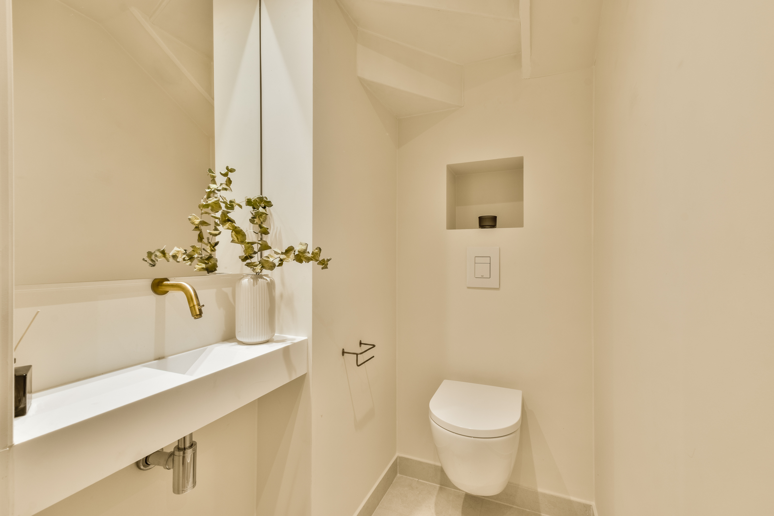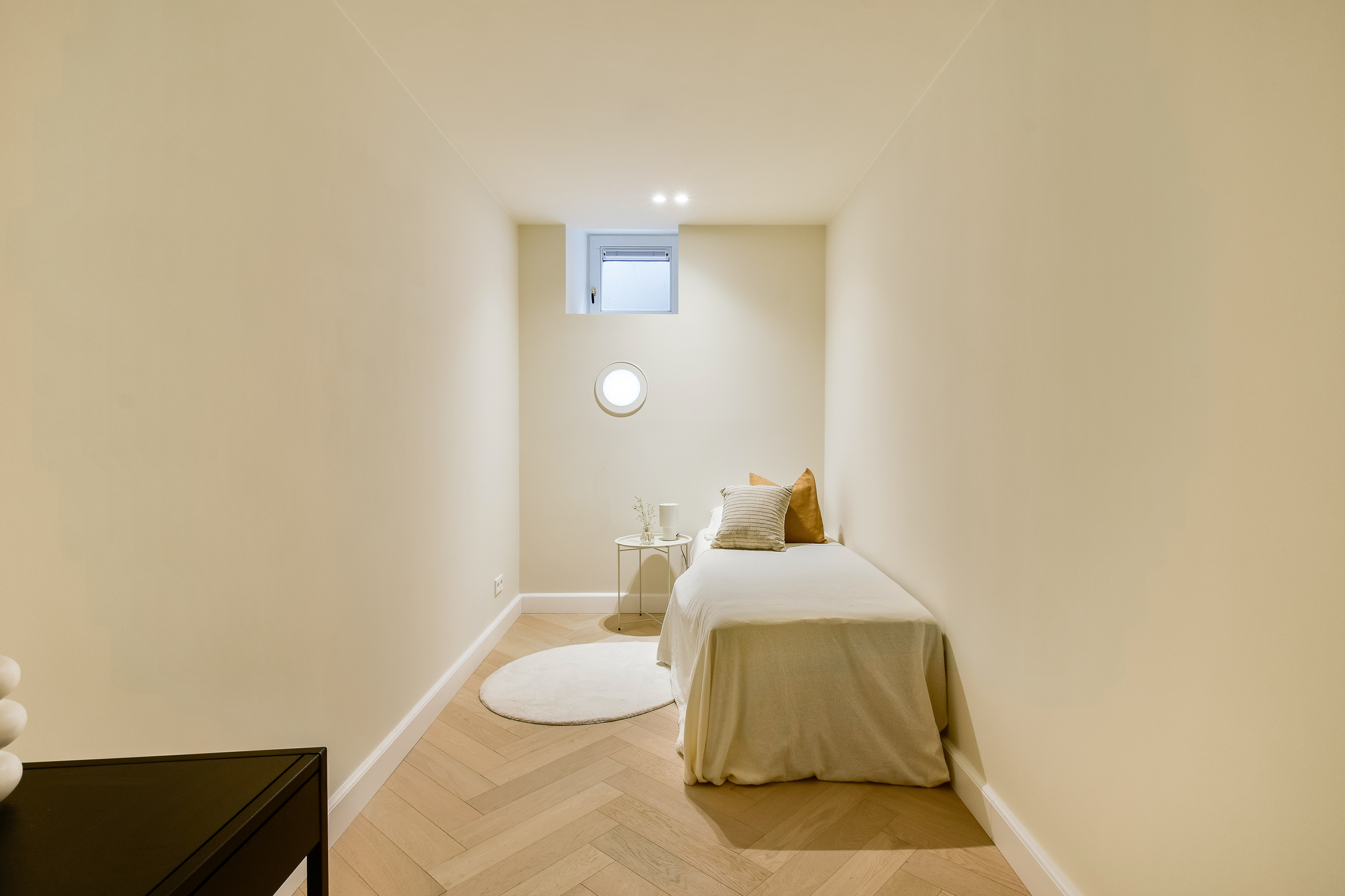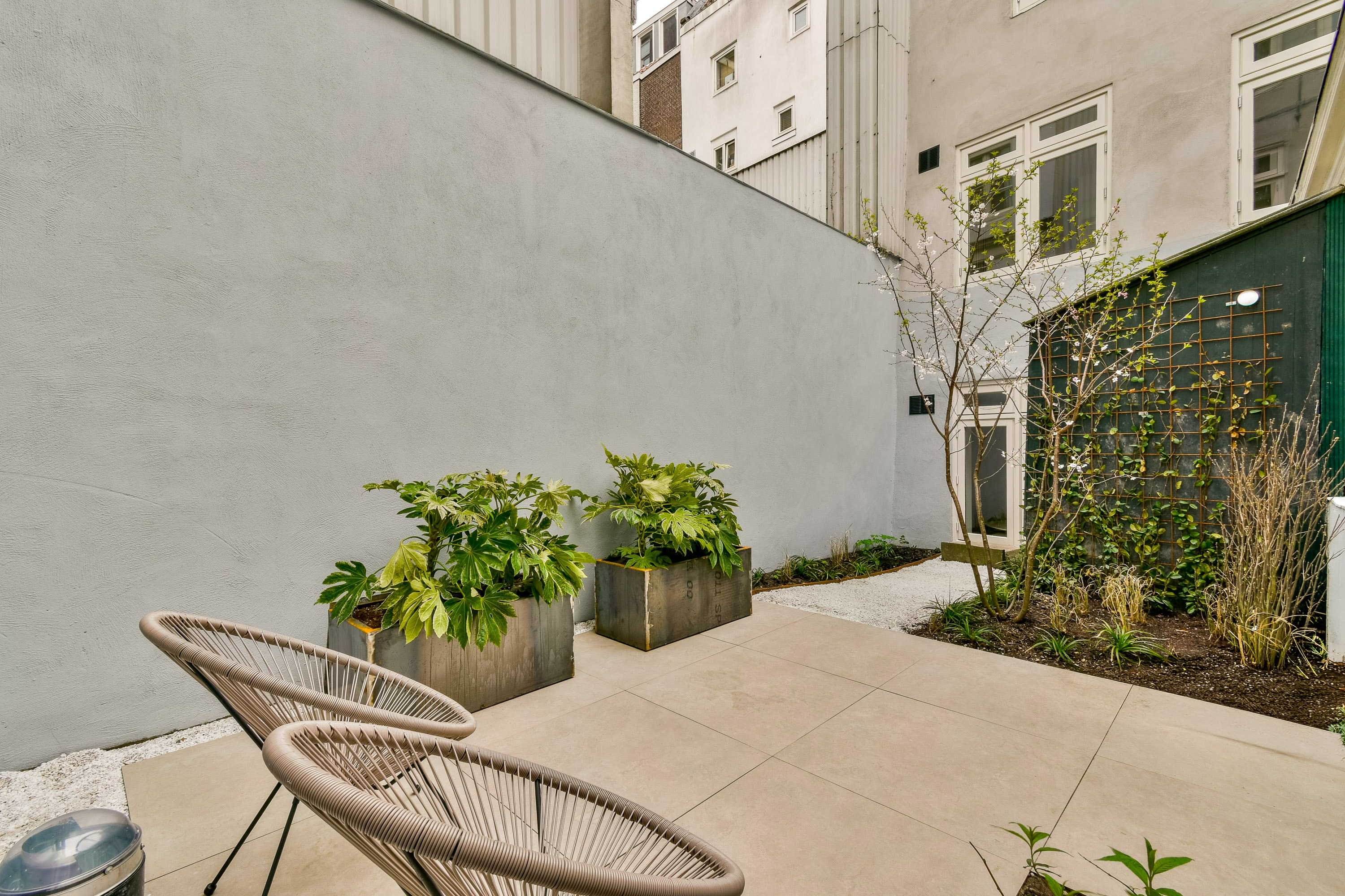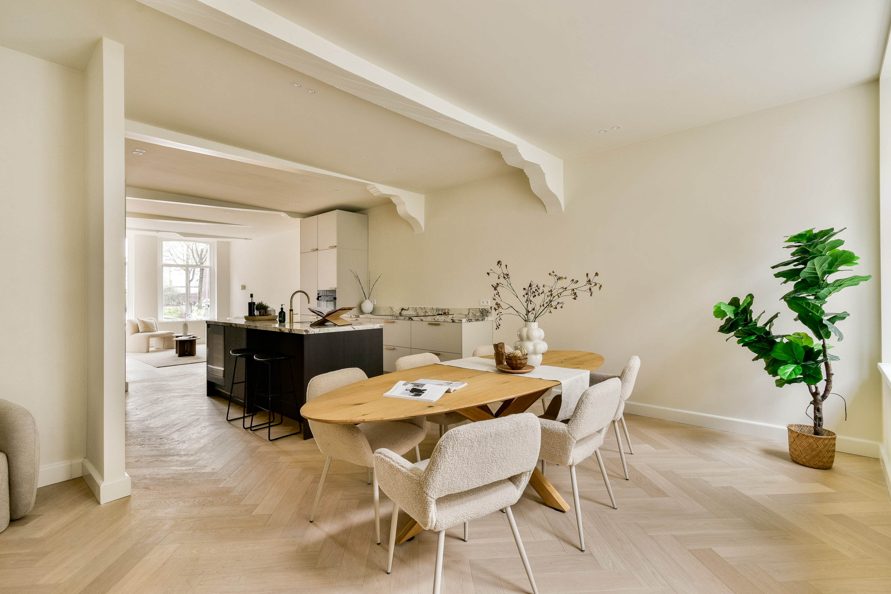 The entrance is located on the ground floor. Here you step into a bright and spacious living area, where a generous lounge and dining space seamlessly blend together. The modern open kitchen connects the two areas and is fitted with a cooking island and high-quality built-in appliances—a true eye-catcher for cooking enthusiasts. From the dining area, large French doors open onto the charming (inner) garden, a sheltered private retreat in the heart of the home, away from the city bustle. Here, you can enjoy a wonderful indoor-outdoor living experience. At the rear, there is an additional room, accessible both from the garden and via the hallway next to the dining room. This space features a second kitchen and therefore offers numerous possibilities, such as a home office, guest accommodation, or hobby room. Ample built-in cupboards on this floor ensure sufficient storage space.