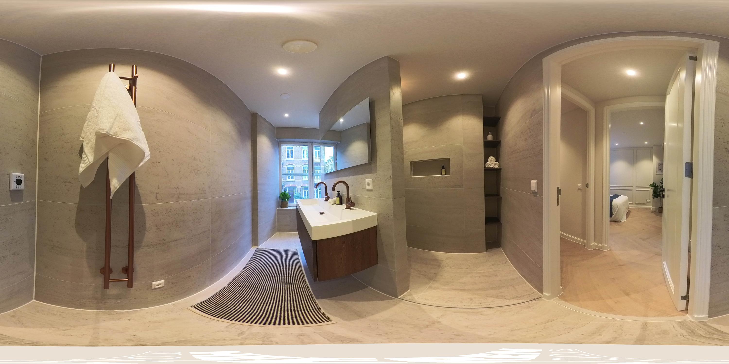 The staircase in the living room leads to the basement. Thanks to the skylights, this floor is remarkably light. Here you will find a spacious bedroom with a luxurious ensuite bathroom, equipped with a walk-in shower, sink, toilet, and sauna. The quiet and intimate atmosphere makes this an ideal space for guests or as a private retreat.