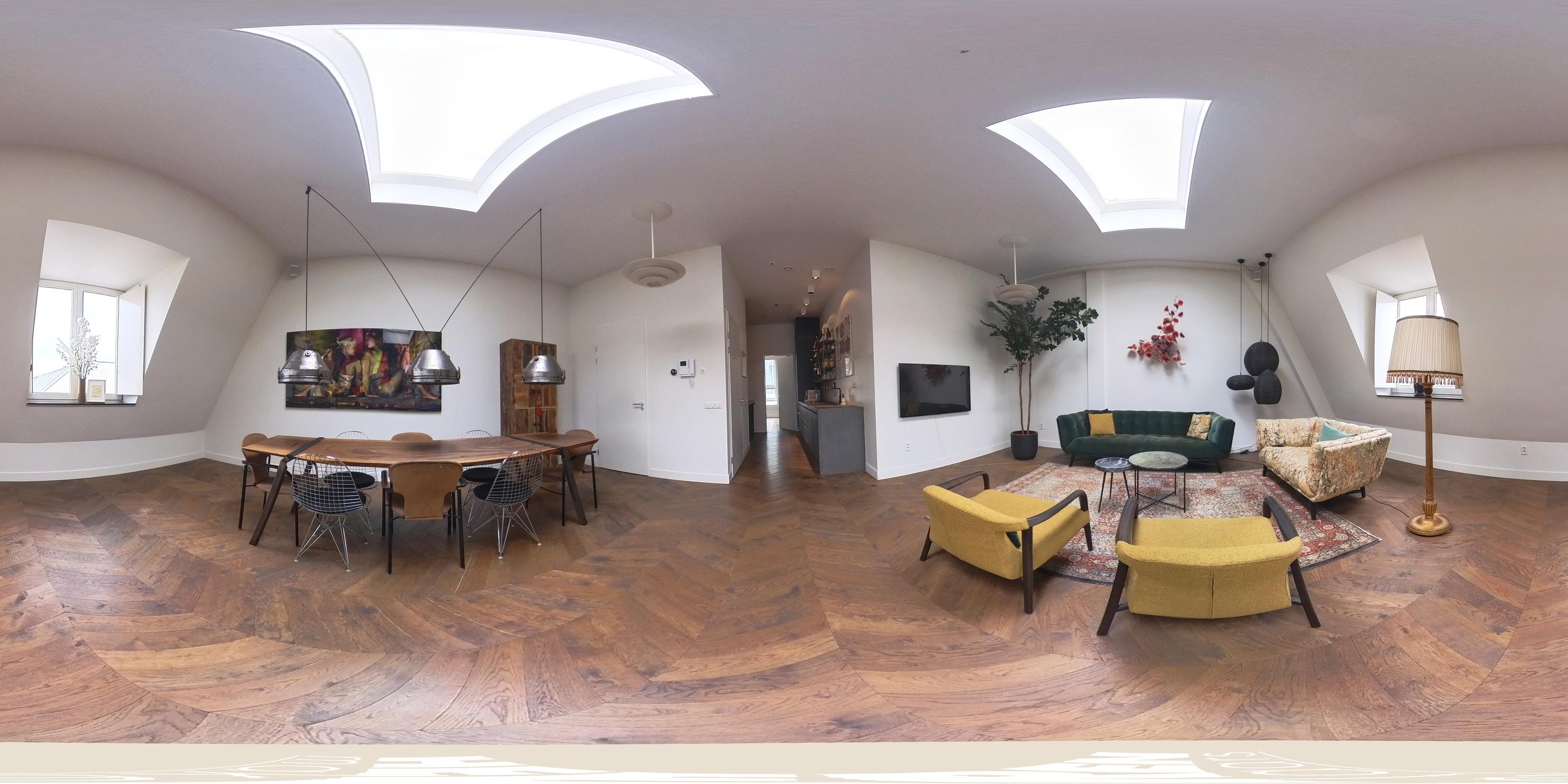 The third floor forms the main living level of the apartment. Here you will find the spacious and bright living room with open kitchen located at the front of the apartment. Thanks to the impressive ceiling height and multiple skylights, the space enjoys abundant daylight, creating an open and airy atmosphere. The wooden floor and clean finishes contribute to the warm and modern appearance.