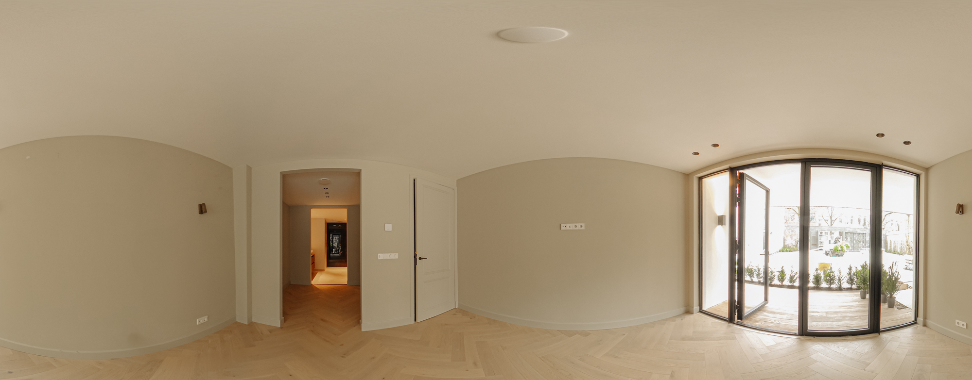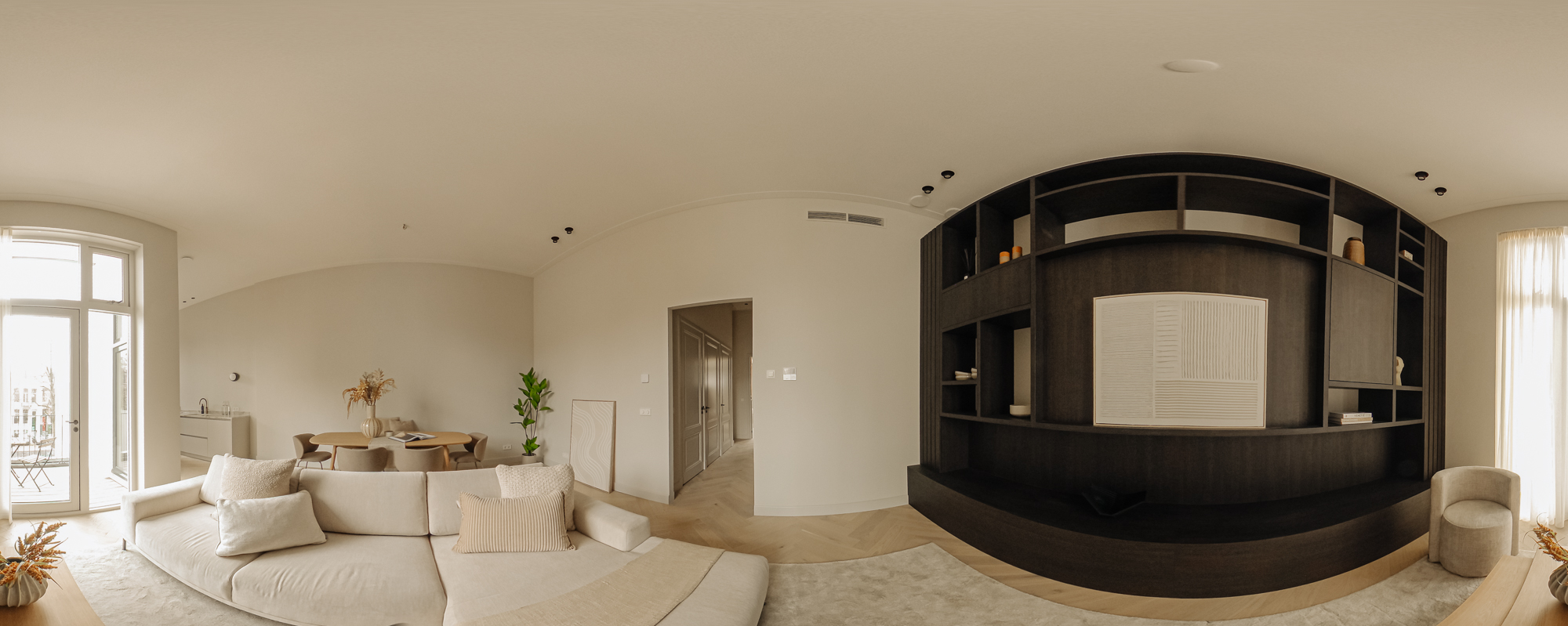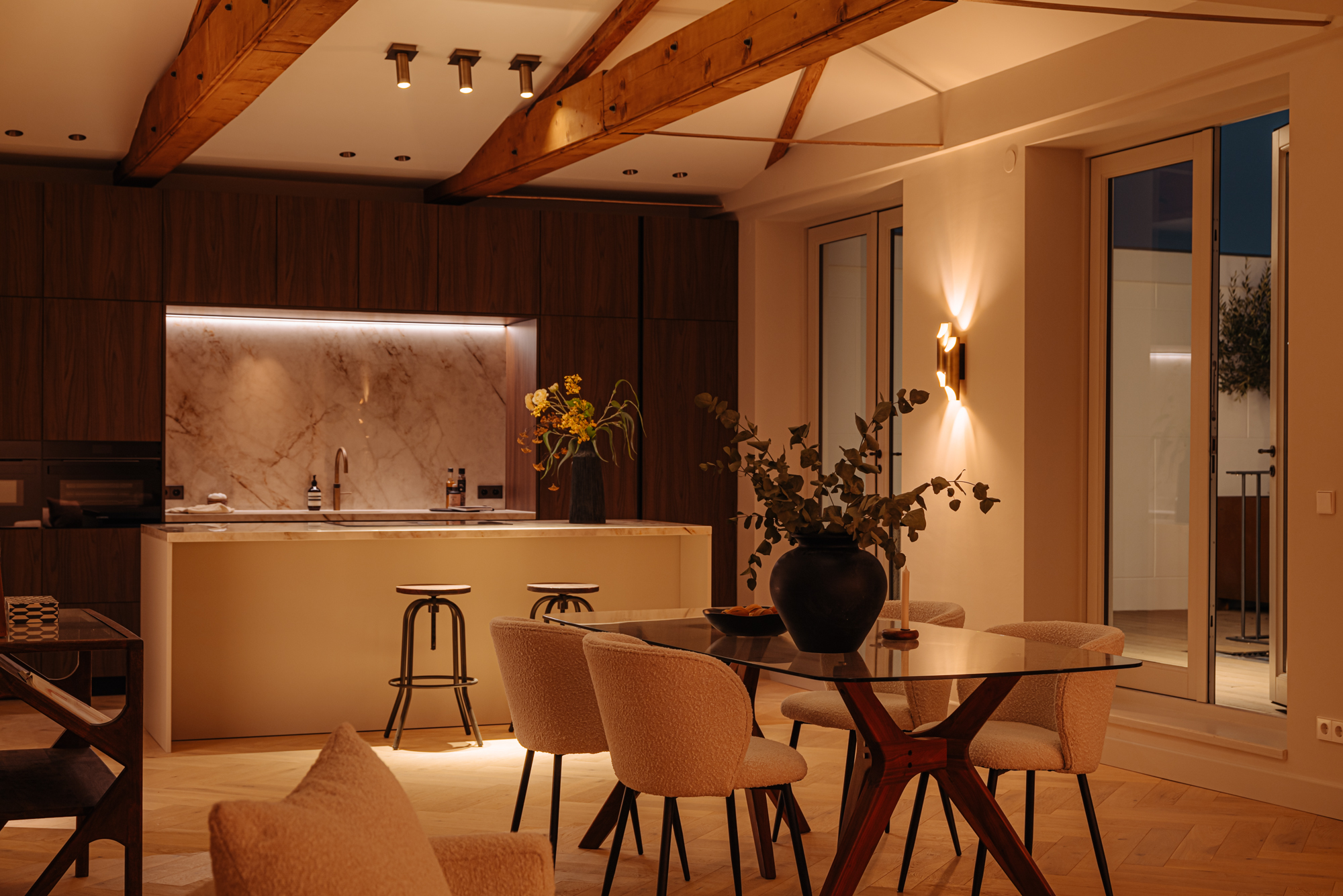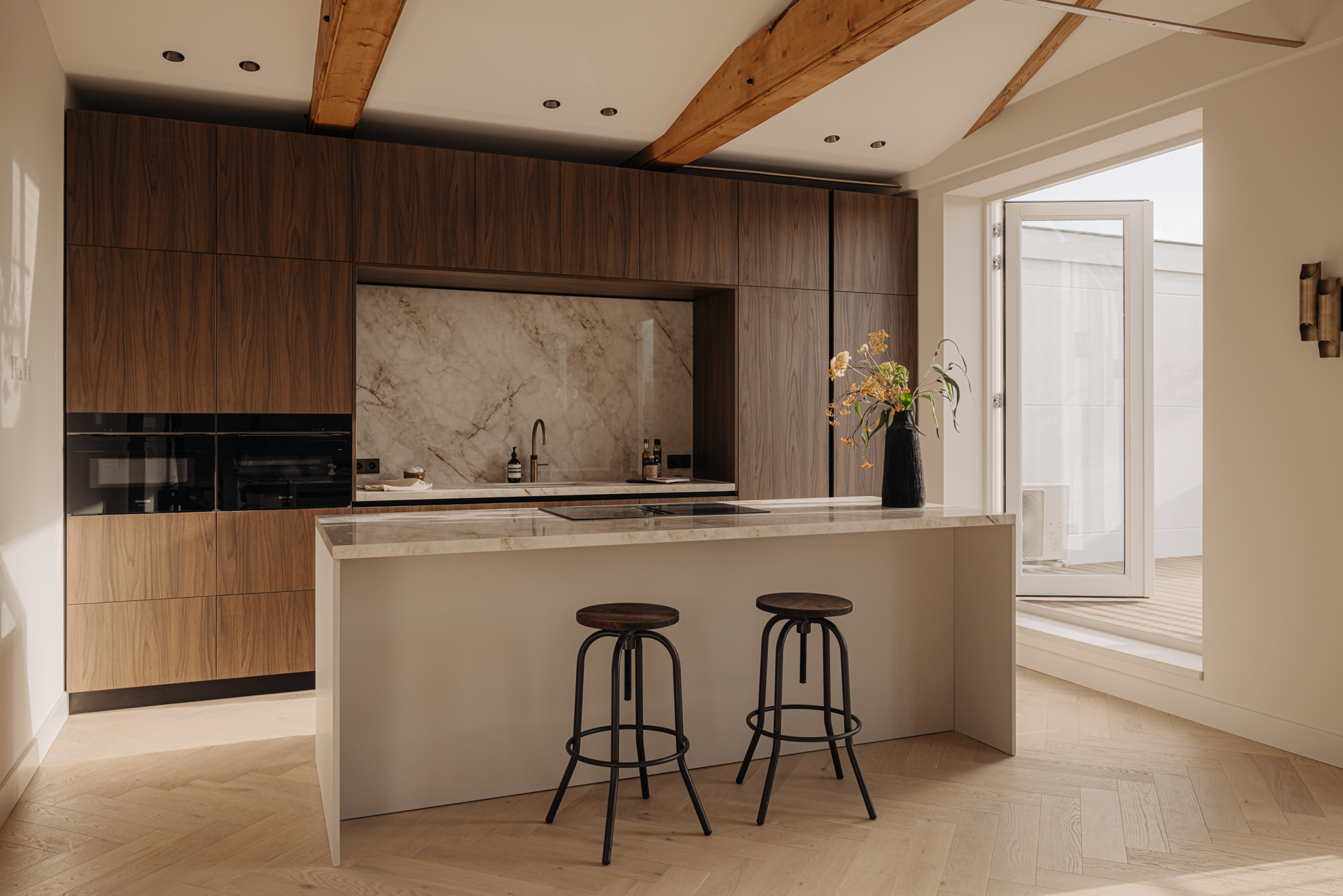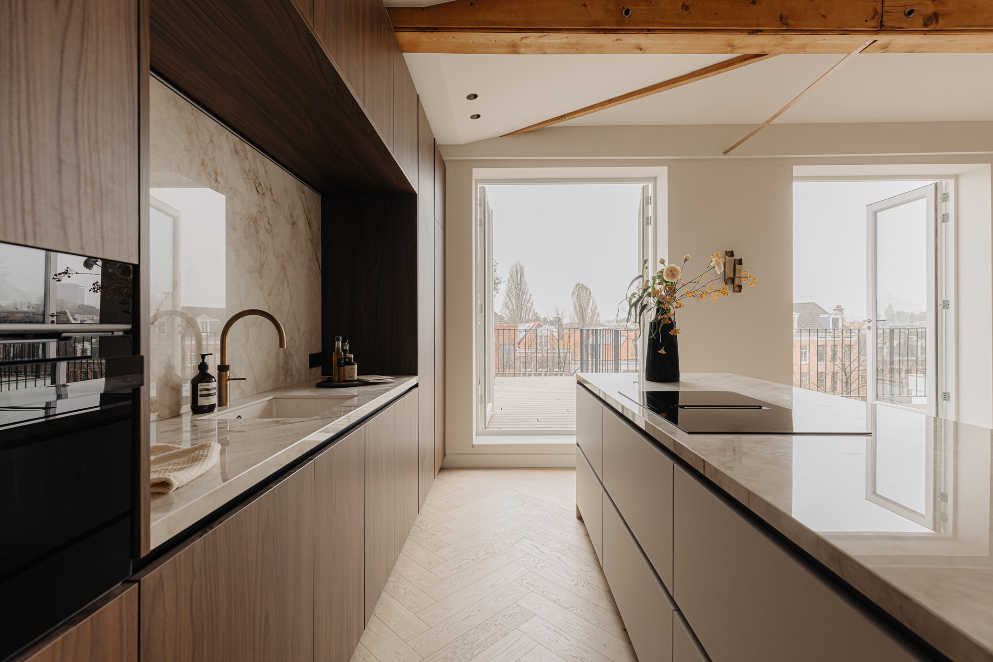 The front door to the apartment opens into a landing that gives access to storage space, a separate guest toilet and all the apartment’s other rooms. There is a large, bright living room (approx. 53 m2) and an open-plan kitchen of Italian design with a cooking island at the front of this floor. The luxury kitchen is equipped with a comprehensive range of built-in appliances and balances style and functionality perfectly. The sophisticated combination of white units with marble worktops and large units with the warm shade of walnut give the space a beautiful, atmospheric feel. A number of double doors open out onto the apartment’s sunny roof terrace.