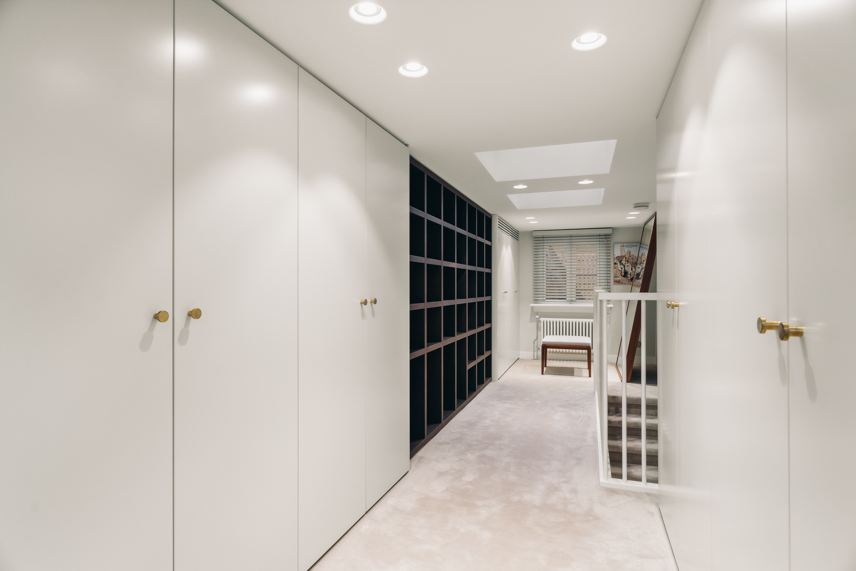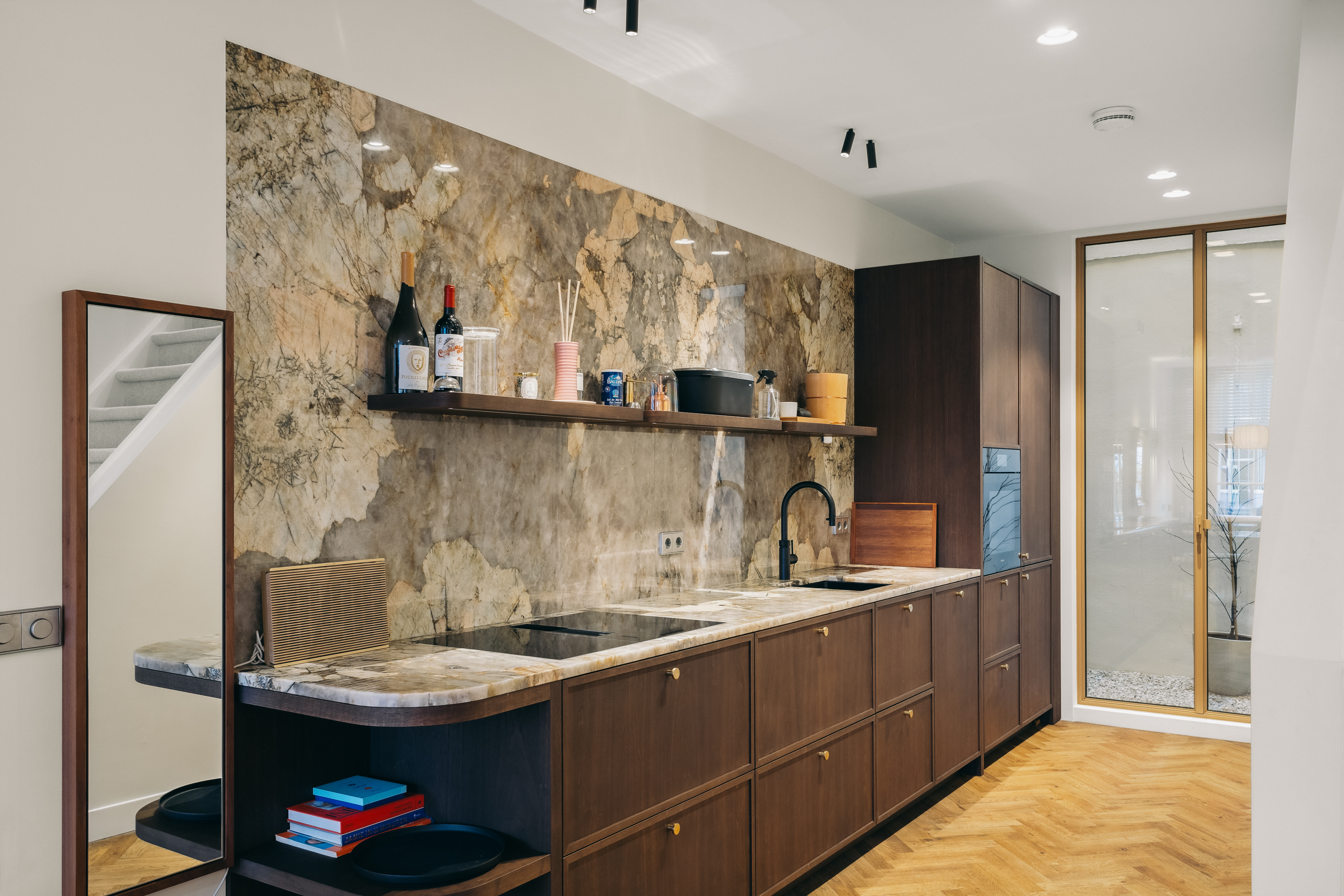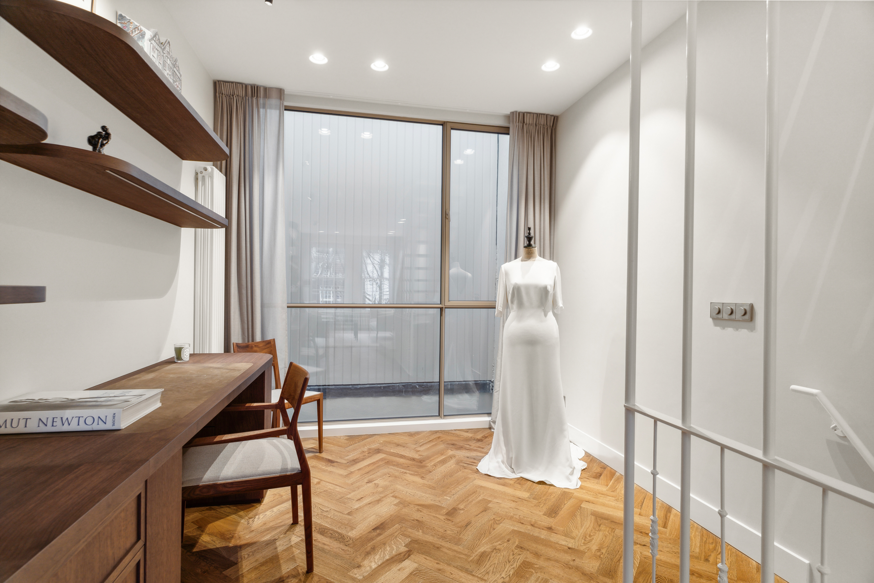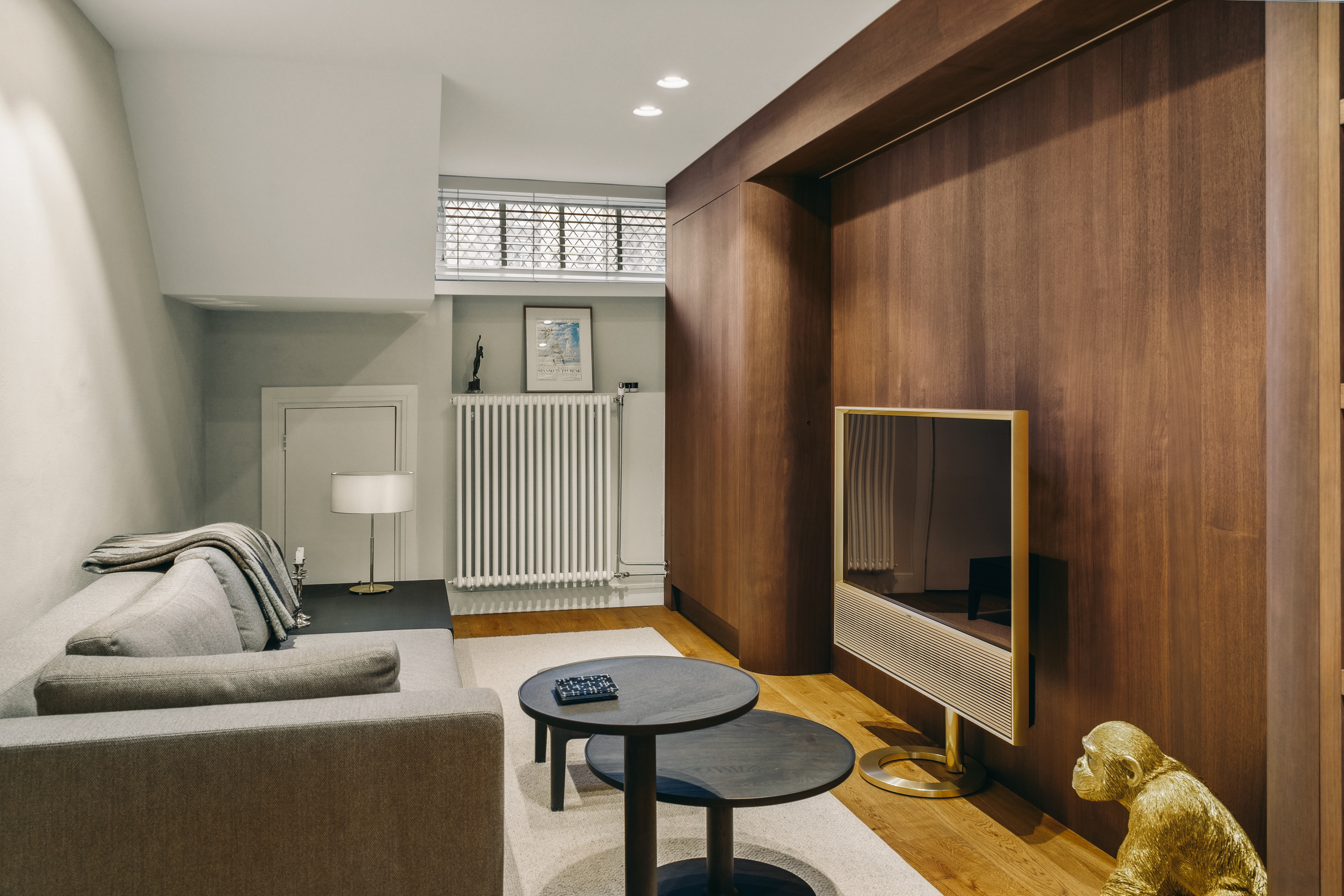 Below, the souterrain offers a tranquil living area with tailored storage in rich wood, alongside a spacious utility room equipped for practical daily needs. Ascending, the first floor presents an elegant salon marked by broad windows and a walnut-veneered wall for display or work. The top floors reveal a spacious bedroom, a bathroom finished in travertine with underfloor heating, and a dedicated dressing room lit by a skylight and cooled by air conditioning.