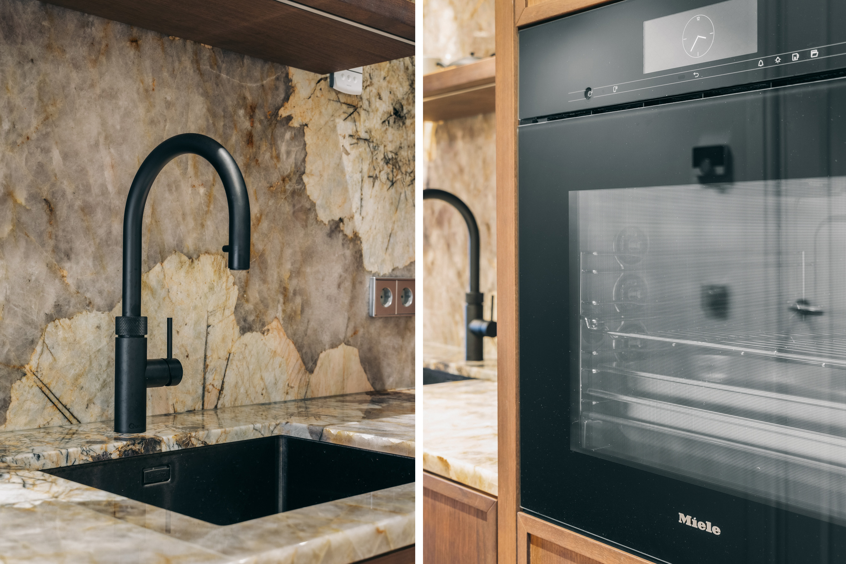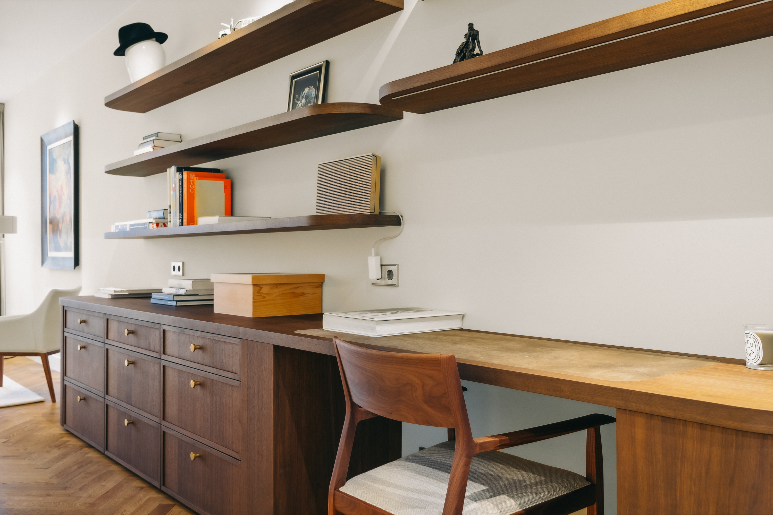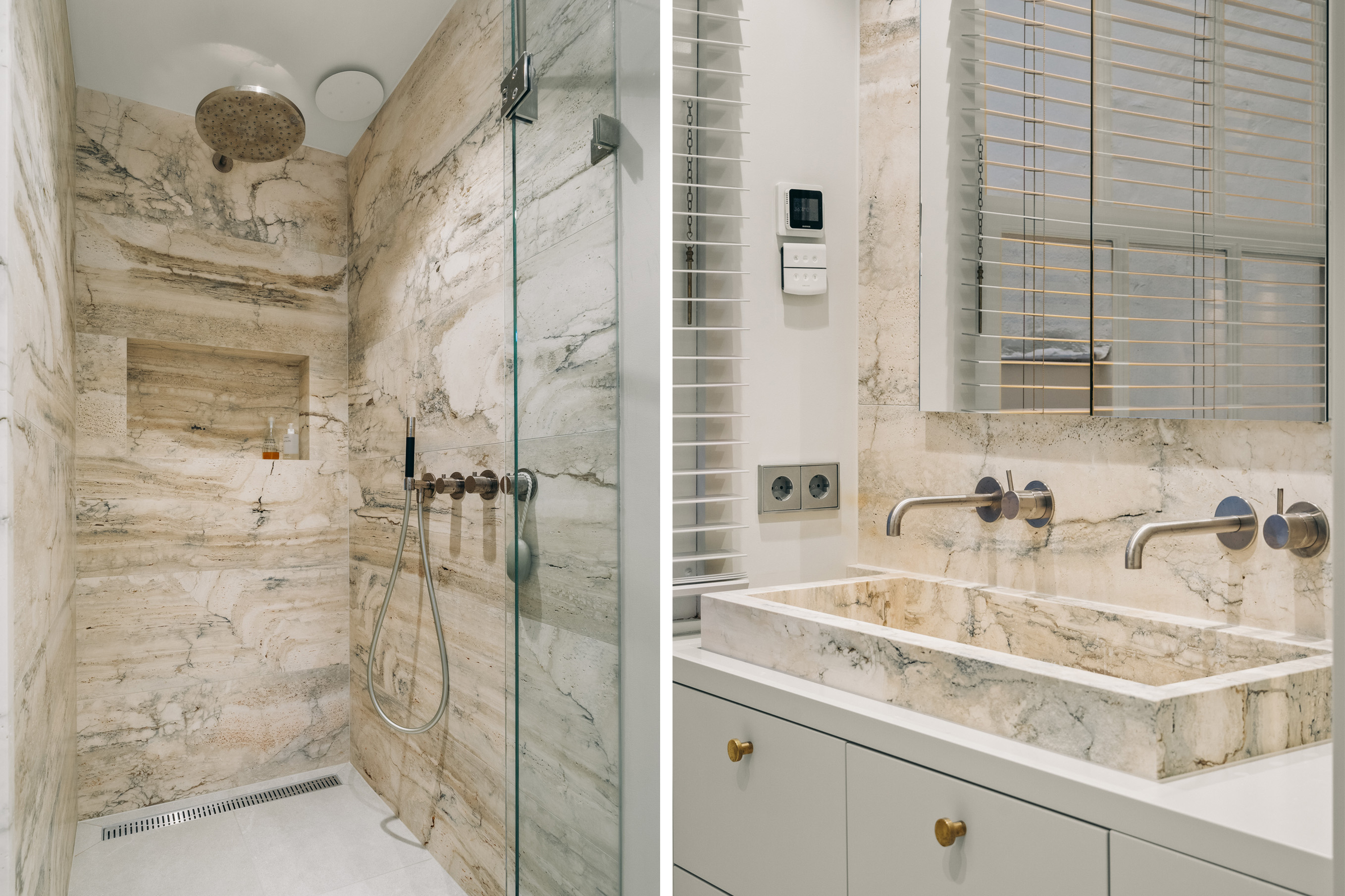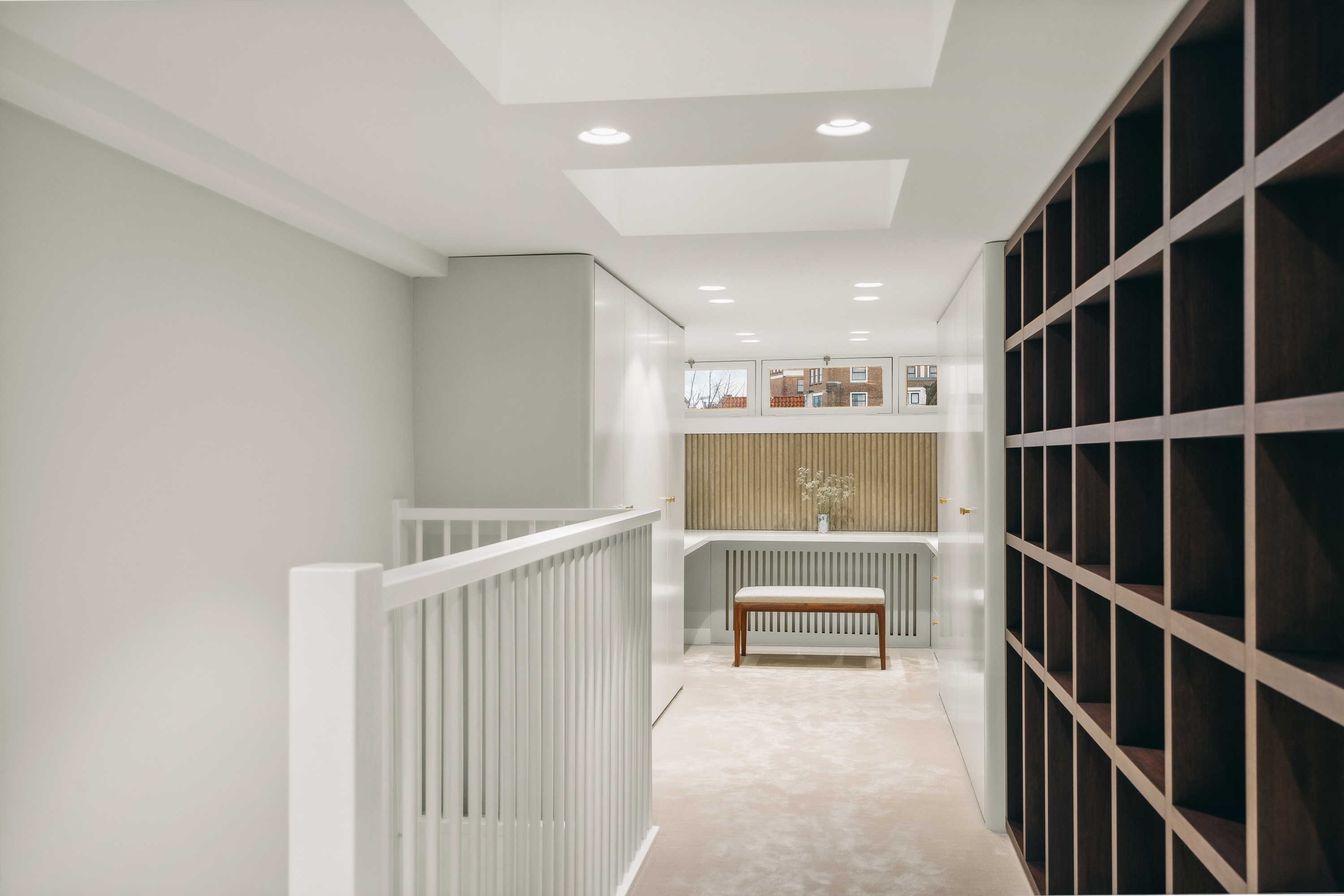 Below, the souterrain offers a tranquil living area with tailored storage in rich wood, alongside a spacious utility room equipped for practical daily needs. Ascending, the first floor presents an elegant salon marked by broad windows and a walnut-veneered wall for display or work. The top floors reveal a spacious bedroom, a bathroom finished in travertine with underfloor heating, and a dedicated dressing room lit by a skylight and cooled by air conditioning.