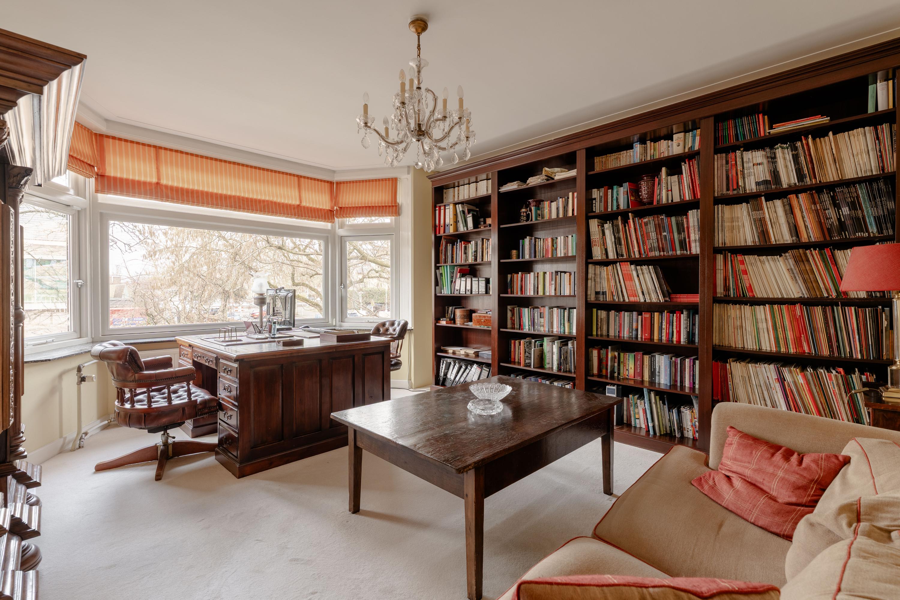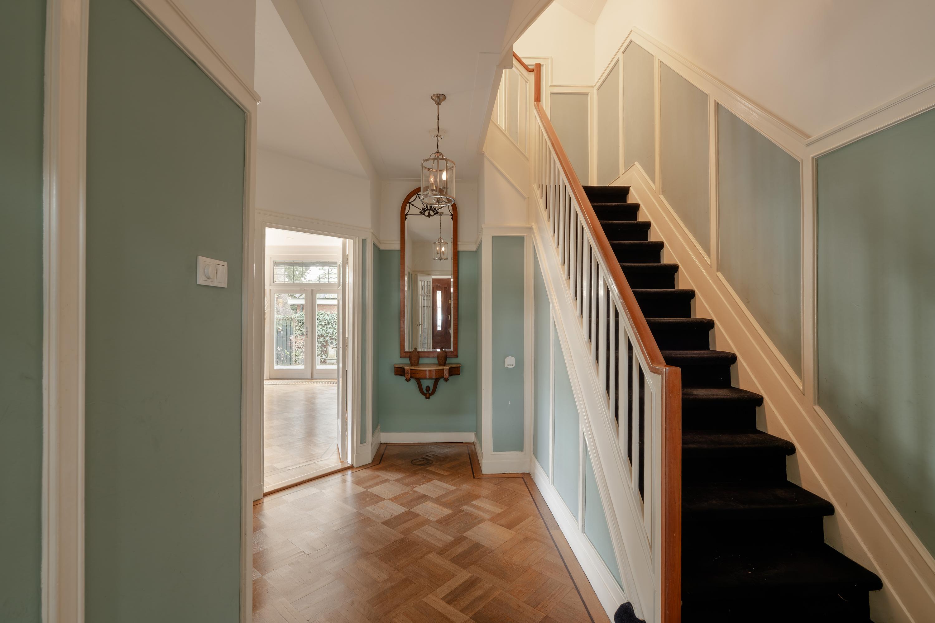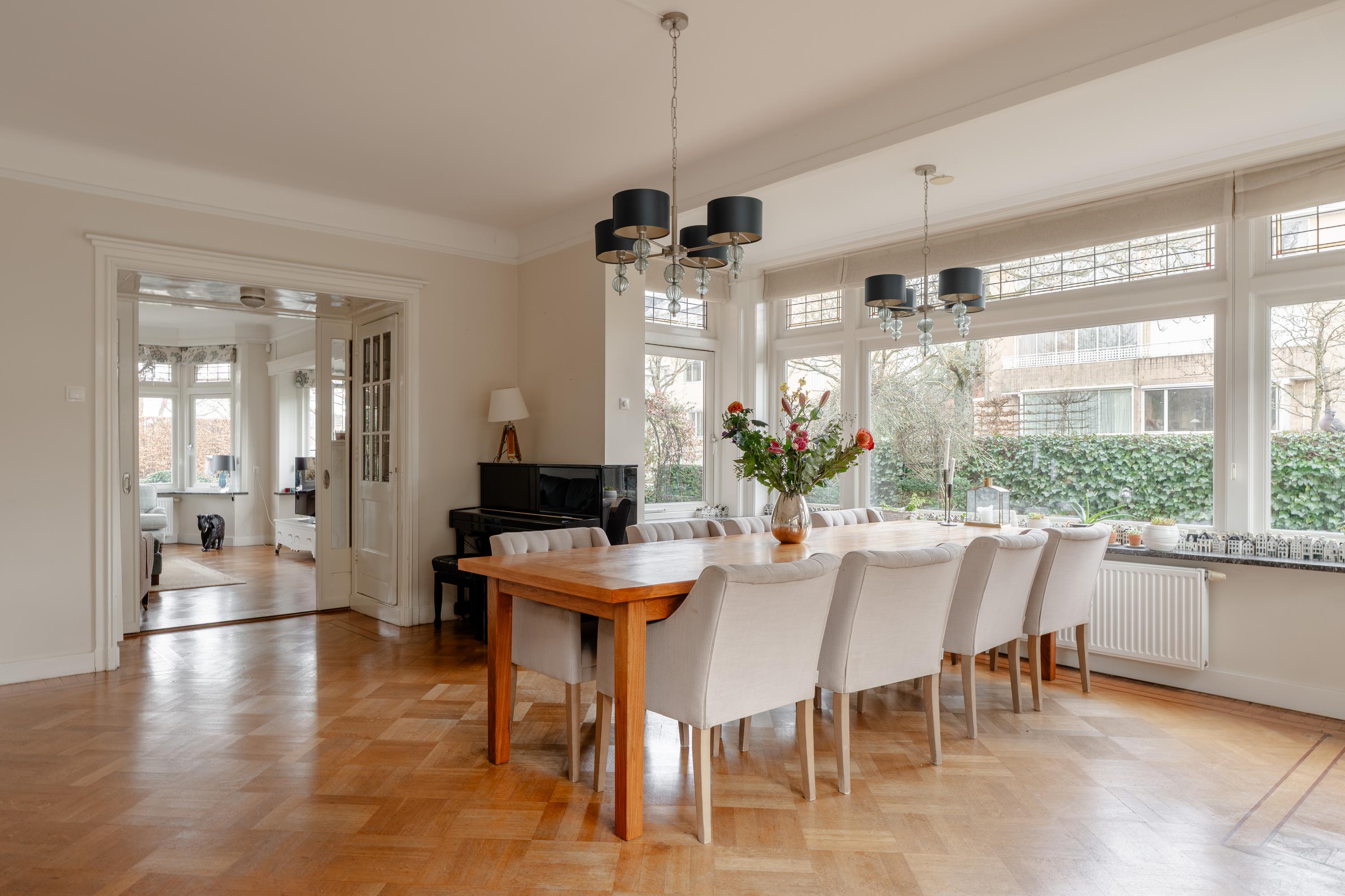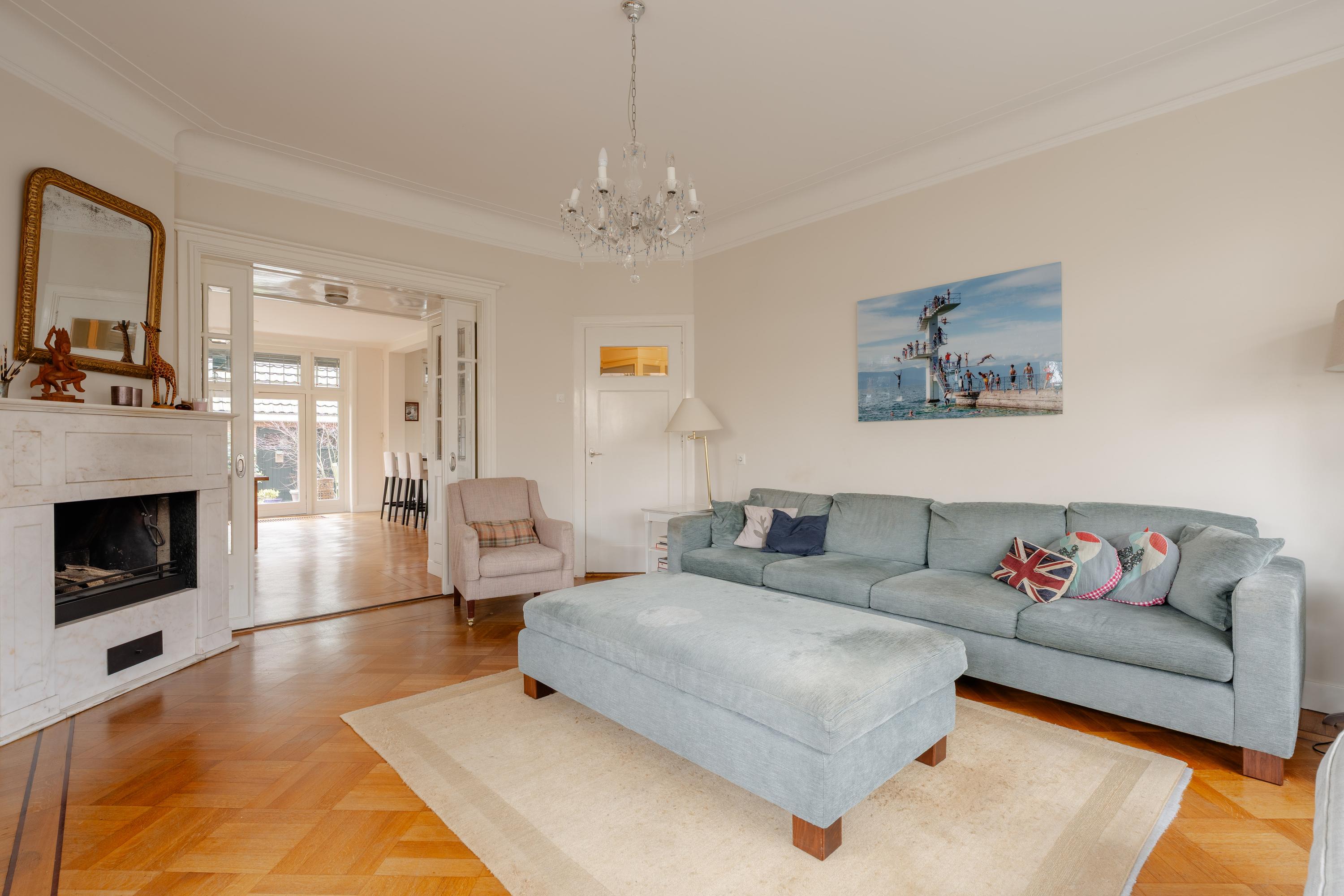 This floor is characterised by beautiful original stained-glass windows and an elegant parquet floor with border. At the front of the house is the spacious and bright en-suite living room with fireplace, creating a warm and inviting living space.