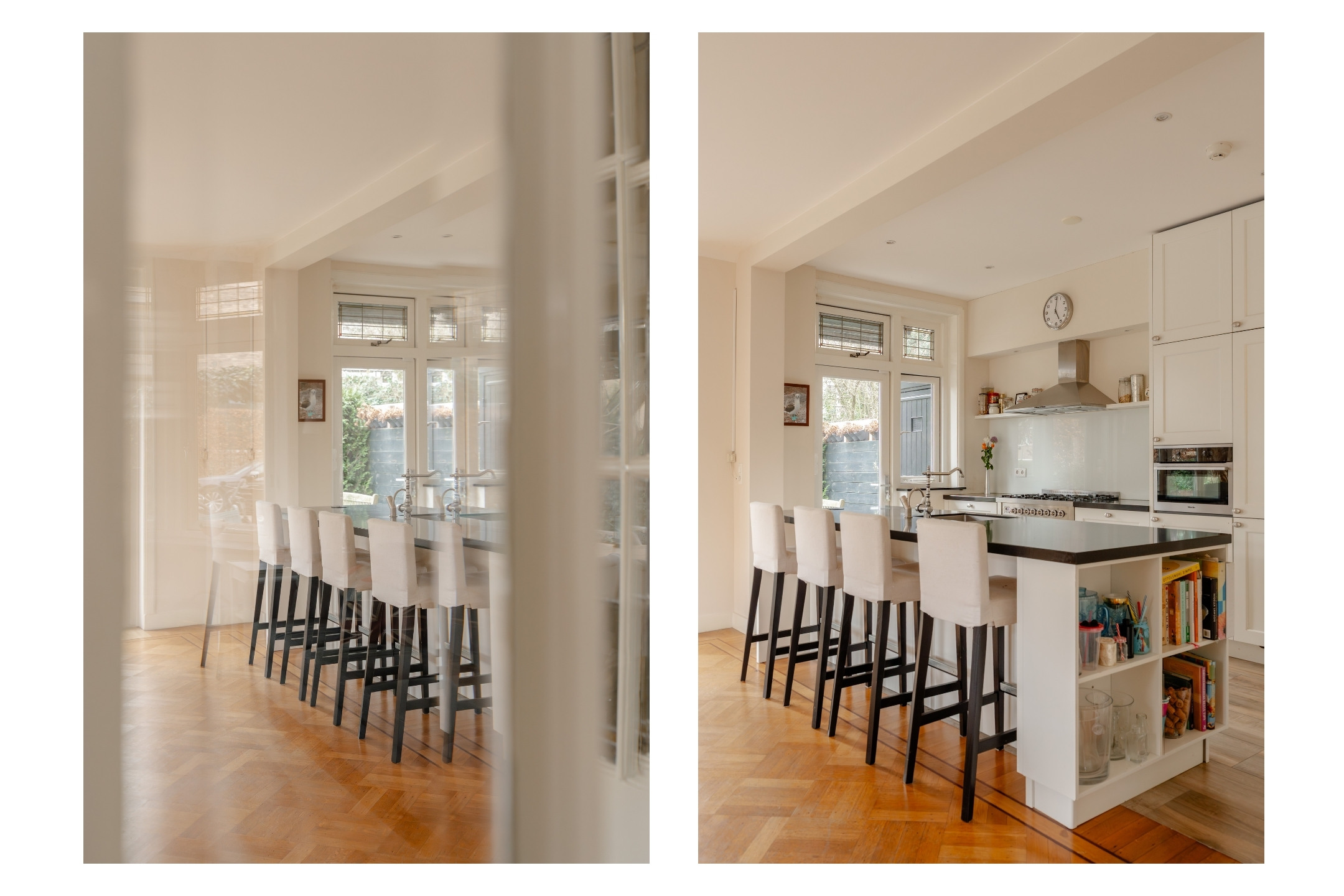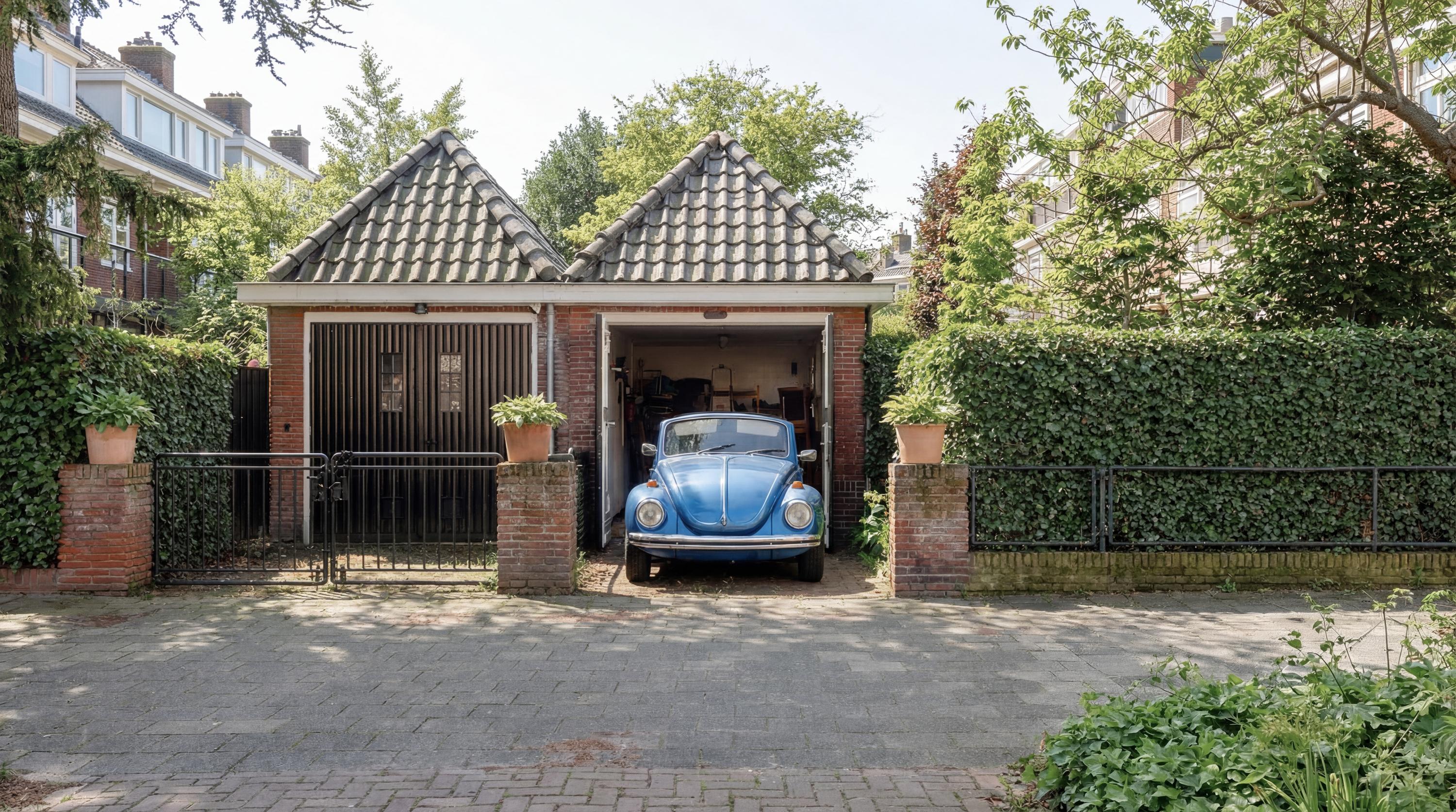 Through the French doors in both the kitchen and dining room you reach the large backyard, which is ideally positioned facing southwest. The sunny garden offers plenty of privacy and space to enjoy the afternoon and evening sun. At the southern side of the garden there is a spacious detached garage with private driveway.