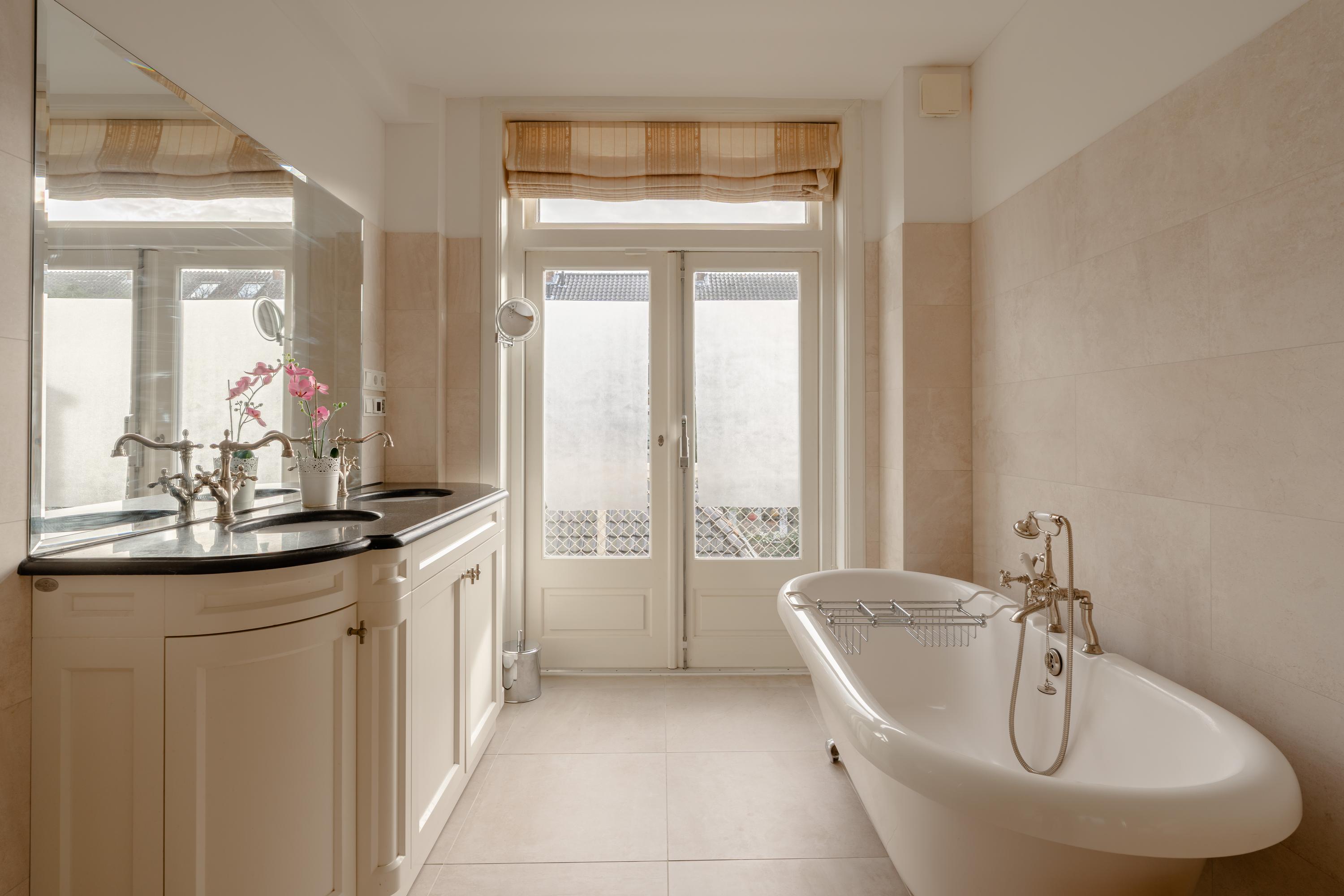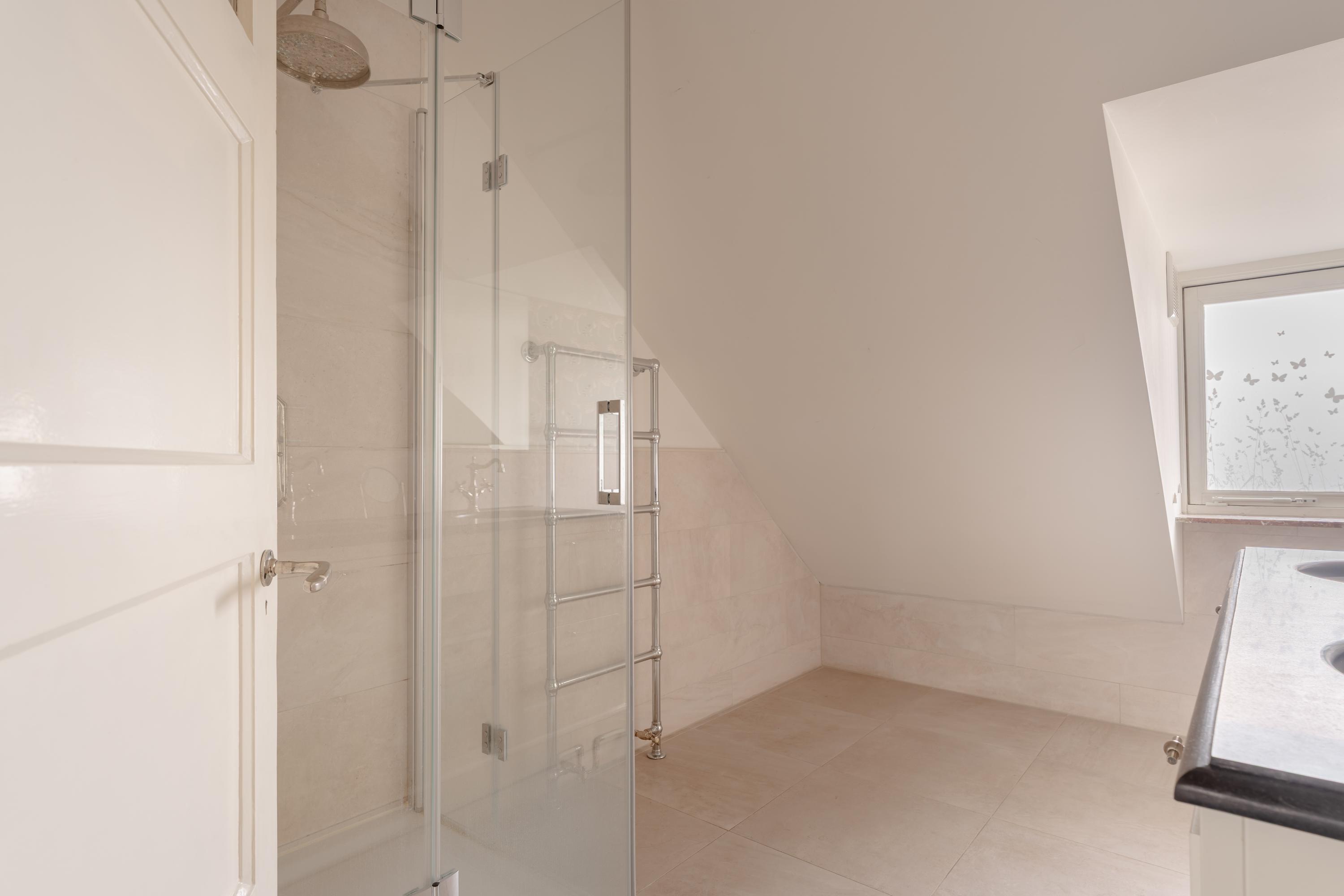 At the rear of the house is the spacious master bedroom with access to the balcony. The classic bathroom, finished in béton ciré, features a shower, double washbasin, towel radiator and a freestanding bathtub. The bathroom also provides access to the balcony through French doors.