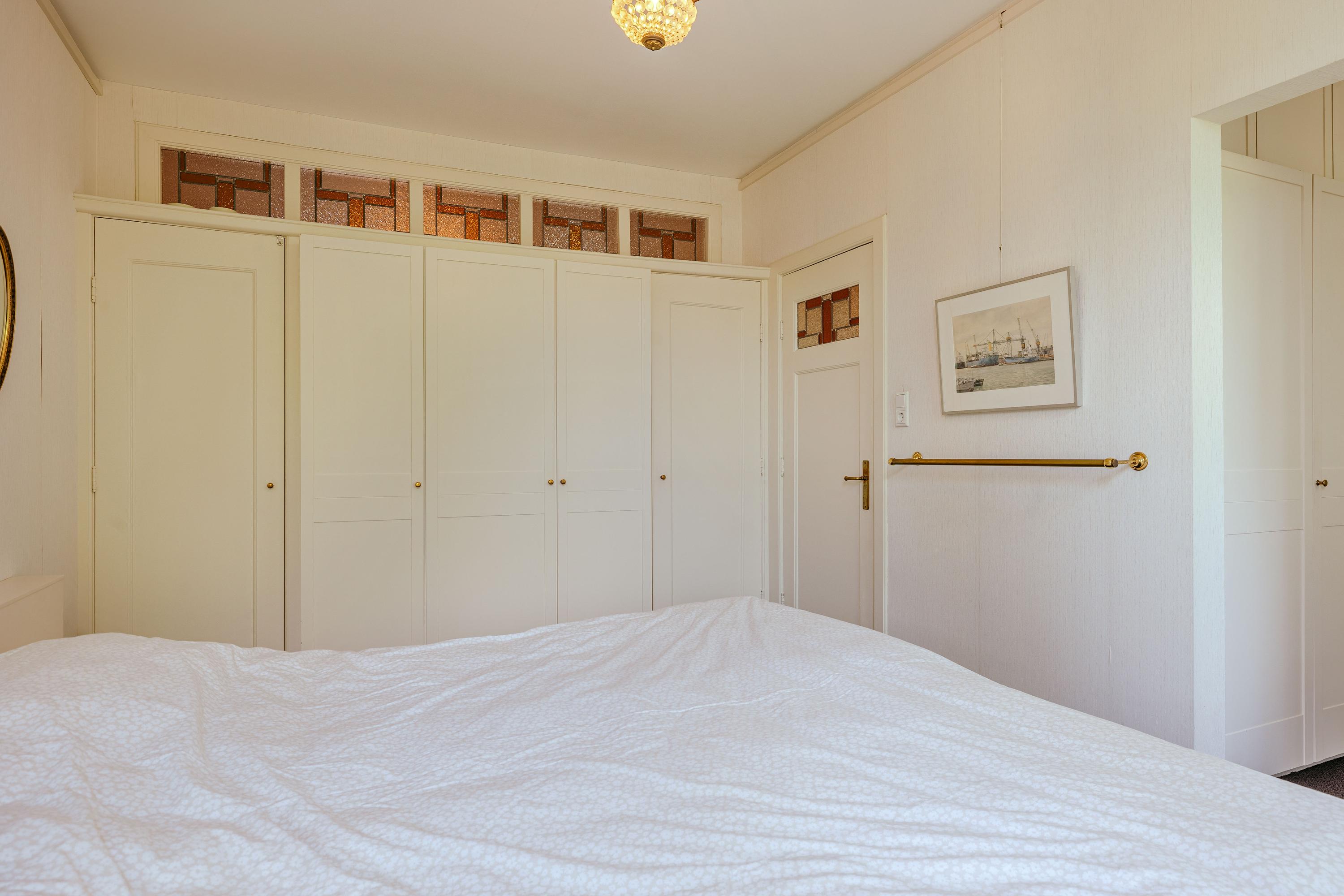 Spacious entrance hall providing access to all rooms. There is a coat closet in the hall, along with the meter cupboard and a separate toilet with a small sink. At the front, a generously sized bedroom features a walk-in closet and several built-in wardrobes. At the rear, the large main bedroom opens through French doors onto the west-facing balcony, offering views of the beautifully landscaped and well-maintained inner gardens of Minervalaan and Michelangelostraat.