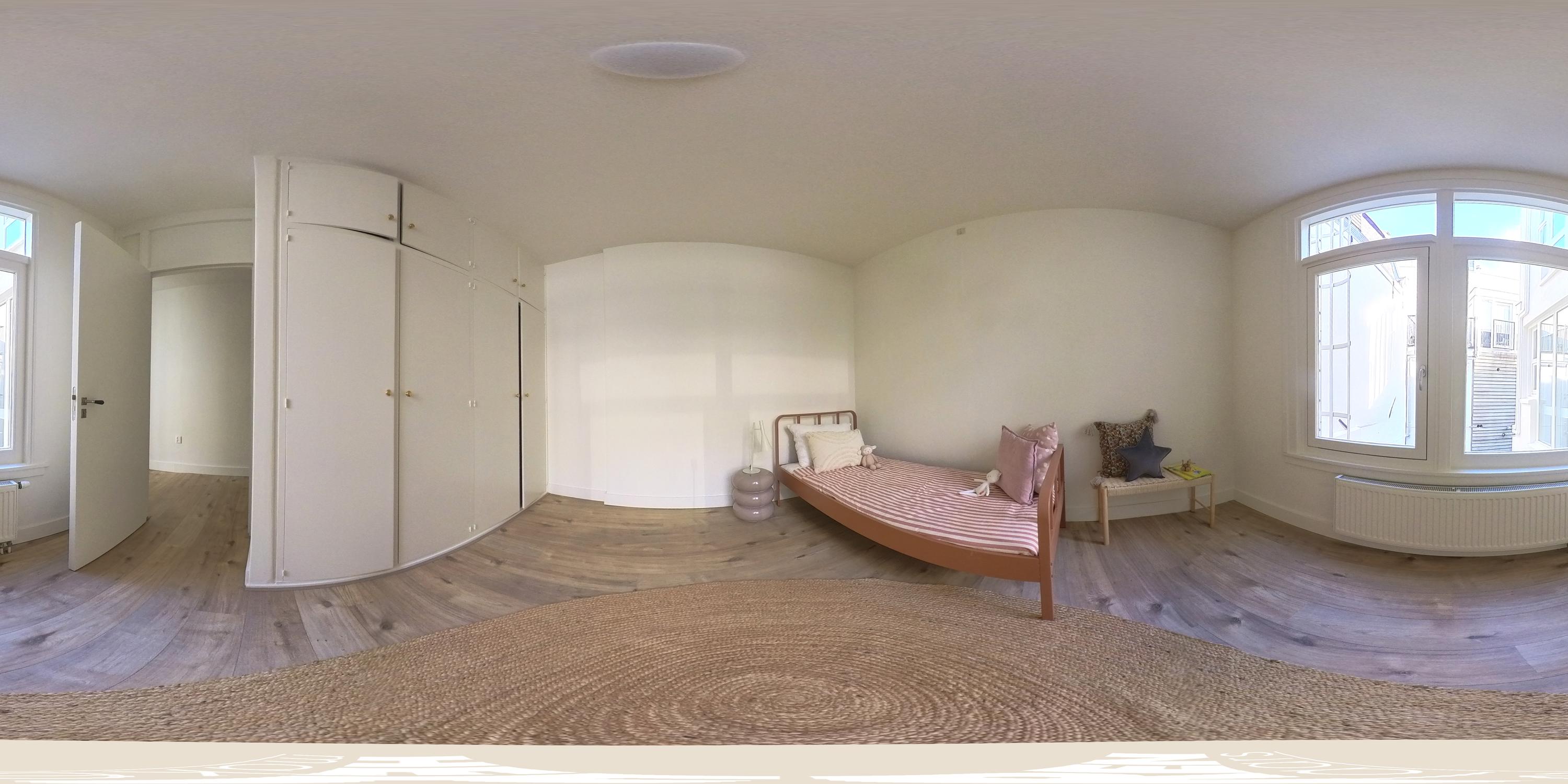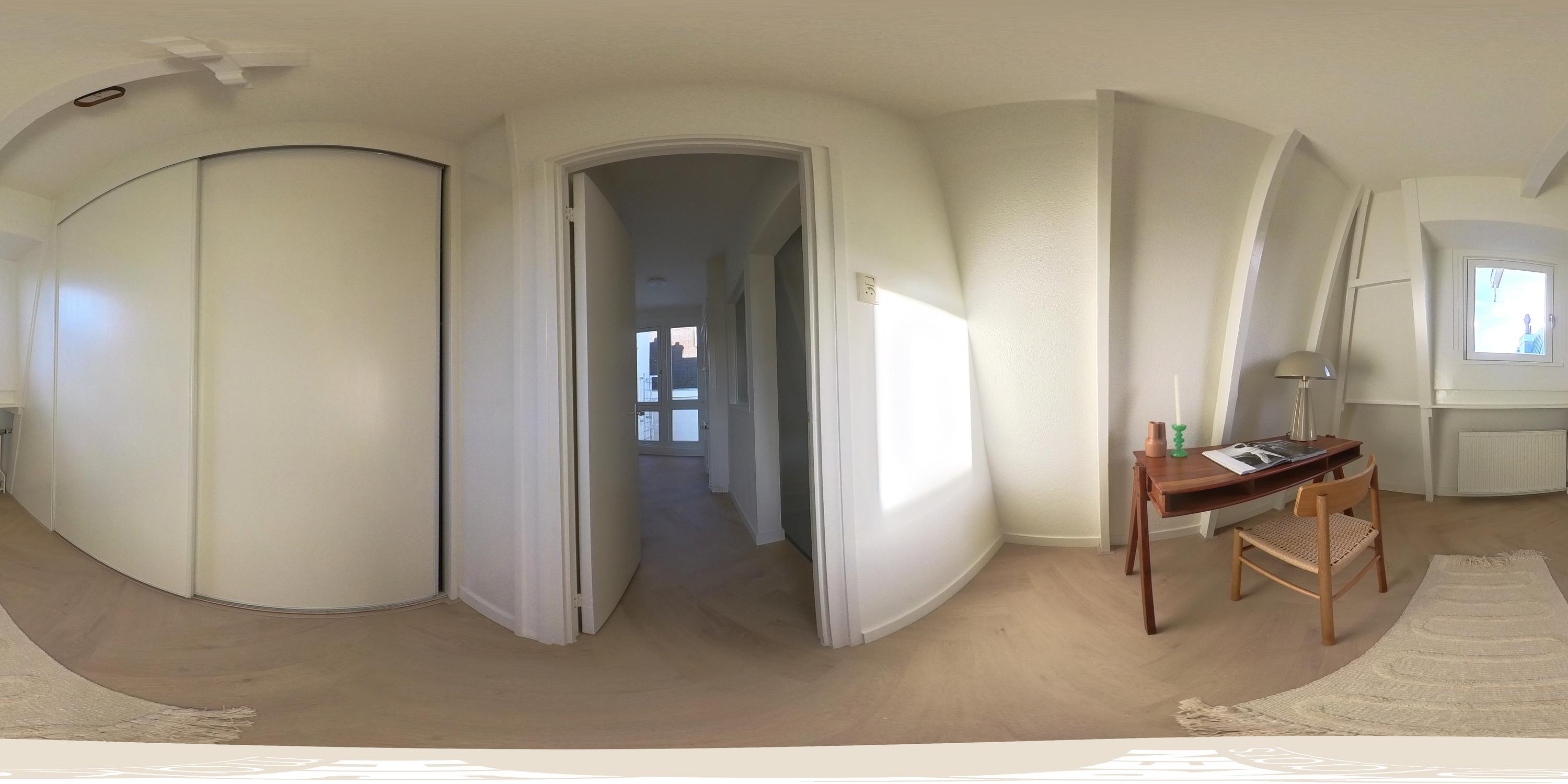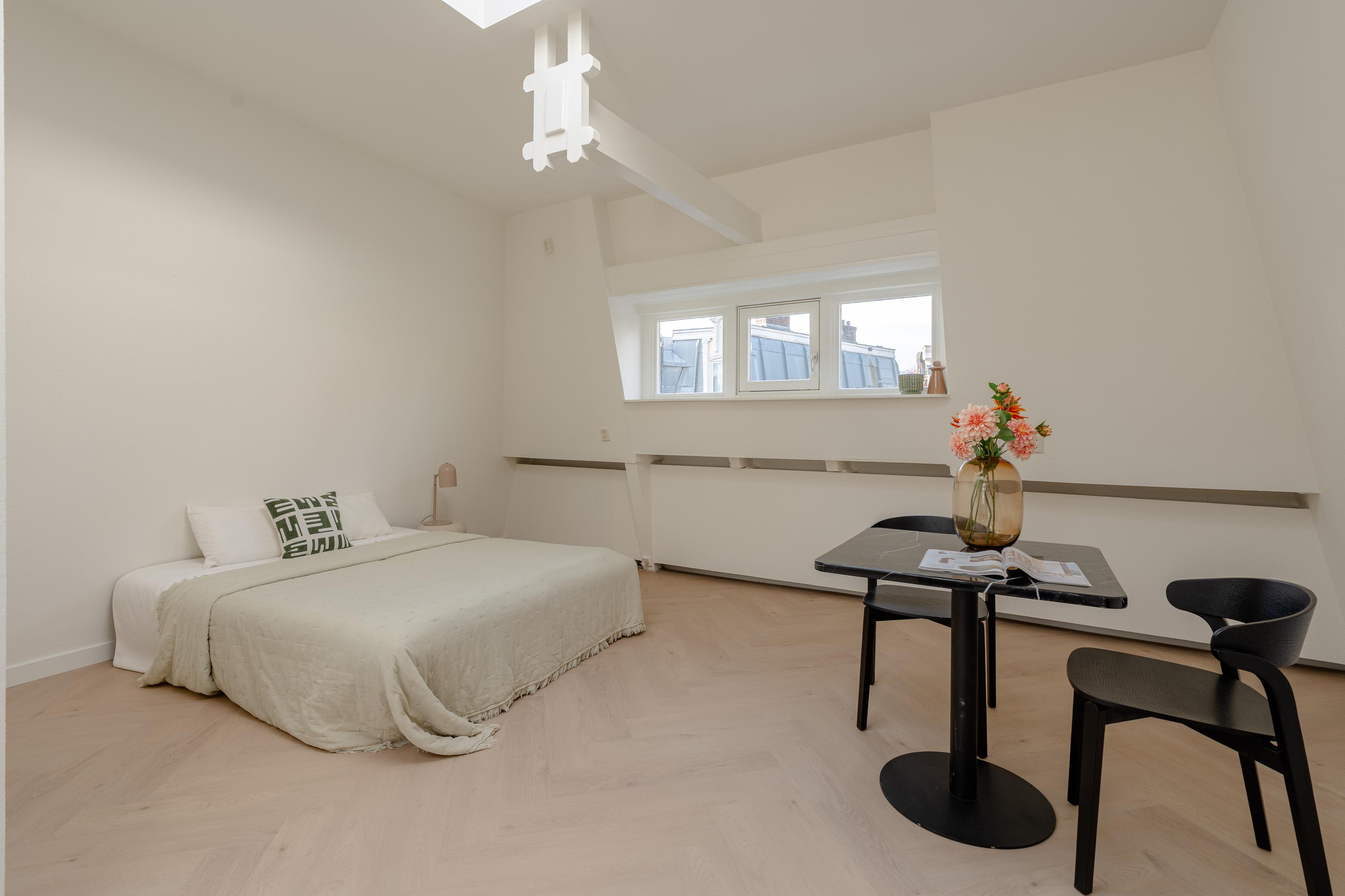 The second bedroom is generously sized and includes built-in wardrobes. At the front is a large bedroom with space for a walk-in closet. French doors open onto a balcony facing Nieuwe Spiegelstraat with a fantastic view.