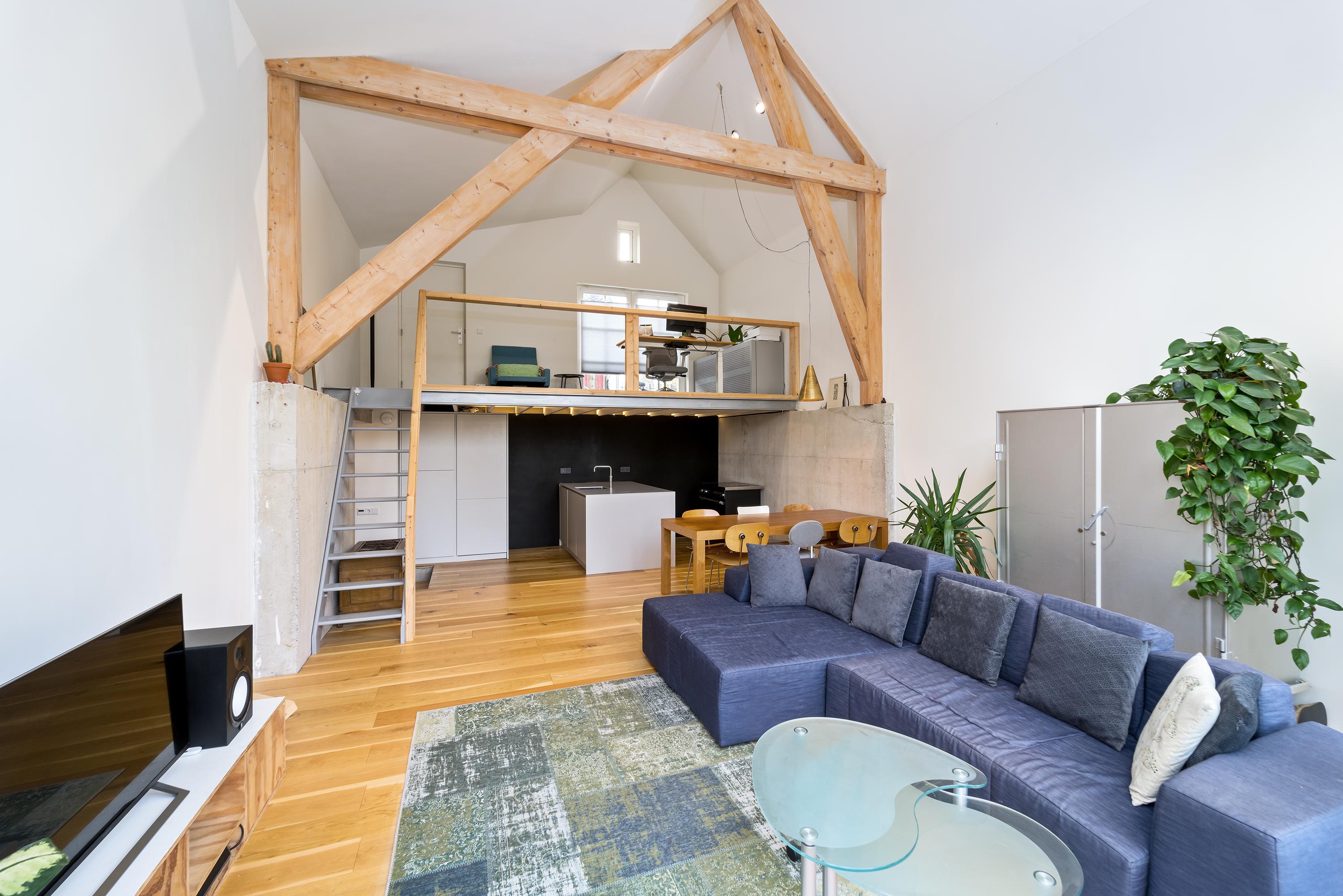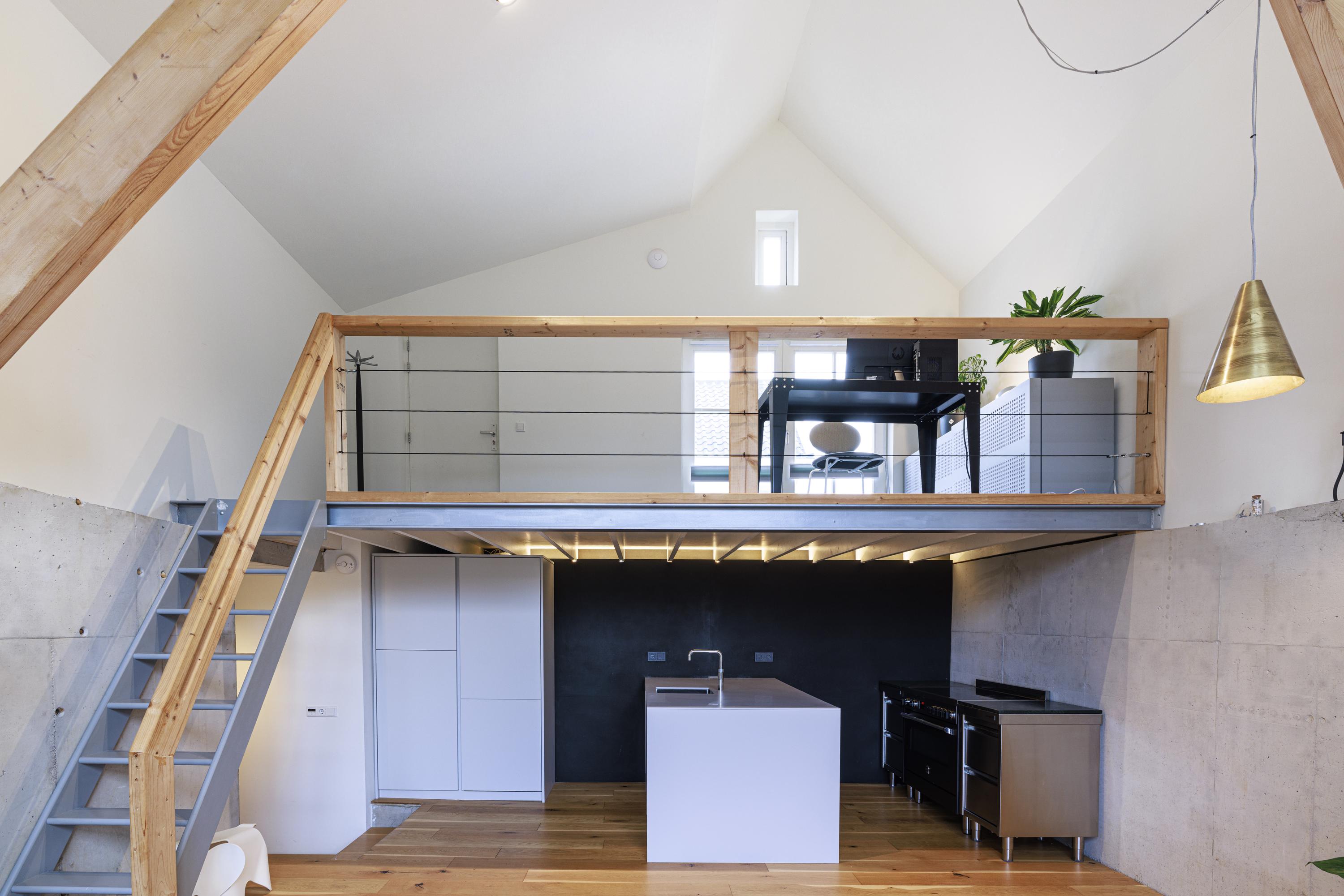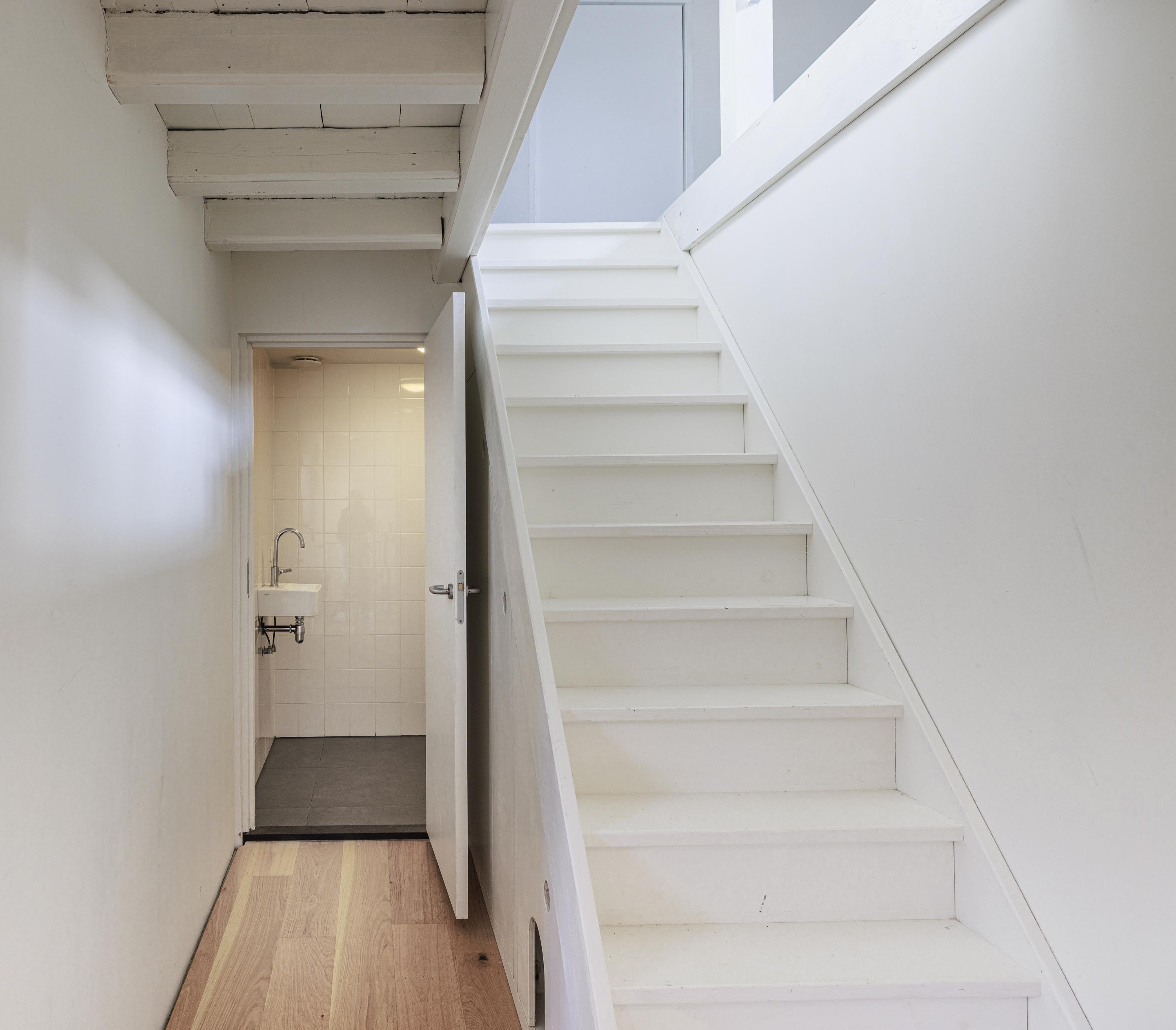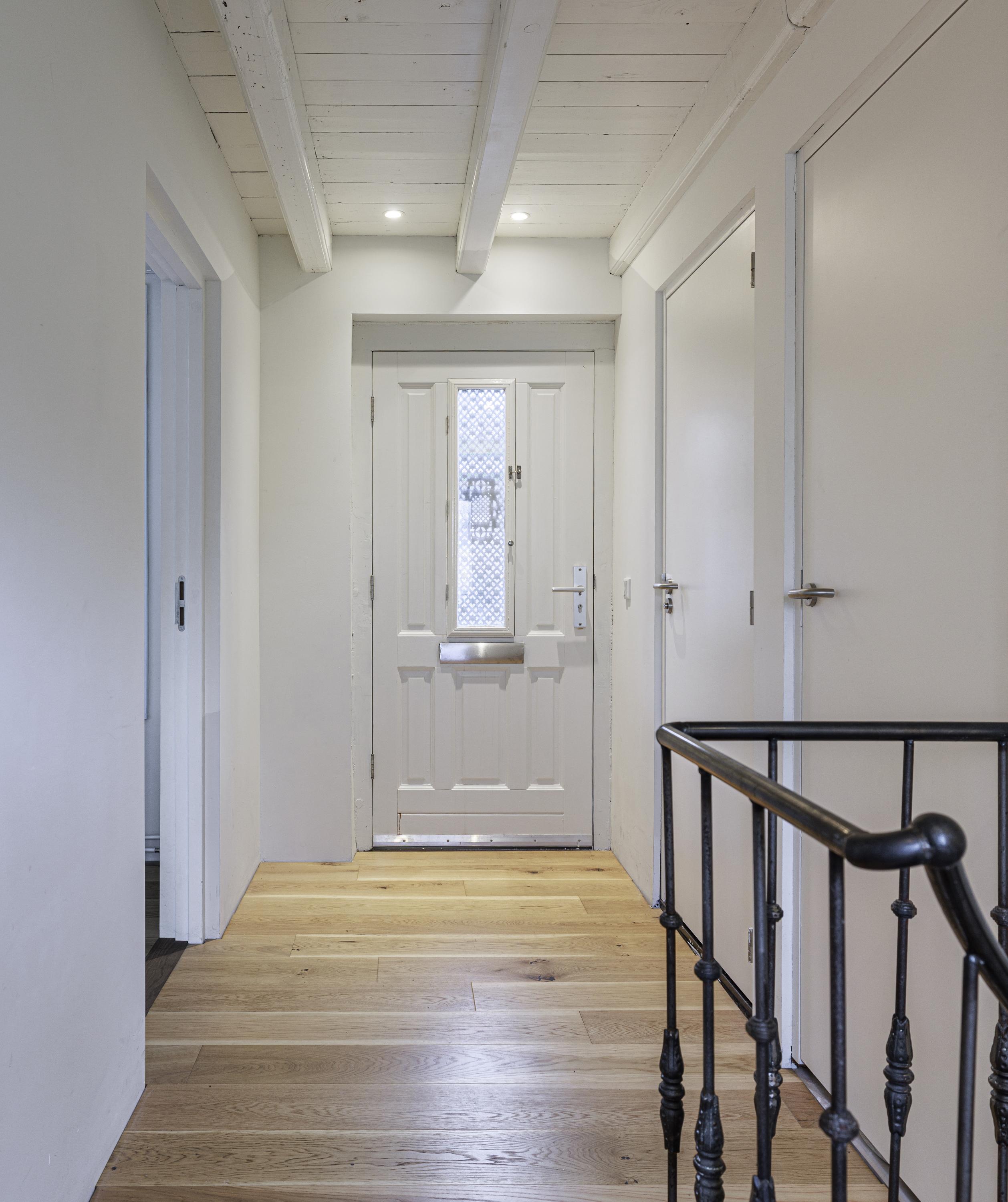 The interior is just as impressive. The new-build and renovation combine old and modern materials in an exciting and harmonious way. Think robust wooden structural beams, raw concrete, oak flooring, classic column radiators, and a striking steel spiral staircase. The finish is of high quality and executed with great attention to detail.