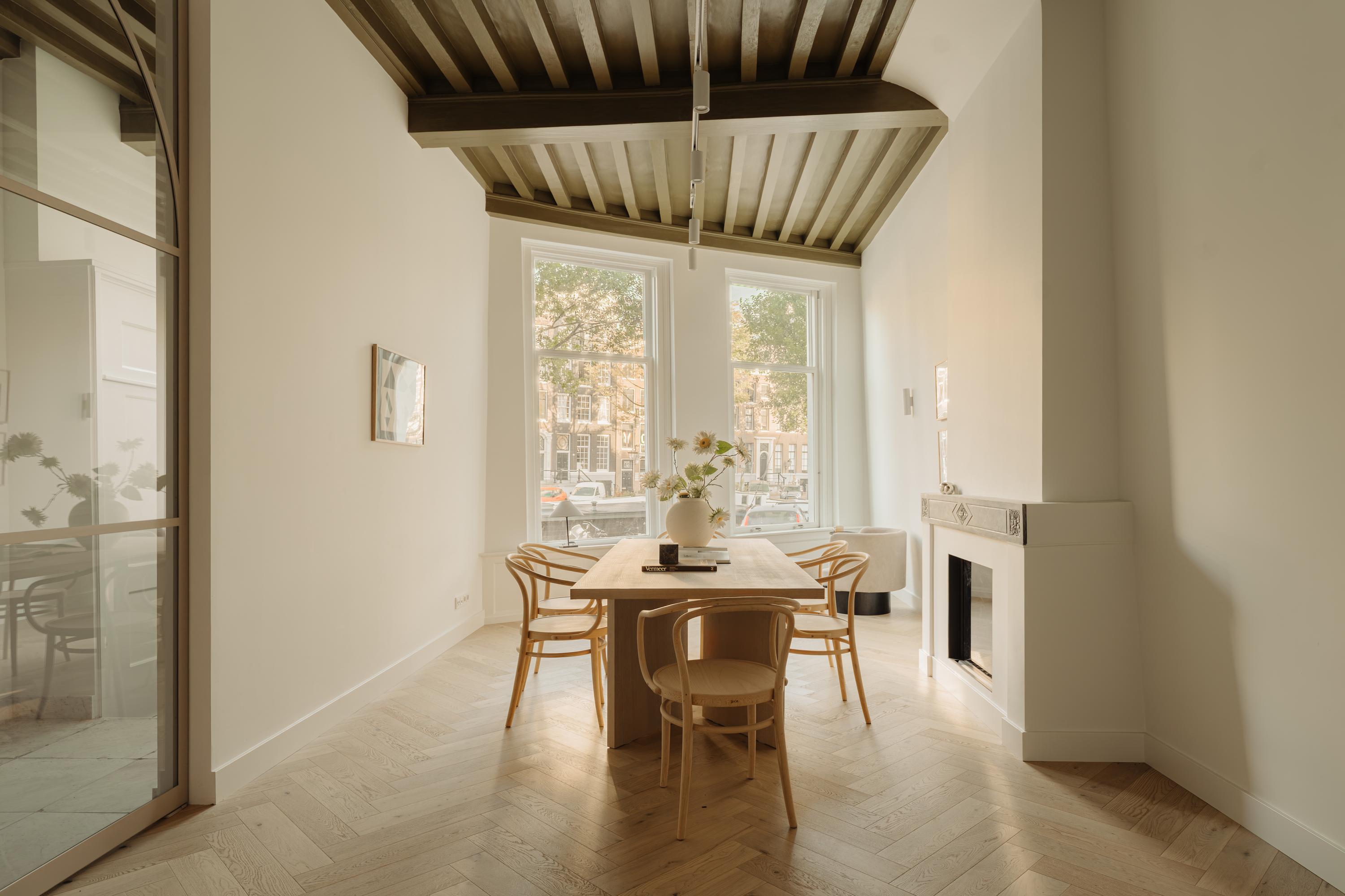 From the hall, you enter the living area. With a ceiling height of over 3.4 metres, original exposed beams, large windows and a beautiful view over the Singel, this is an impressive space where warmth and grandeur meet naturally. Two fireplaces on this floor add an extra sense of homeliness and refinement.