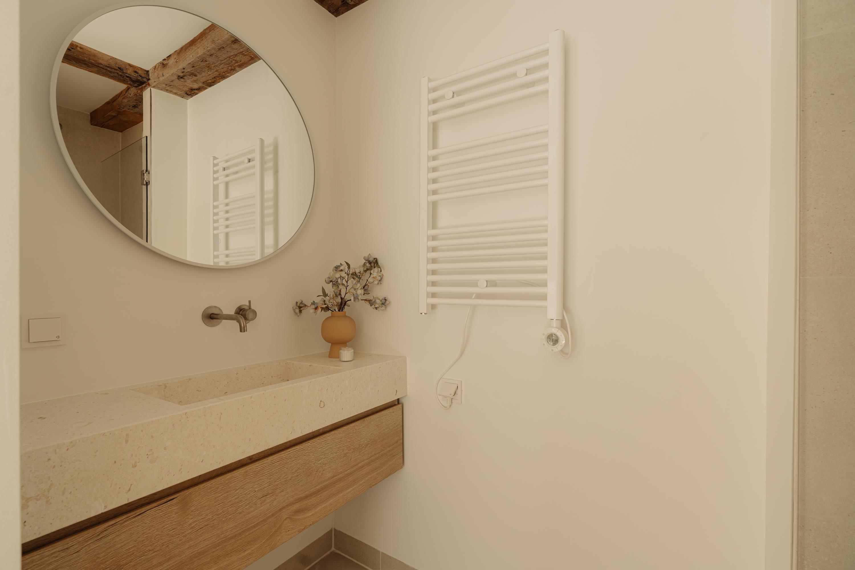 - On the upper floor, a bright bedroom with exposed beams, large windows and a private bathroom with shower, sink and toilet.