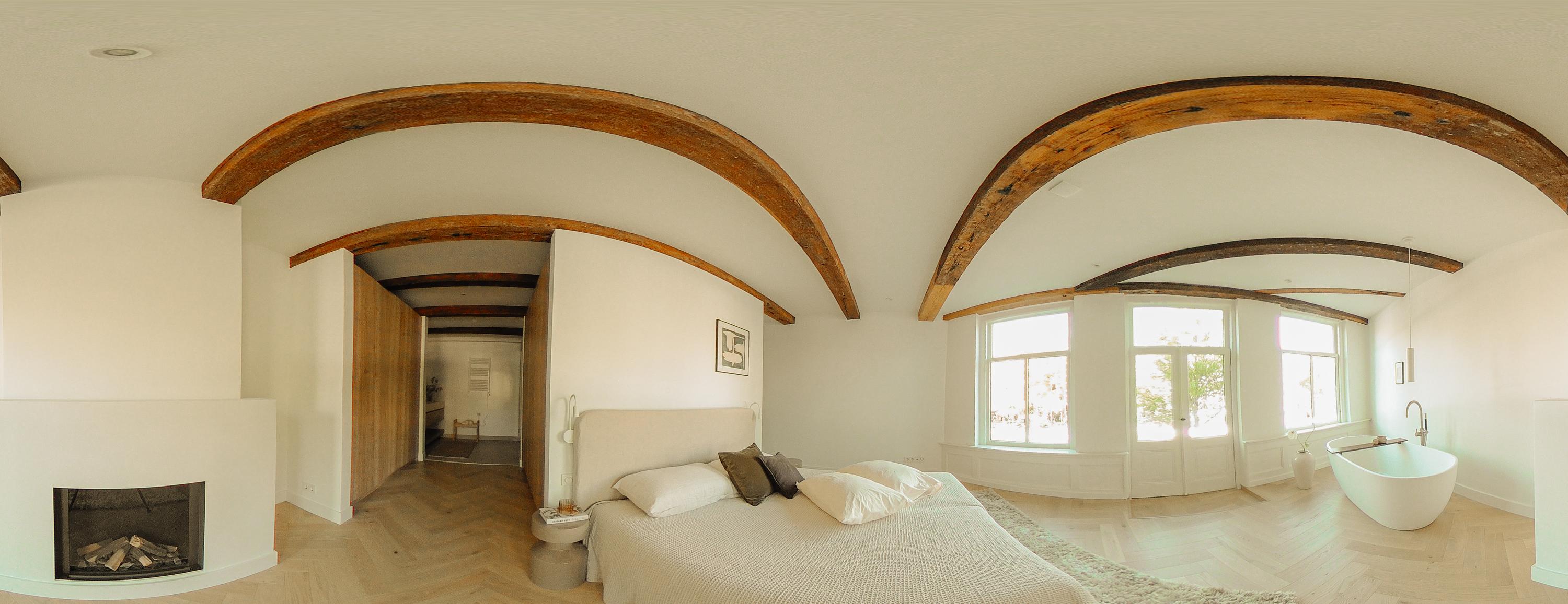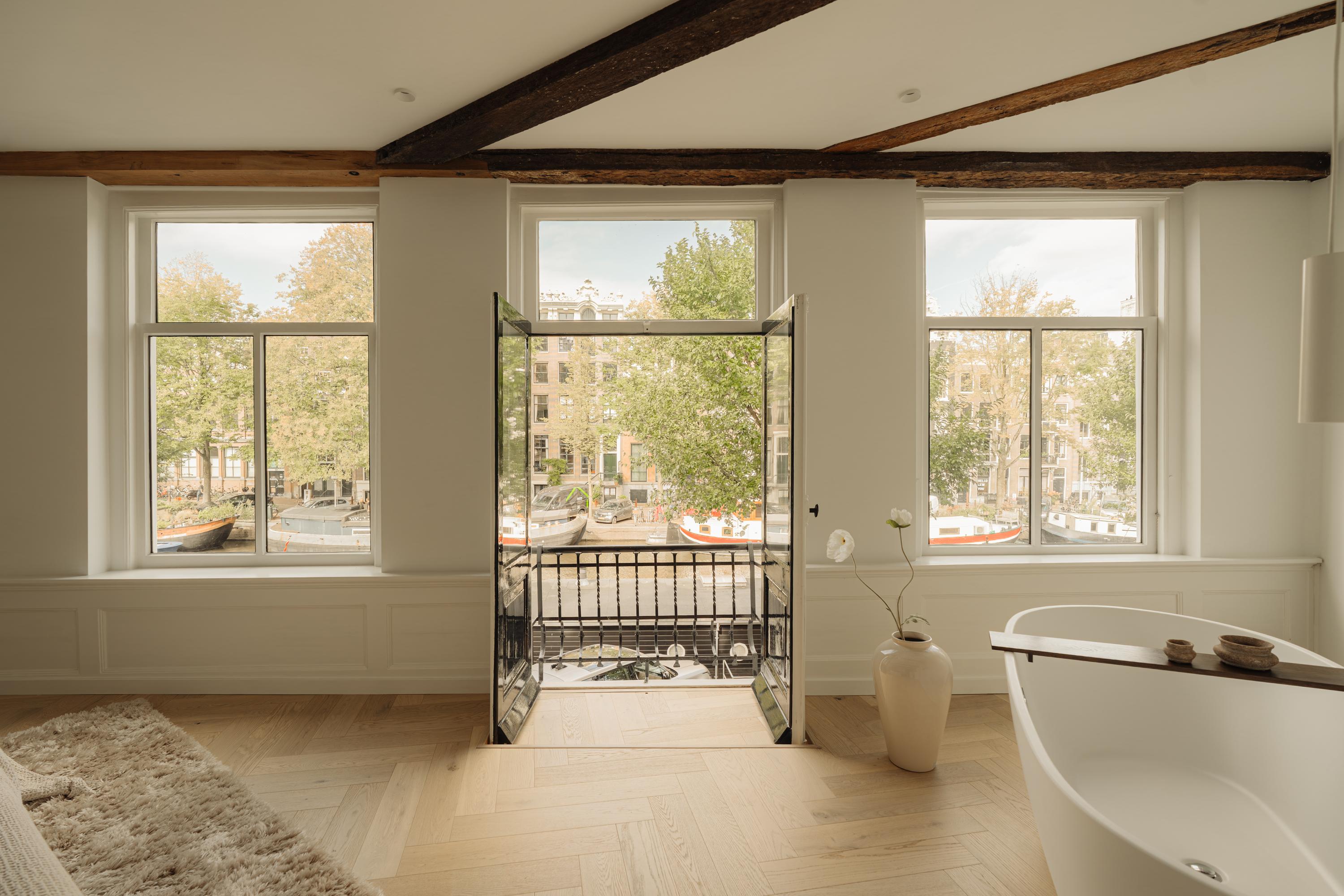The first floor accommodates the primary bedroom at the front, offering canal views and a warm, natural, and serene ambiance thanks to its large windows. A freestanding bathtub by the window, French balcony and fireplace give the space a luxurious and intimate feel.