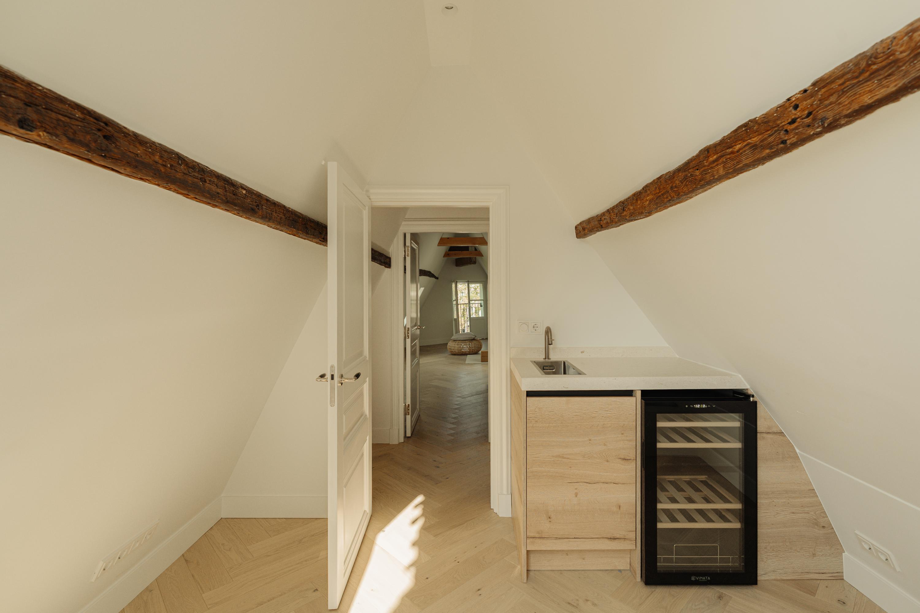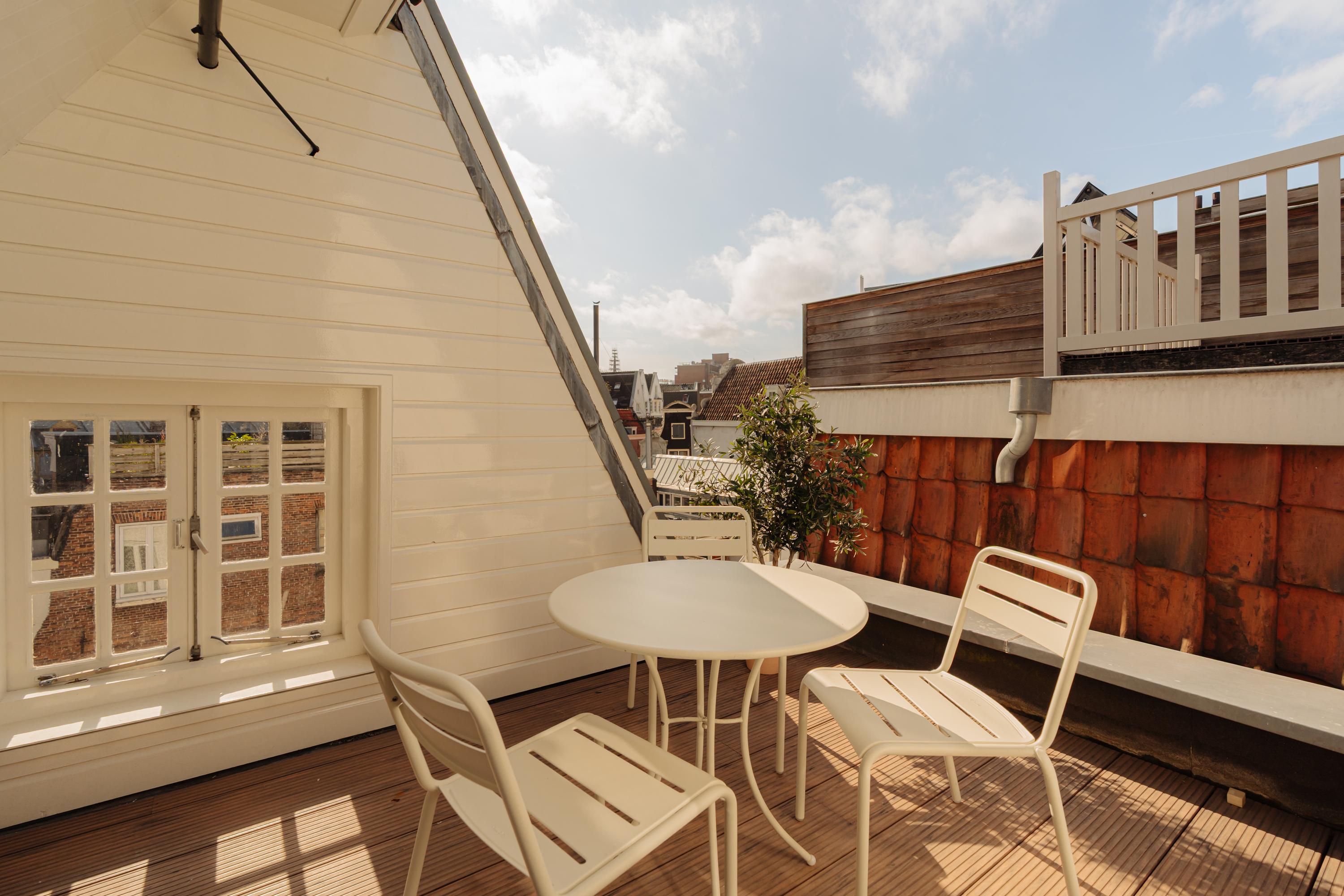 The top floor is divided into two separate rooms. The room at the front is ideal as an additional bedroom or study. The rear room features a pantry with wine cooler and access to the rooftop terrace, where you can enjoy the sun and views over Amsterdam’s historic rooftops and the Dominicus Church — a perfect spot to unwind with a drink.