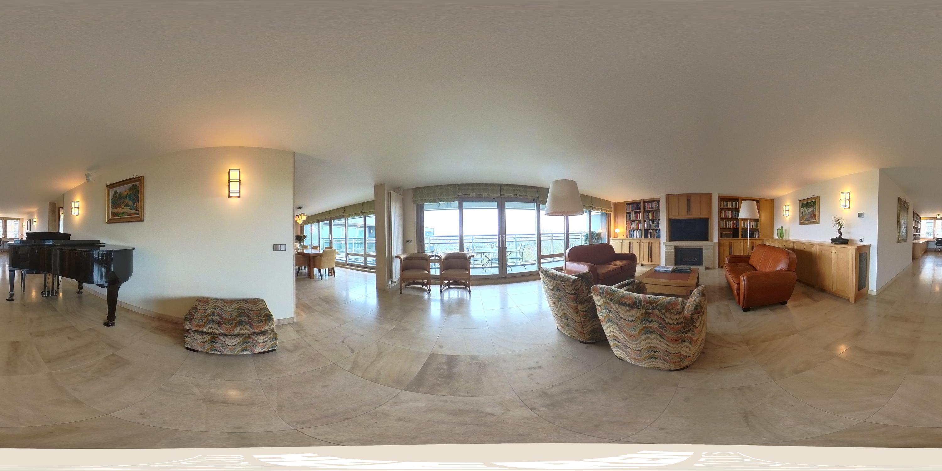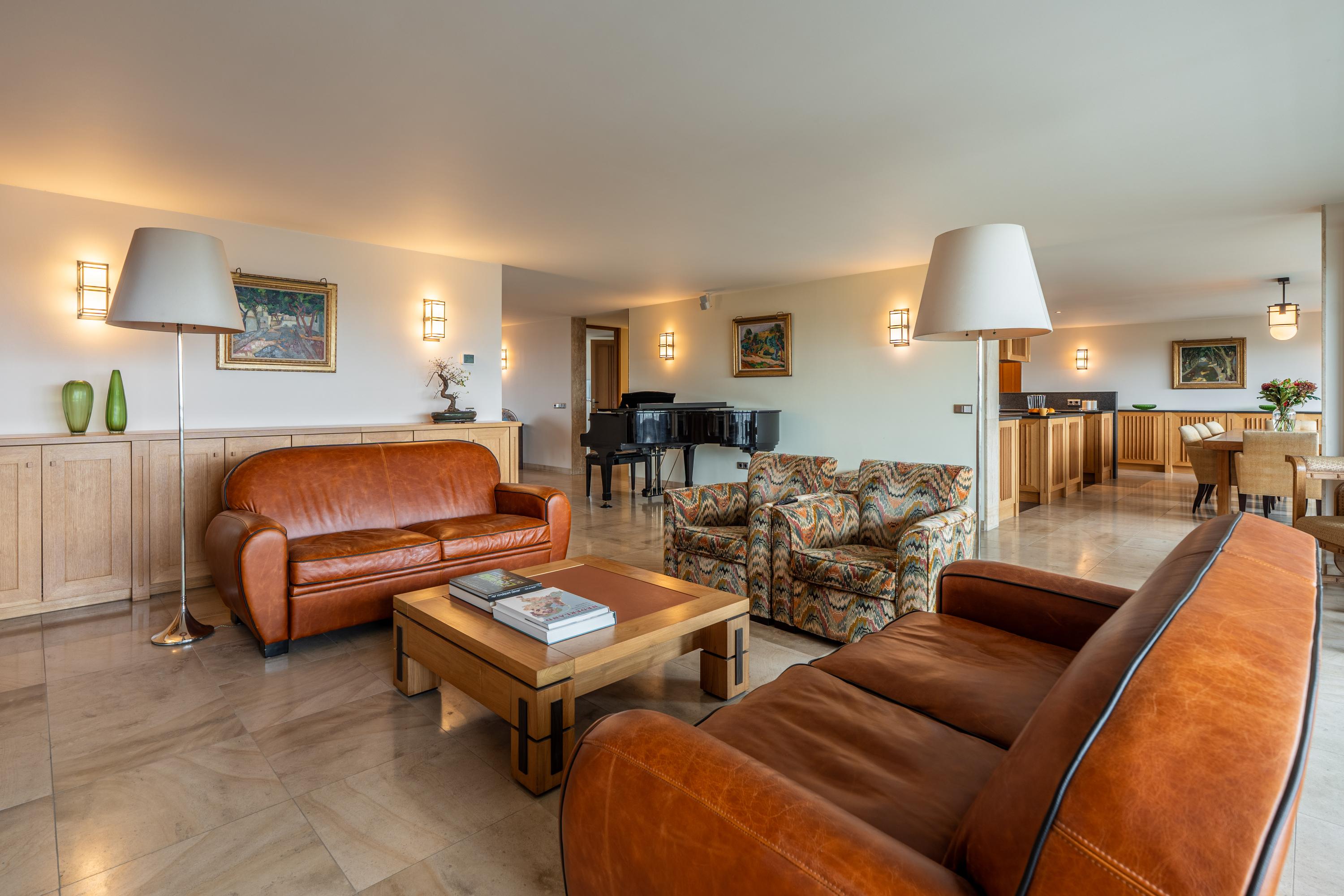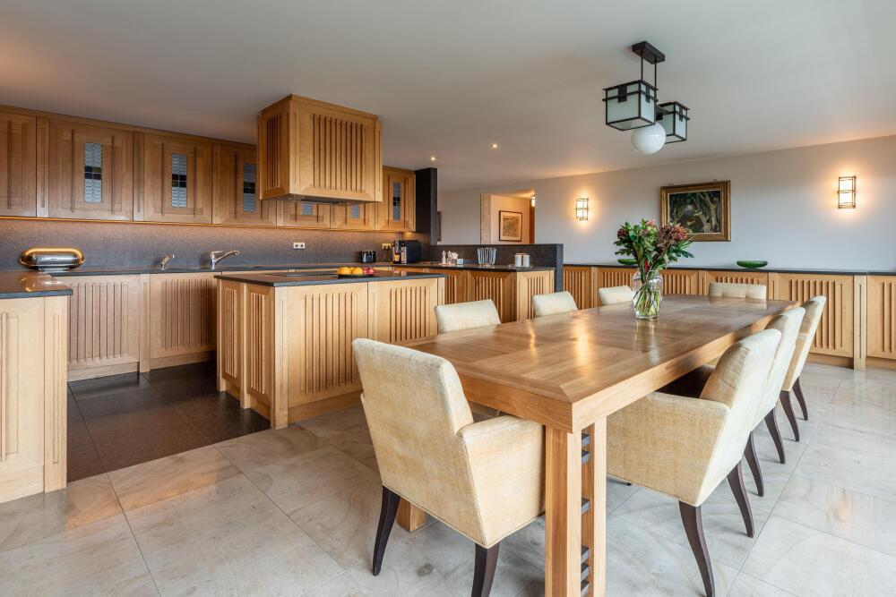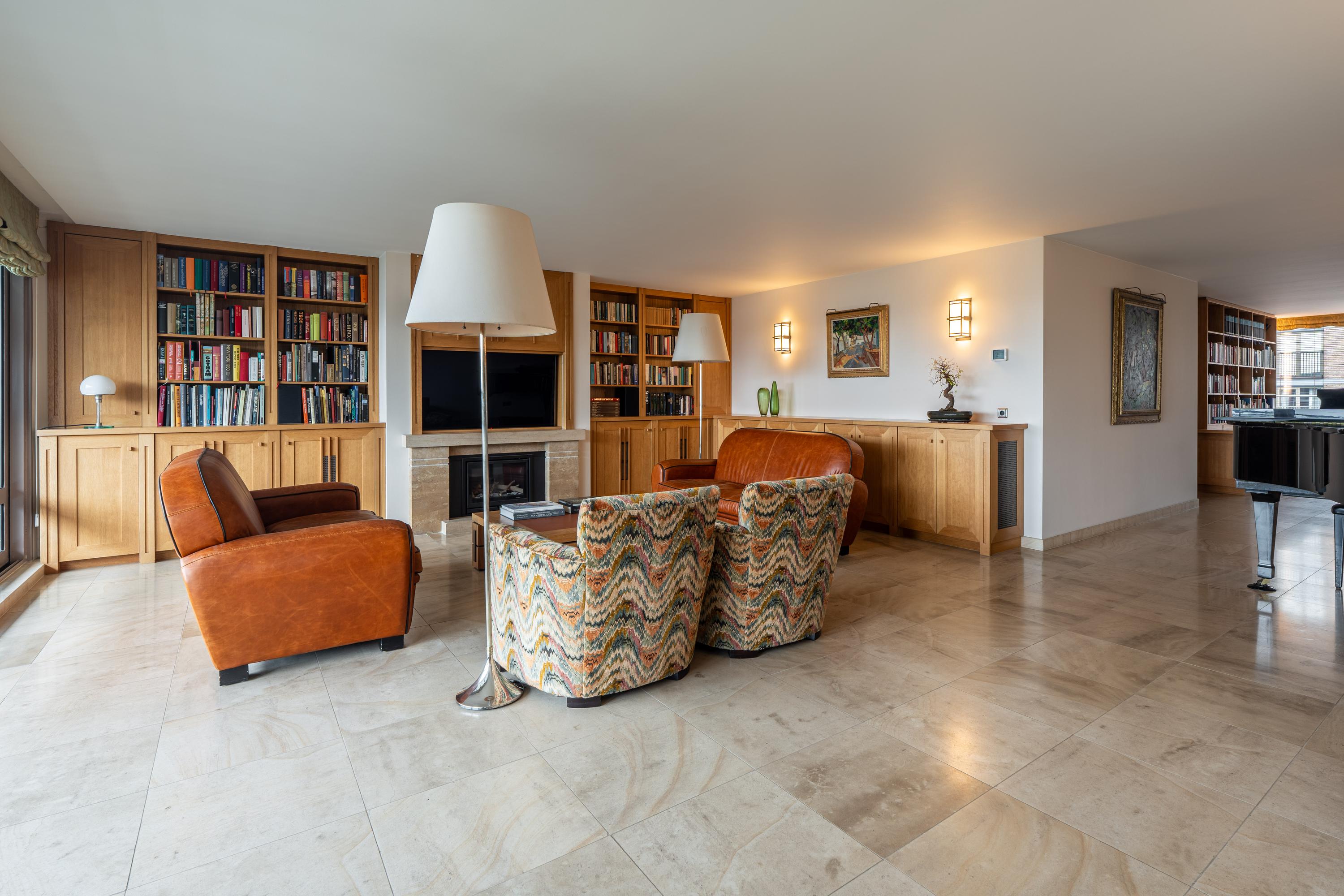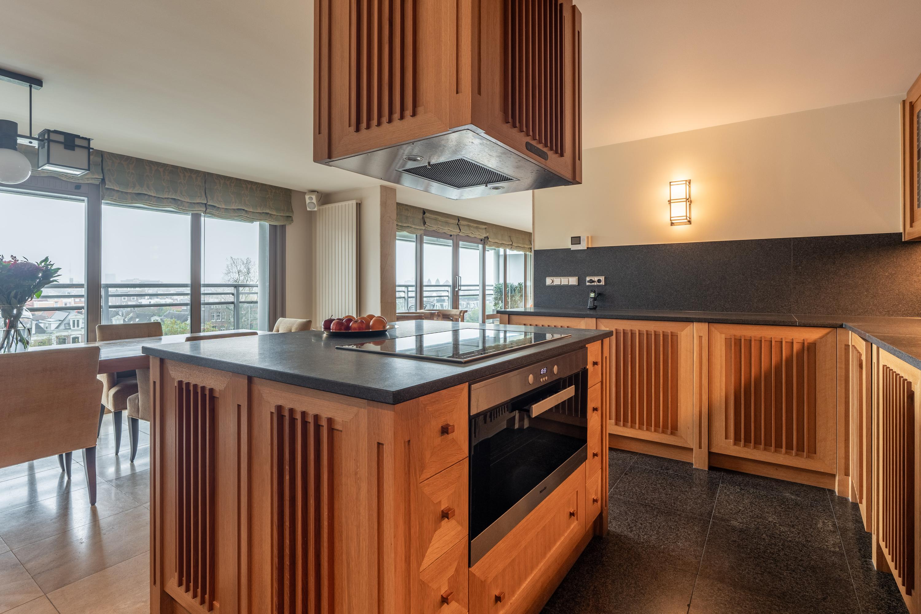 Upon entering, you are greeted by a spacious entrance hall with ample wardrobe storage on the left. From the hall, you proceed to the open-plan kitchen with a dining area. The kitchen features a cooking island with a six-burner induction hob, extractor fan, oven, three refrigerators, microwave, dishwasher, Quooker, and plenty of storage. Floor-to-ceiling glass sliding doors open onto the 25 m² balcony, which is about two meters deep, equipped with electric sunshades, and offers stunning views.