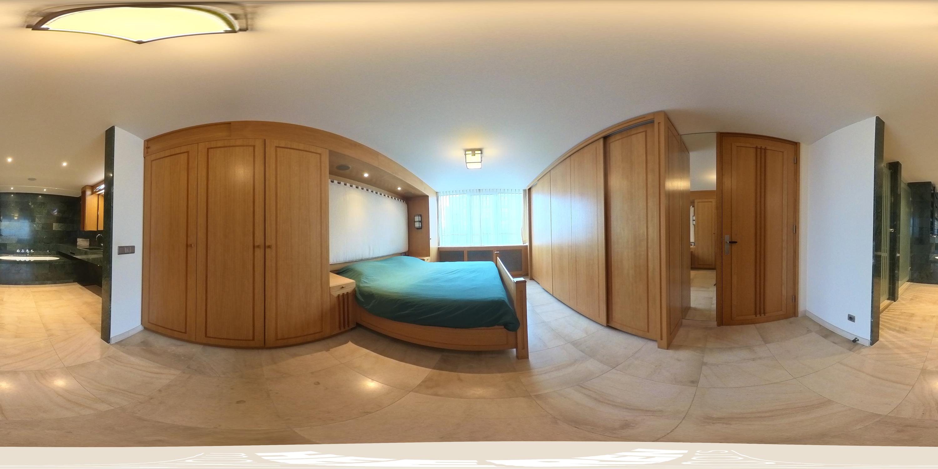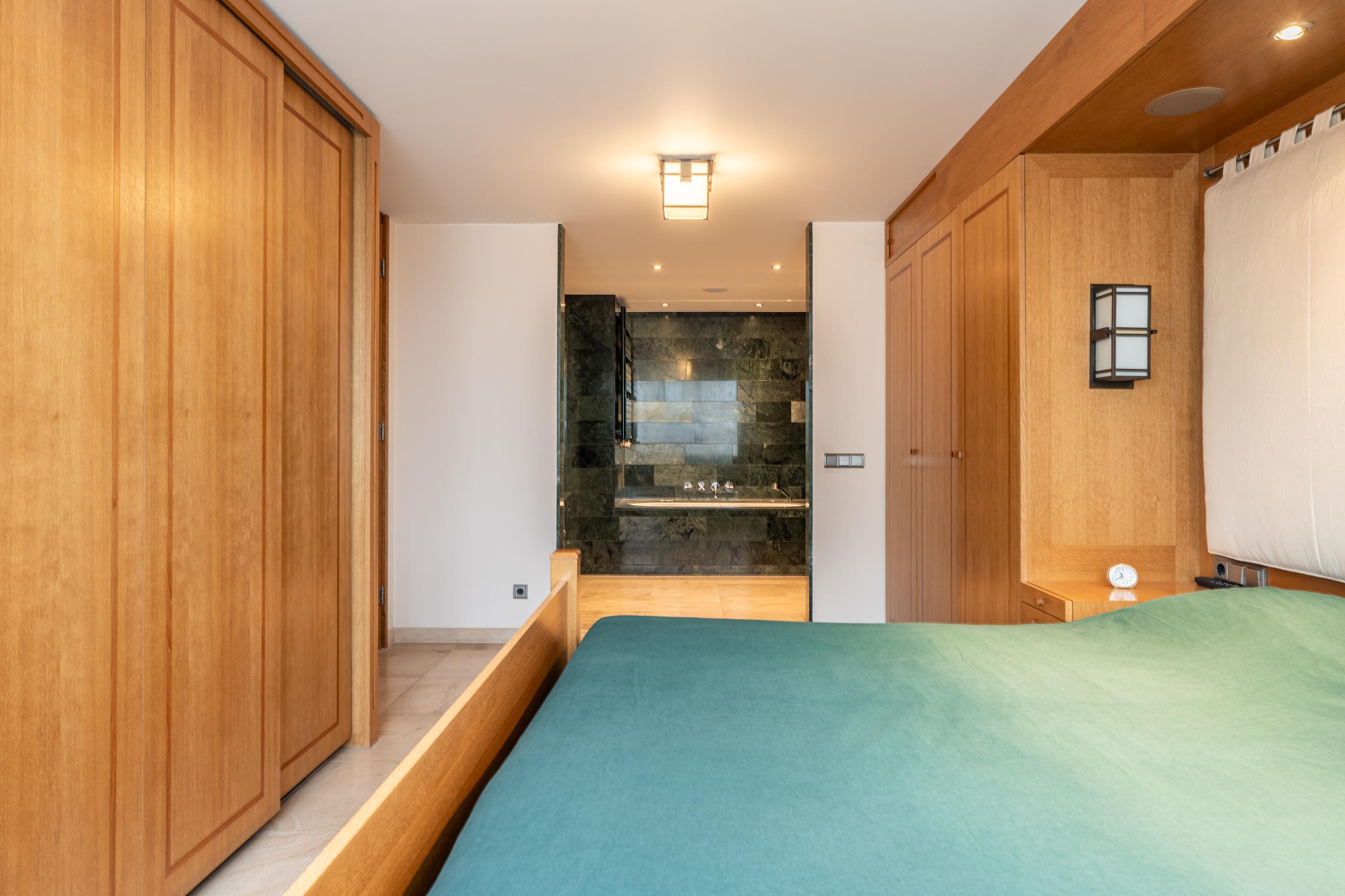 The primary bedroom, located in the northwest corner, includes spacious built-in wardrobes, air conditioning, built-in speakers, and an en-suite bathroom. The bathroom features exquisite green marble, a double vanity unit, a bathtub with a showerhead, a toilet, and a walk-in shower.