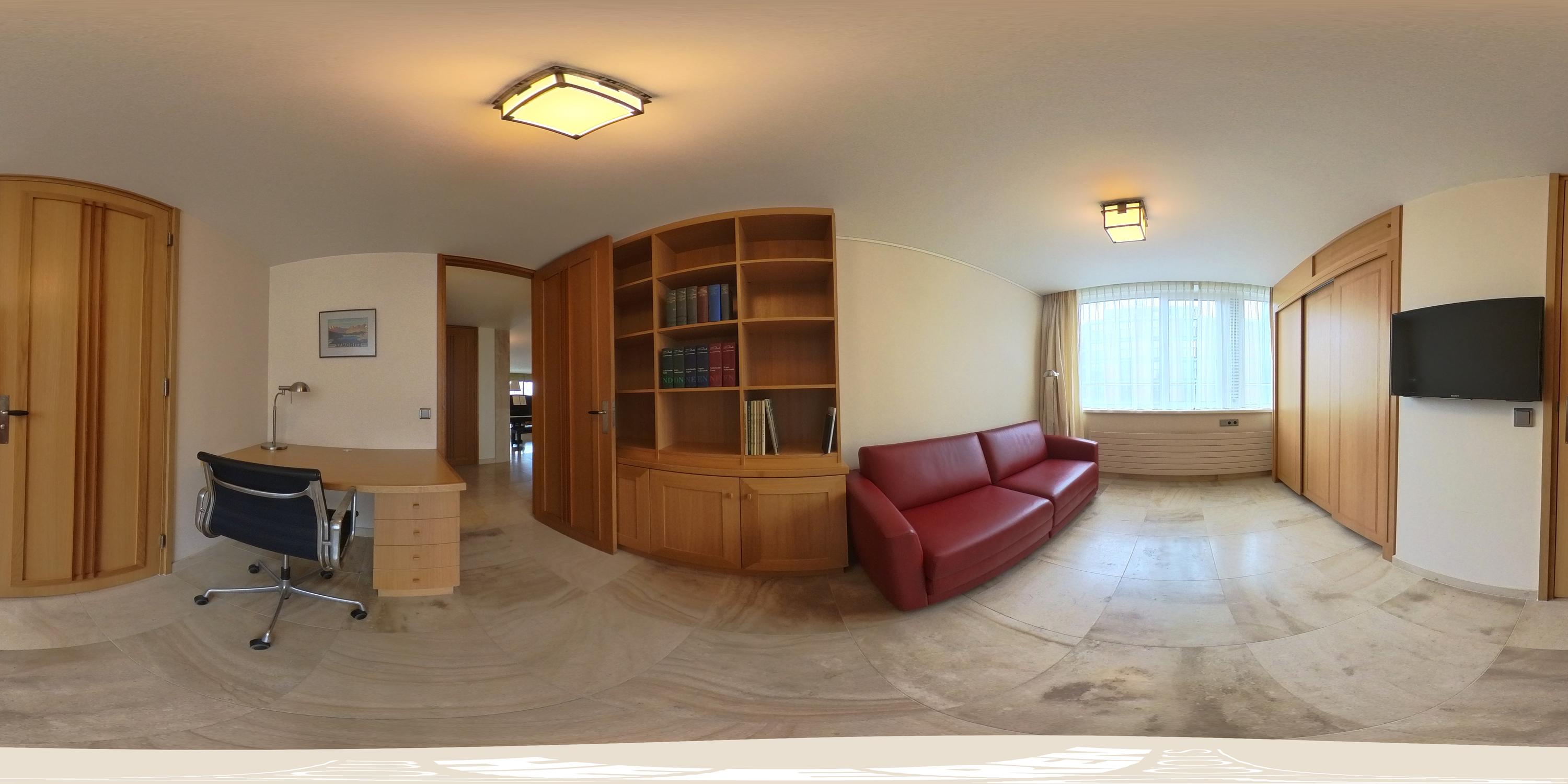 Next to the dining area is the expansive living room with a gas fireplace and built-in cabinetry. The TV can be concealed behind a wooden sliding panel, creating the perfect ambiance for cozy evenings by the fire. Adjacent to the living area is a comfortable workspace with ample storage.