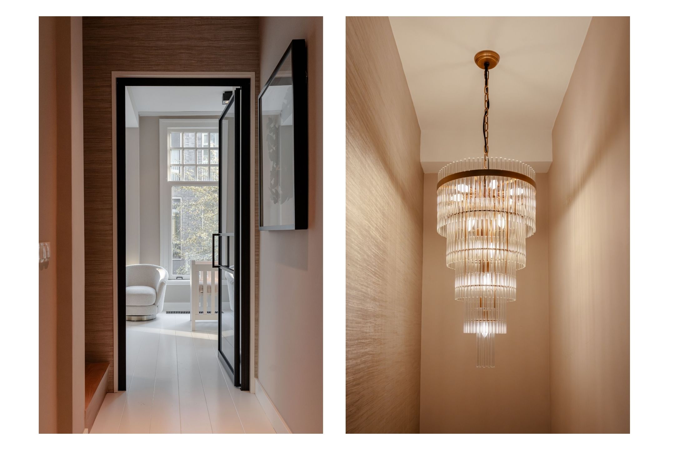 The modern kitchen is situated at the back and is equipped with an induction hob with integrated extraction, refrigerator, freezer, oven, combi-oven, dishwasher and a sink with Quooker tap. Both the kitchen and dining area provide access to the terrace through French doors. From the terrace, a staircase leads down to the spacious rear garden, a delightful outdoor area with plenty of room for lounge seating, a dining table and a safe play space for children.
