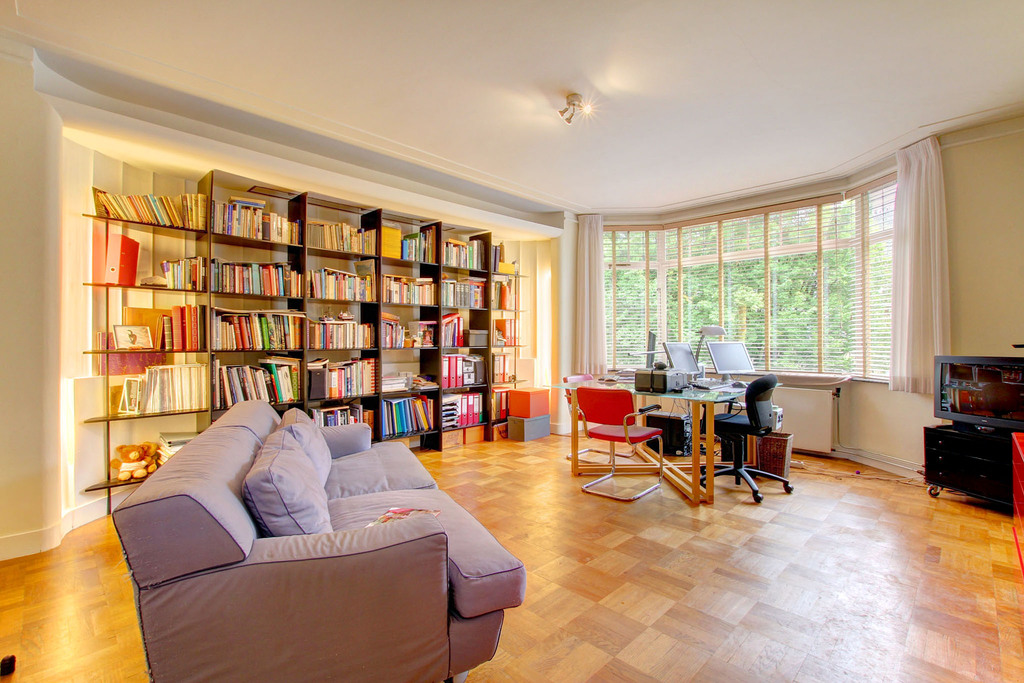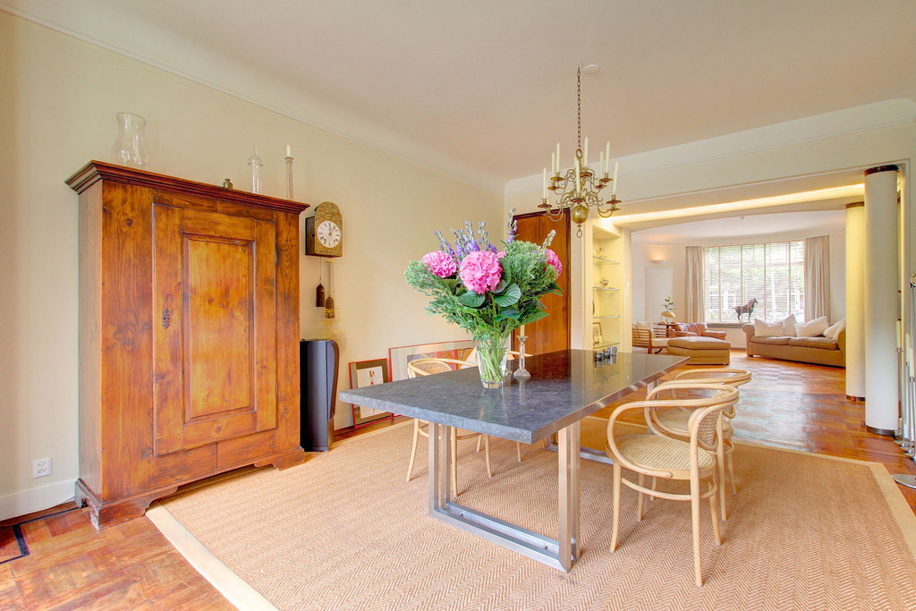 From the hallway, double opening palissander wooden doors lead to the generous living and dining room. This impressive living space is characterised by a beautiful bay window at the front and French doors at the rear opening directly onto the garden. Several built-in wardrobes provide practical storage space.