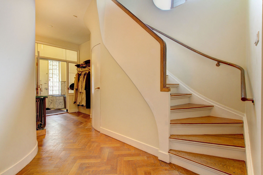 The original wide staircase with oak parquet leads up to the second floor.
