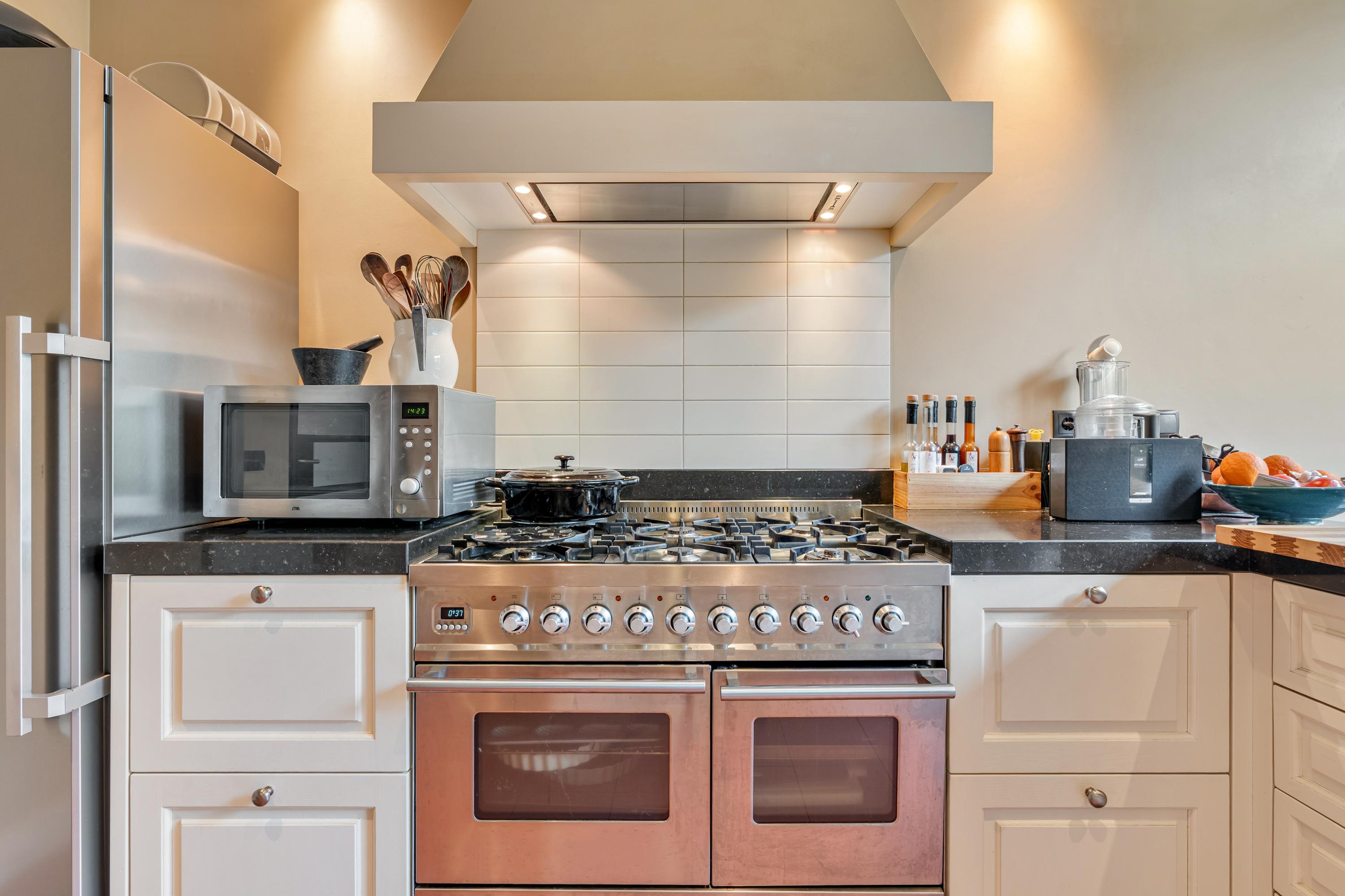 At the rear of the property is the enclosed kitchen, also with access to the garden. The kitchen has a spacious layout and is equipped with a gas stove, extractor hood, a freestanding fridge-freezer and ample cupboard space. There is also room for a small dining table.