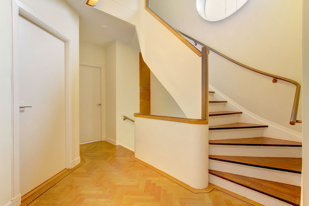 Through the entrance you enter the spacious reception hall, which leads via an opal glass door to the central hallway. This hallway is exceptionally bright thanks to a round window between the ground floor and first floor, creating beautiful natural light in the stairwell.