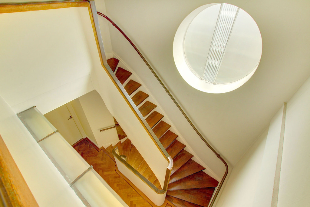 The property is largely fitted with oak parquet flooring on the ground and first floors and features original ironmongery and authentic details throughout. The stairwell is in its original condition and is beautifully lit by two round windows and a skylight, contributing to the unique atmosphere of the home.