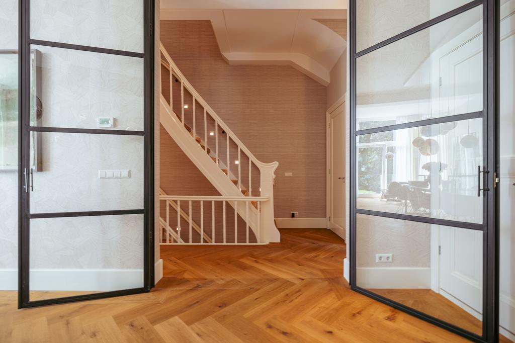 The entrance features a marble-accented vestibule with an imposing steel door that opens into the central hallway with a separate guest toilet. The expansive living area spans the full length of the home and is elegantly divided with original en-suite doors featuring built-in cabinetry.