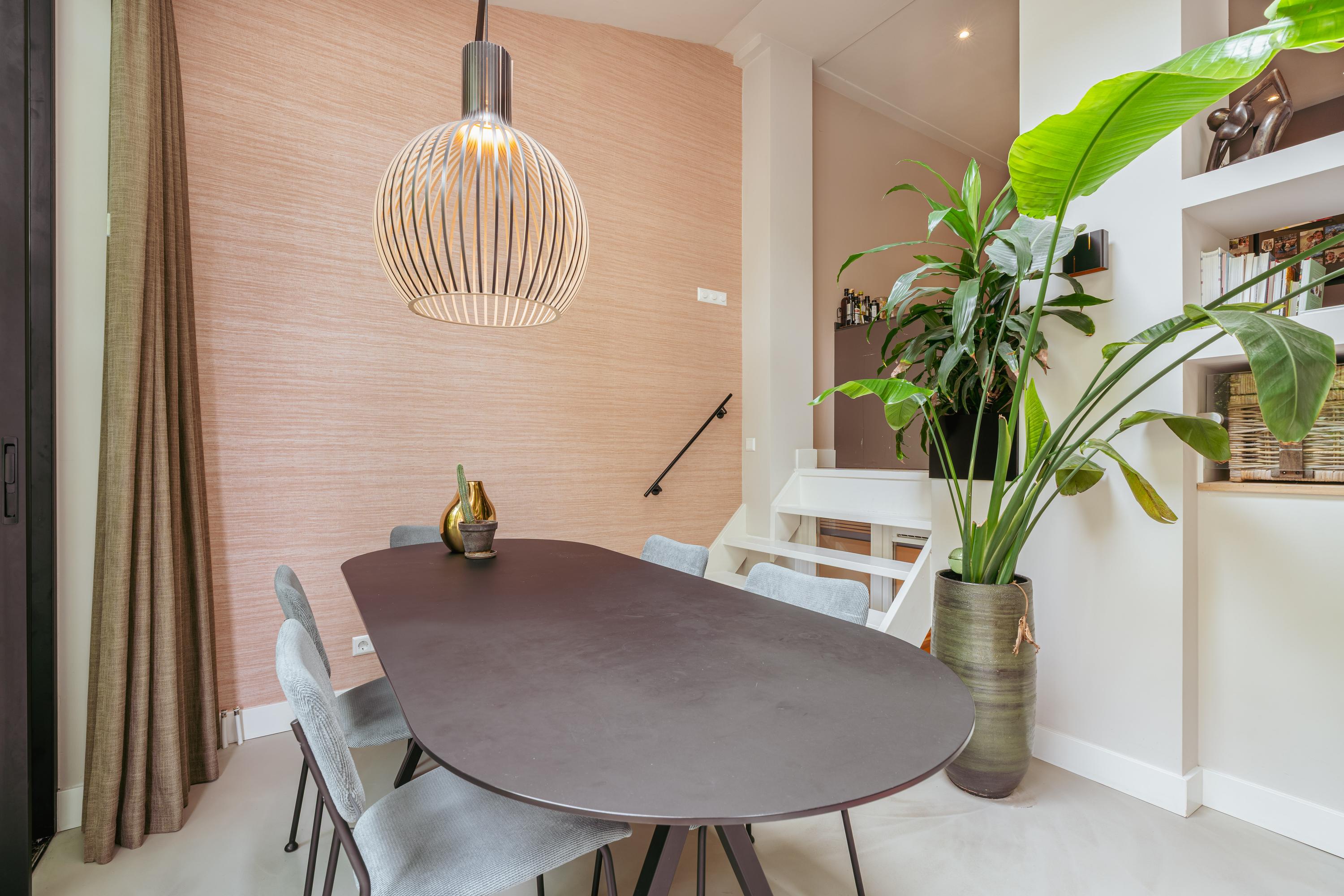 At the front of the property, you'll find the spacious living room, easily large enough to accommodate a comfortable seating area. Centrally located is the open kitchen, featuring a stylish cooking island and cozy bar area. The kitchen is equipped with high-quality built-in appliances, including a 4-burner induction hob with integrated extractor, dishwasher, fridge/freezer combination, combi-oven, and a Quooker.