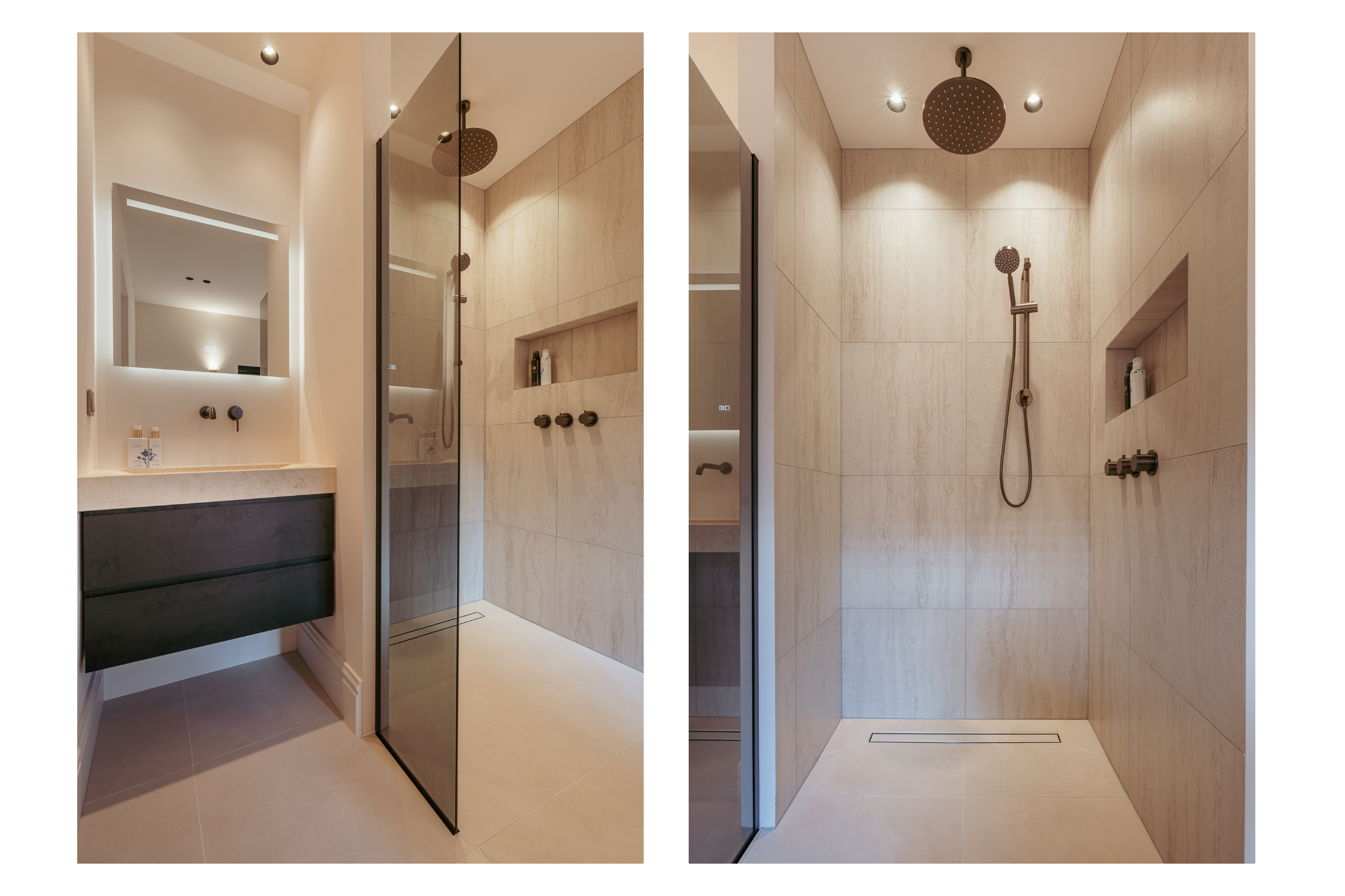 From the hallway, you have access to the bathroom and two bedrooms. The first, at the front, is multifunctional and perfectly suited as a children’s room, study, or home office. This room also houses the renewed meter cupboard with 3-phase connection. At the rear is the master bedroom, fitted with elegant built-in wardrobes and with direct access to the luxurious bathroom. The bathroom is equipped with a Villeroy & Boch bathtub, walk-in shower, and a stylish natural stone washbasin. A smart integrated sliding door allows you to separate the bathroom from the bedroom if desired.