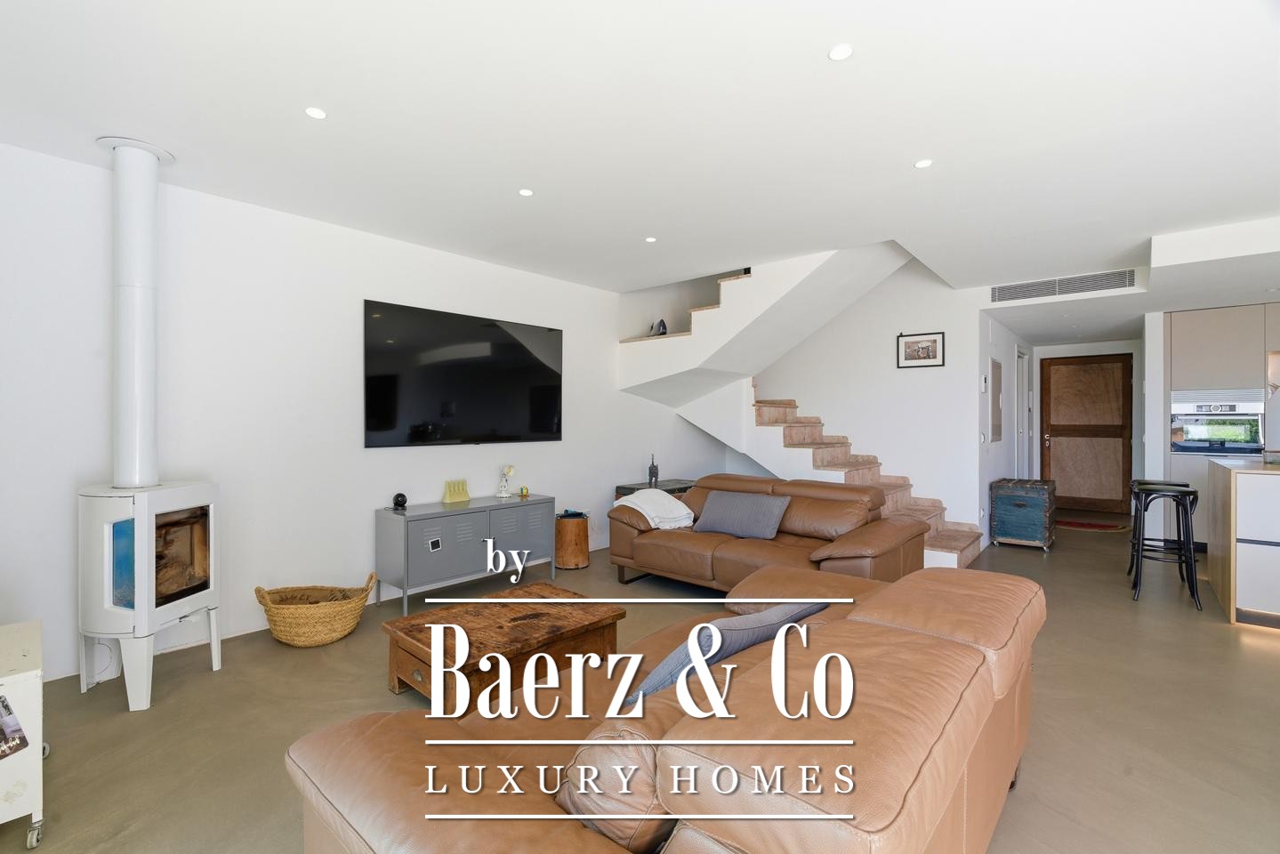 The ground floor features a thoughtfully arranged open-plan living, kitchen, and dining area unified by microcement flooring, high quality windows, and a cast iron stove. Three bedrooms and two bathrooms, including a well-appointed primary suite with en-suite and walk-in wardrobe, provide private retreats, while additional details such as centralized air conditioning and fitted wardrobes elevate daily convenience.