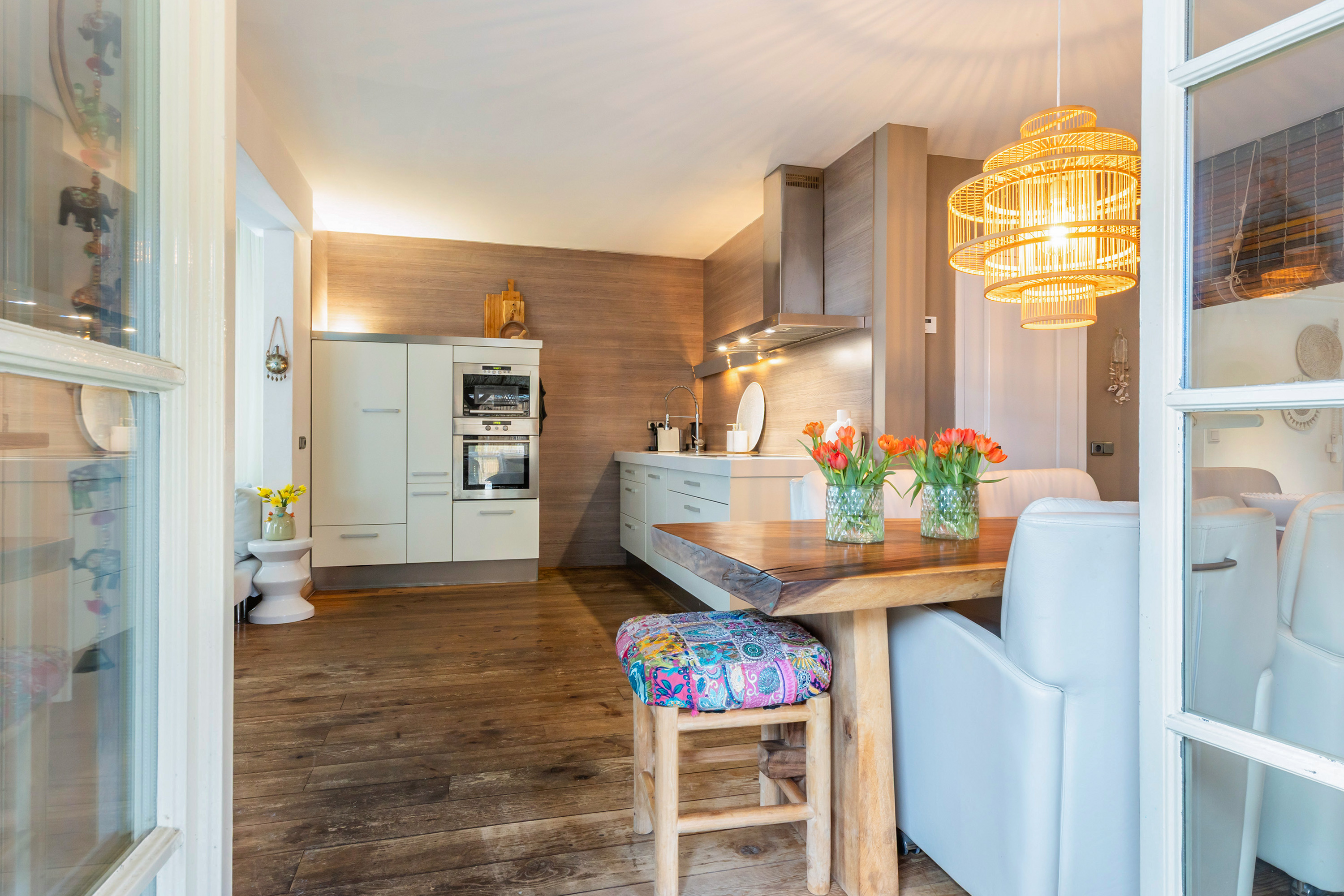 There is ample space for a large dining table with eight chairs, and the double French doors connect the kitchen directly with the veranda in the side garden. This creates a seamless transition between indoor and outdoor living. The veranda has a sunny appearance thanks to the wooden decking and wooden louvre screens which also serve as sun protection. It is an ideal place for outdoor dining and enjoying time with friends and family.