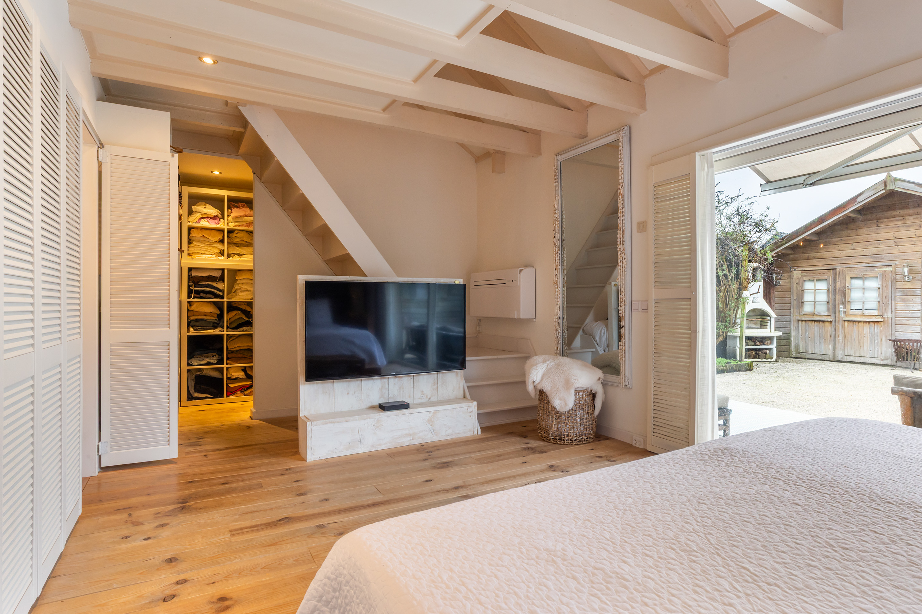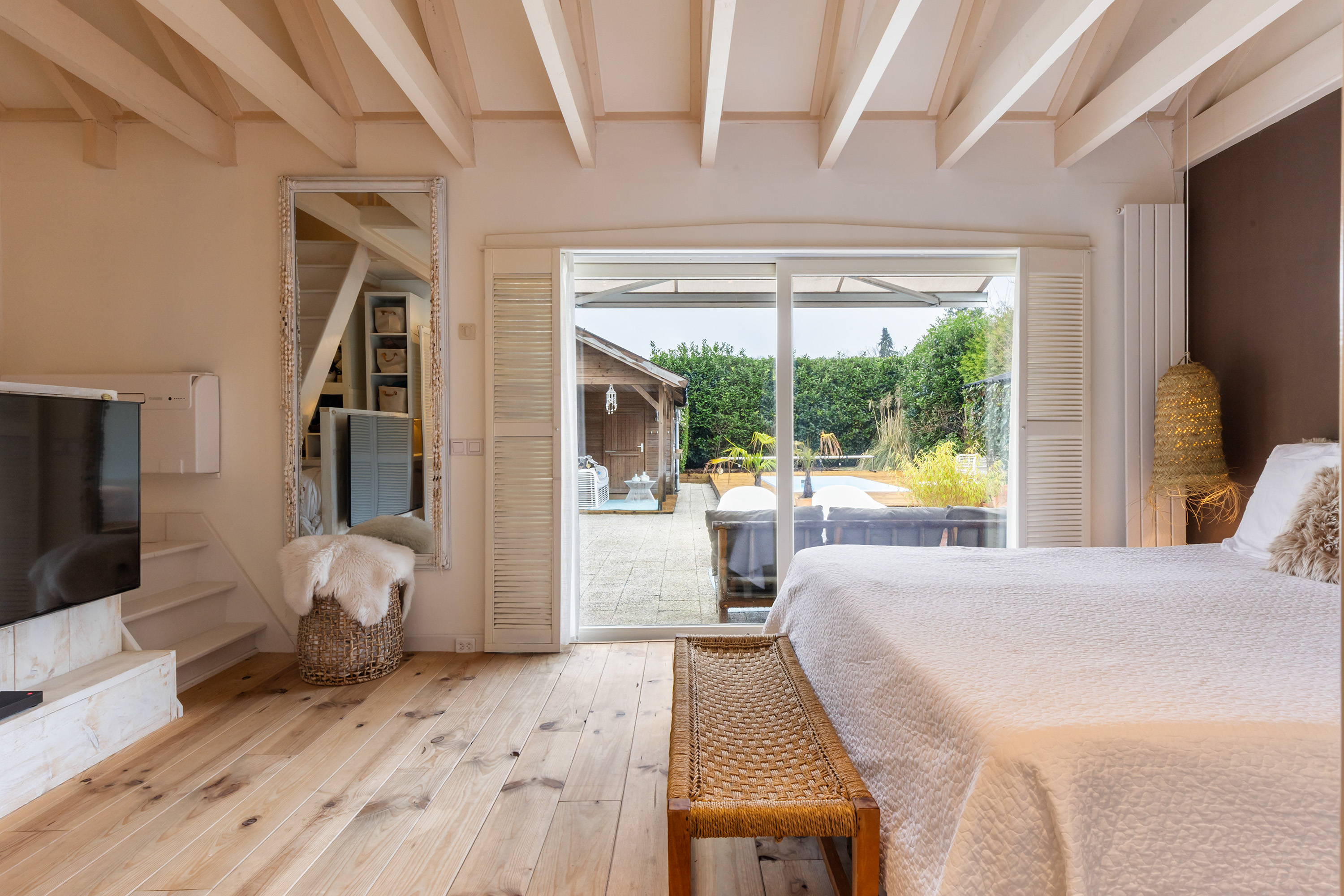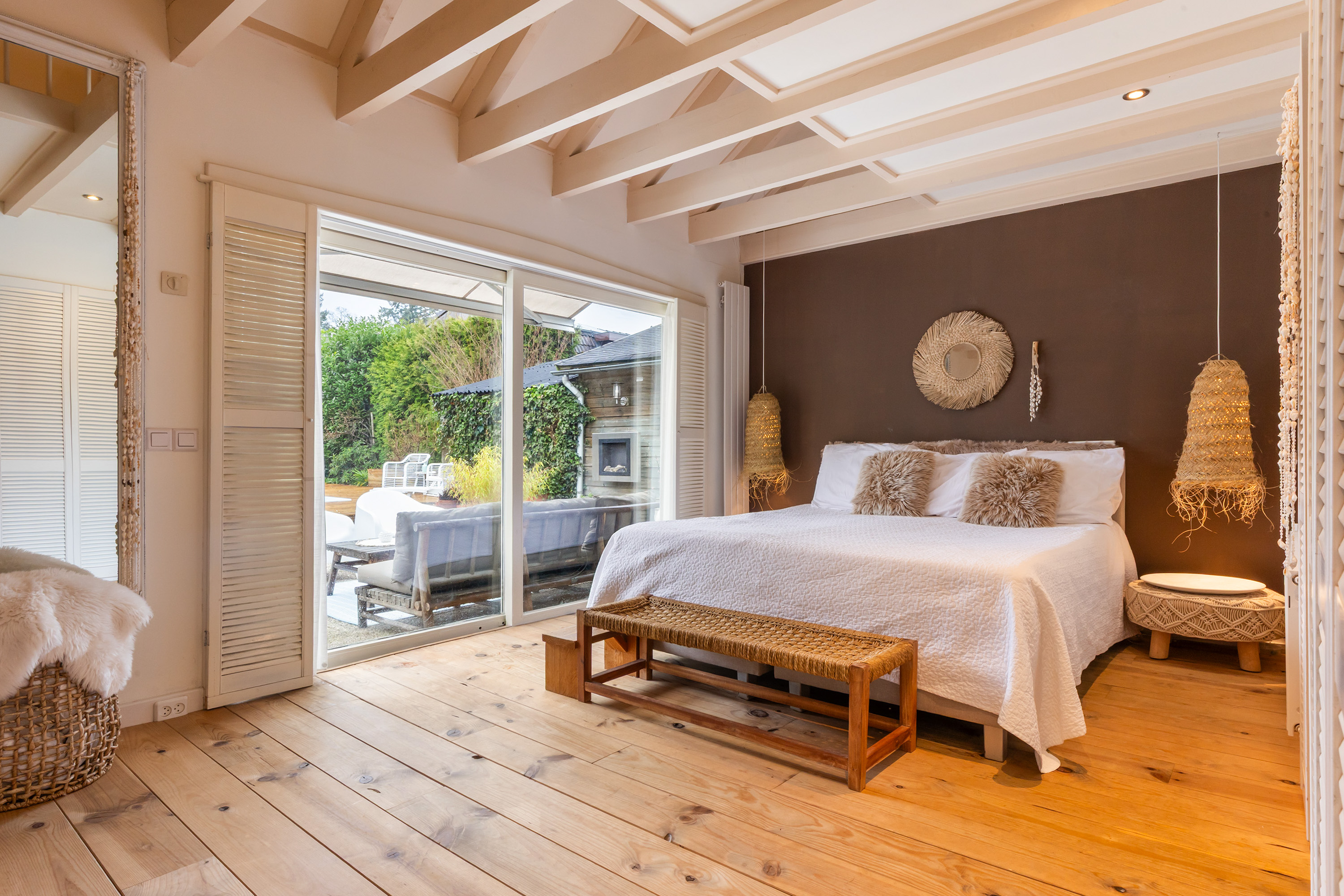 From the bedroom, sliding doors provide direct access to the garden.
