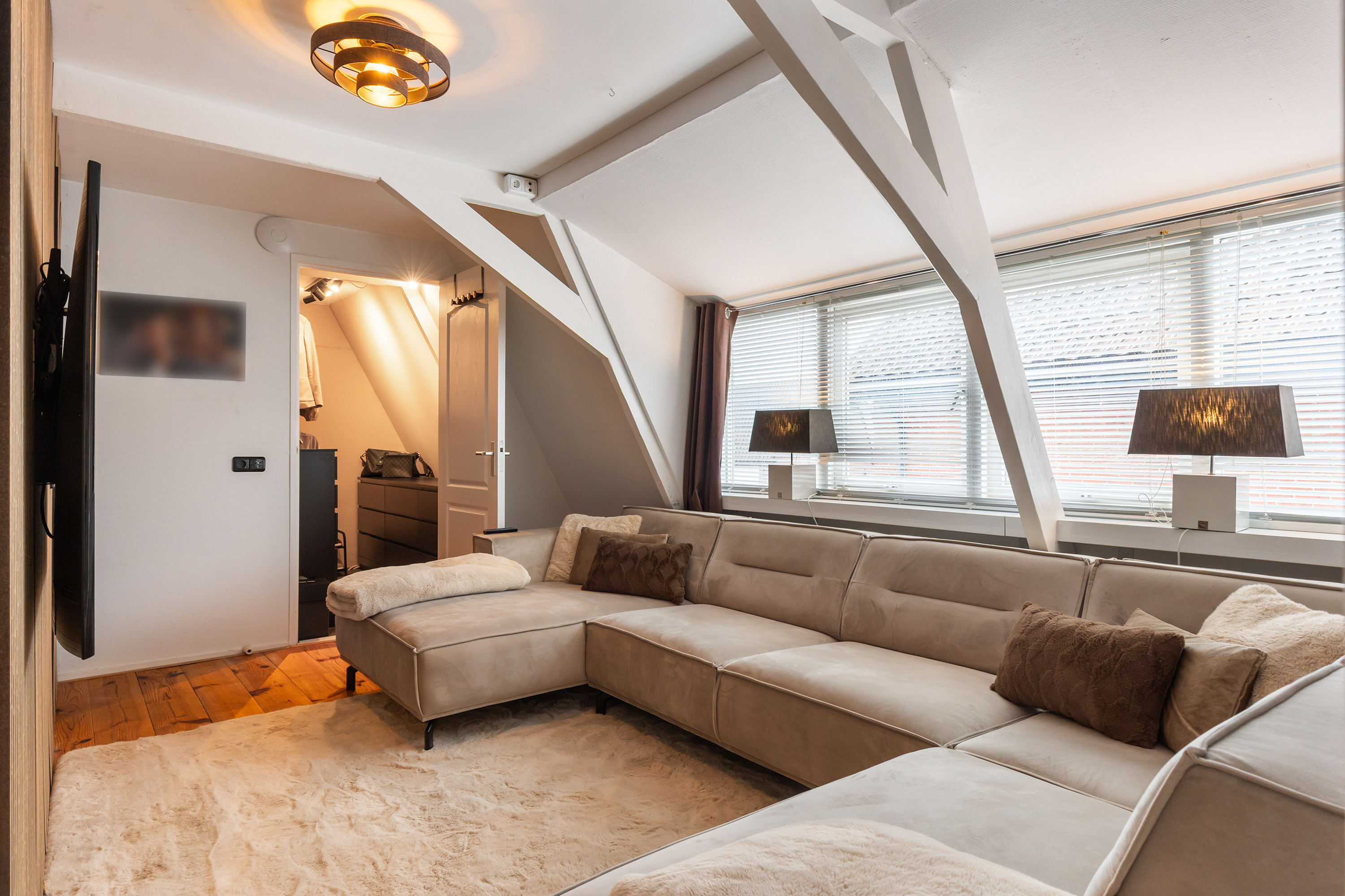 Throughout this level the original beams, sloping ceilings, wide dormer windows and wooden floors have been preserved, giving the spaces a warm and authentic character.