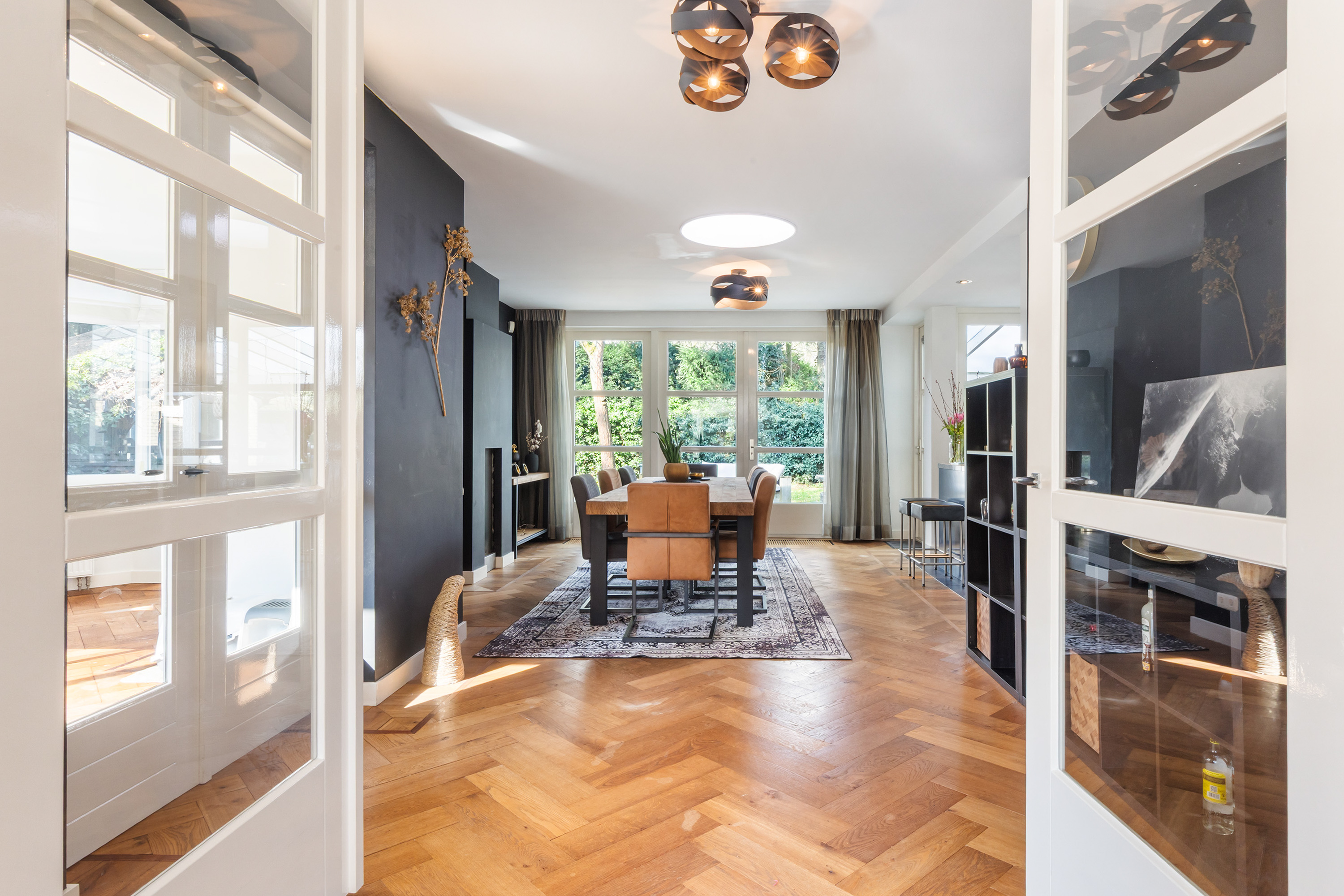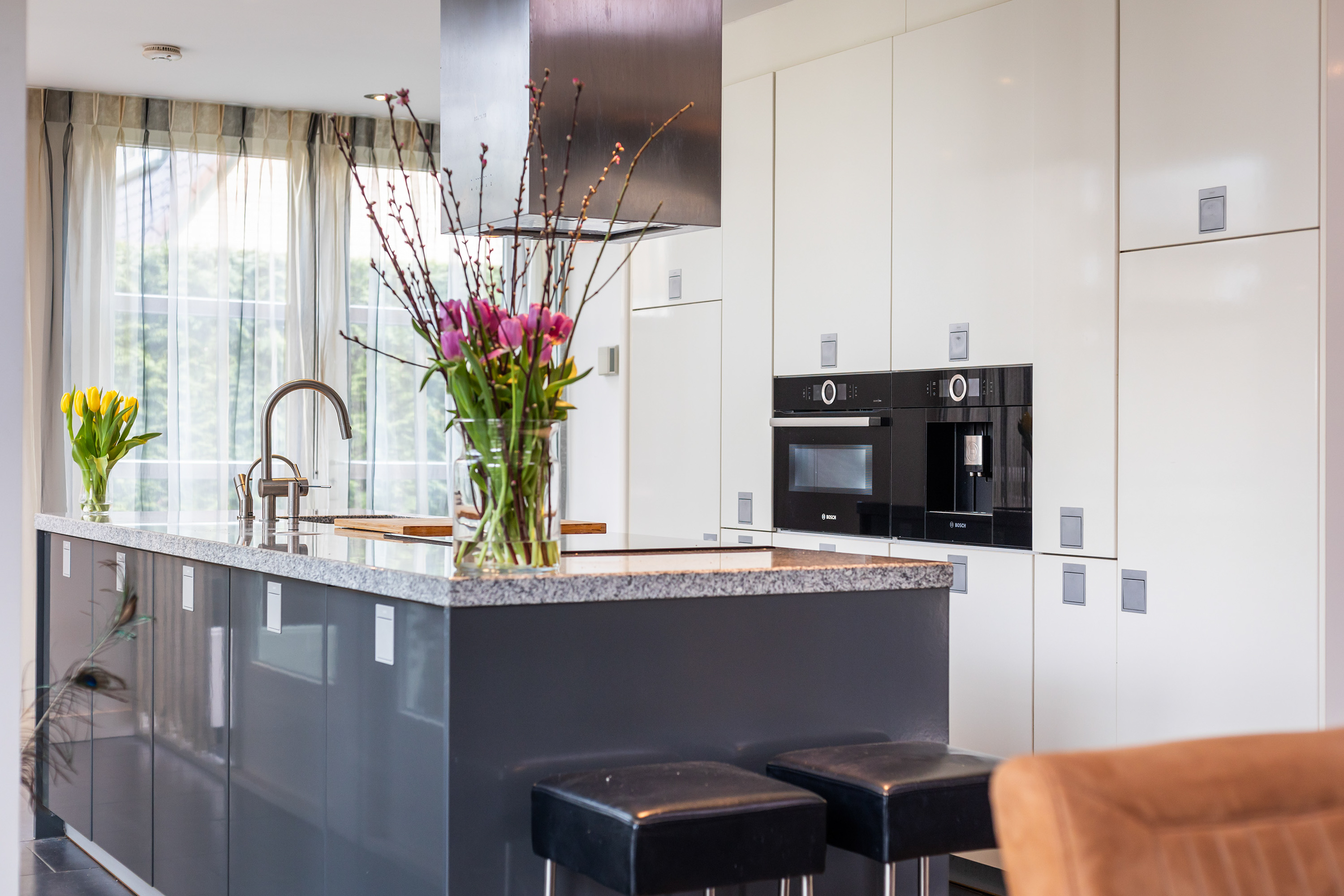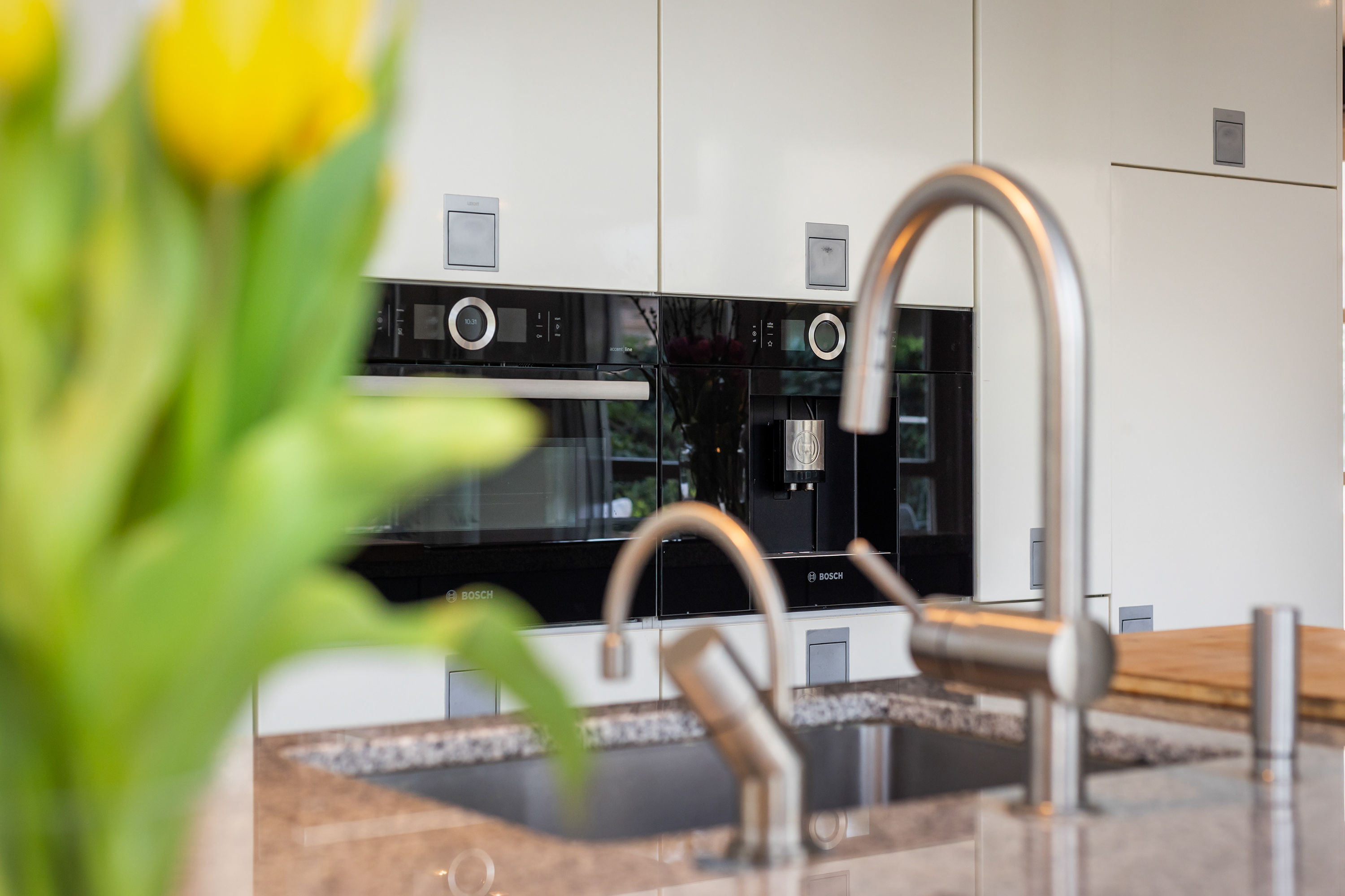 The kitchen forms the heart of the home and offers ample space for a large dining table. A gas fireplace and a roof lantern provide additional atmosphere and natural light. Double doors open onto the garden, while a single door provides access to the veranda. The high-end Leicht kitchen is finished in gloss white and grey, with a granite worktop and fitted with premium appliances including a coffee machine, combination oven, dishwasher, refrigerator, induction hob with stainless steel extractor hood and a Quooker tap.