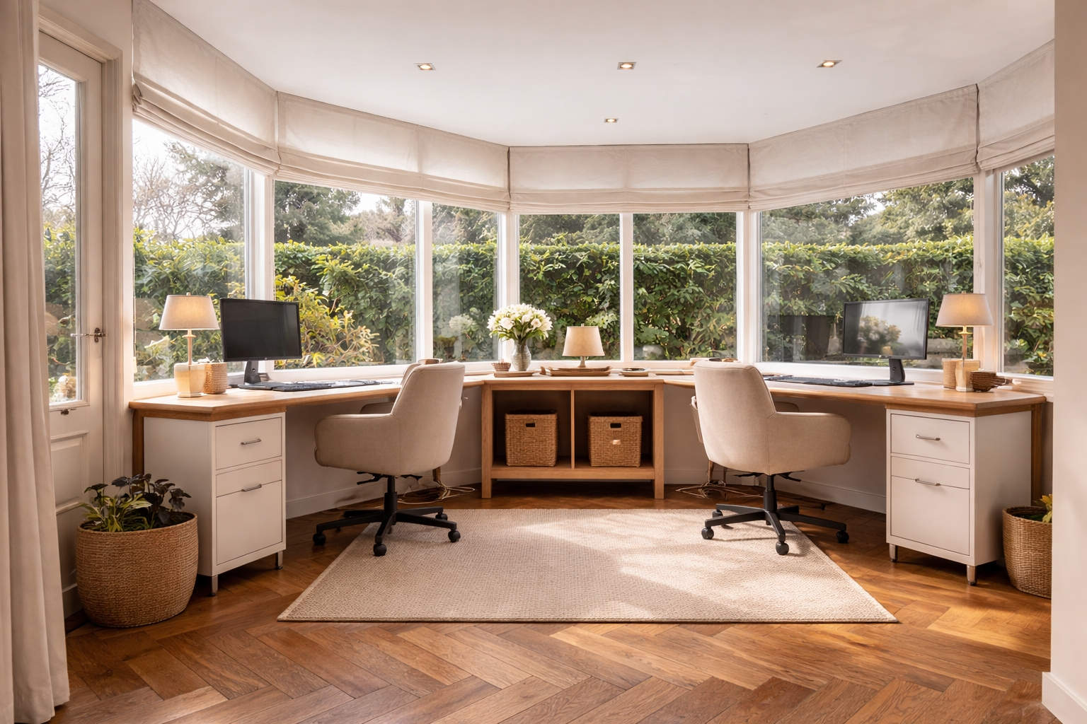 To the left is a second, rounded conservatory, currently arranged as a generous home office with a double workspace and direct access to the garden.