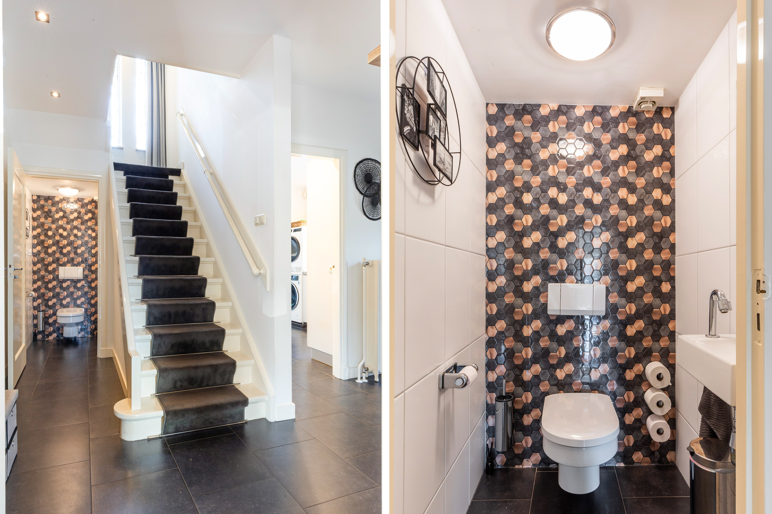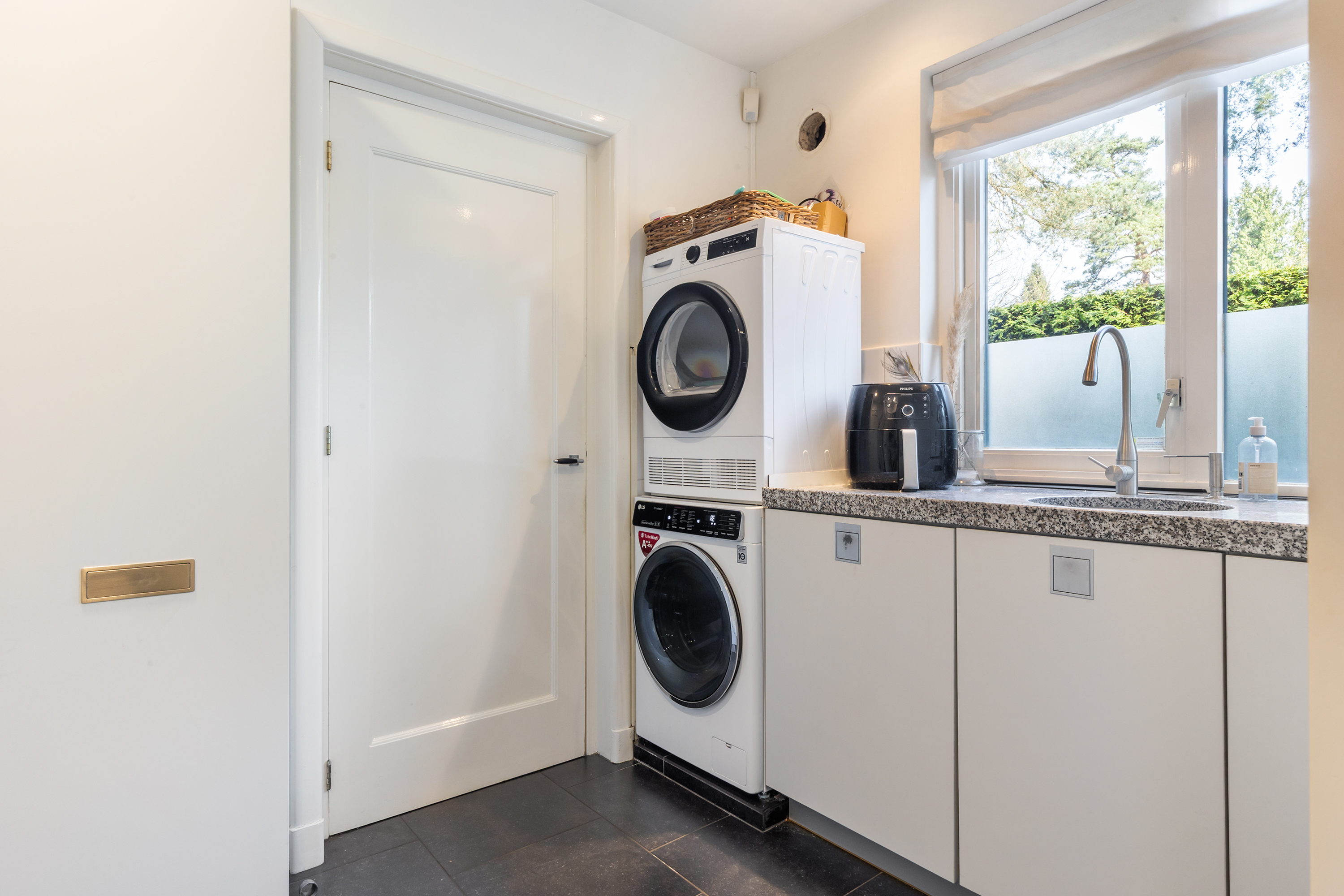 Adjacent is the utility room, featuring a pantry in the same style, connections for laundry appliances and access to the cellar and the entrance. The kitchen, utility room and entrance area are finished with Belgian bluestone floor tiles. A modern guest toilet is accessible from the hallway.